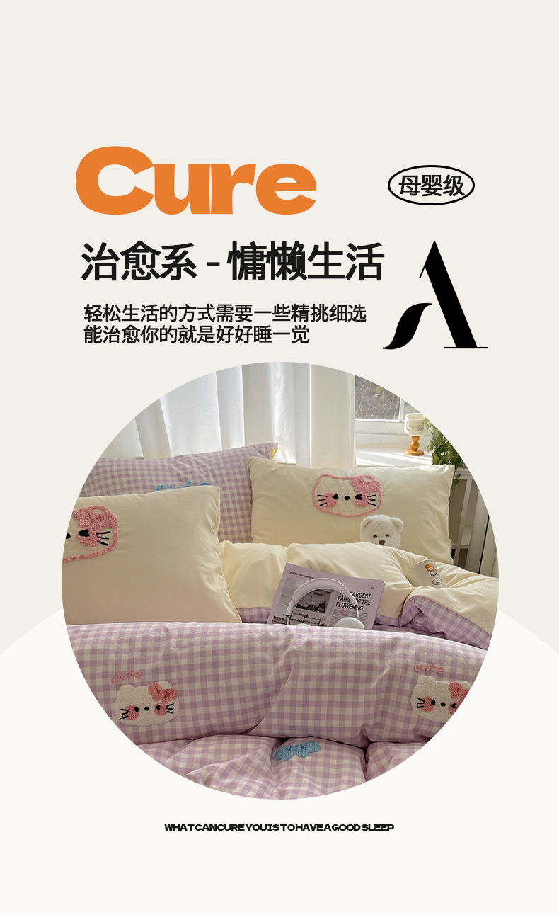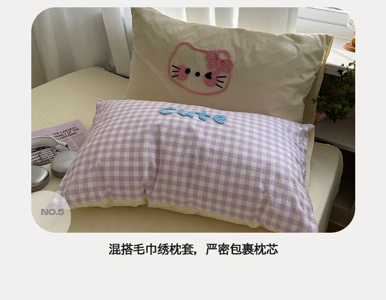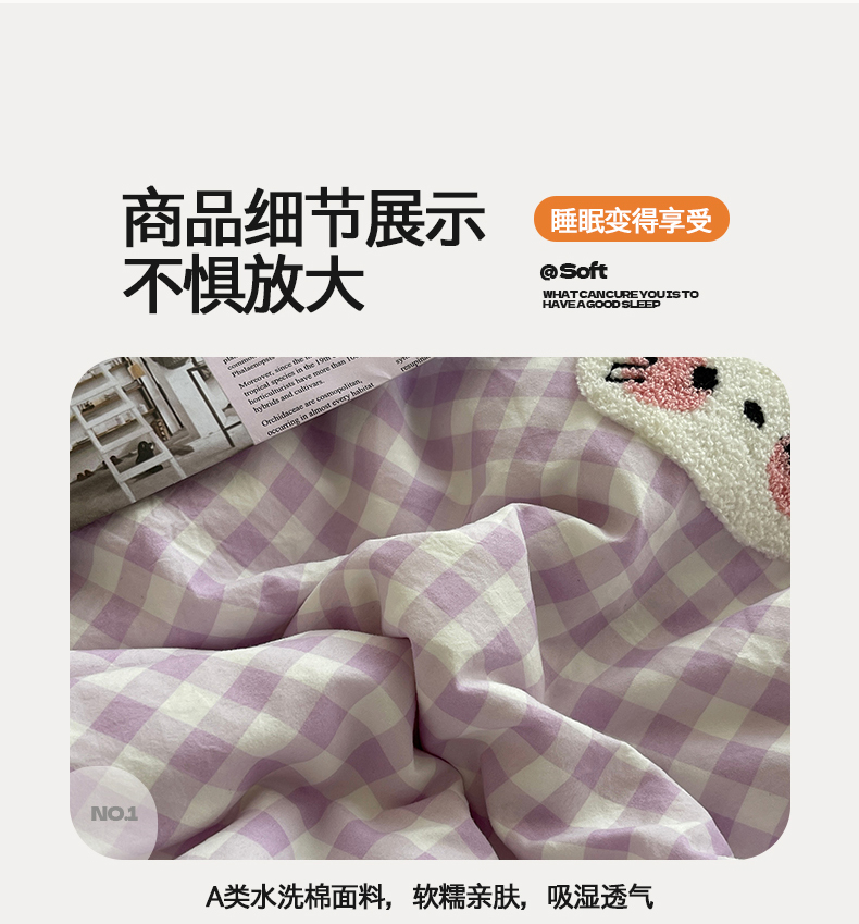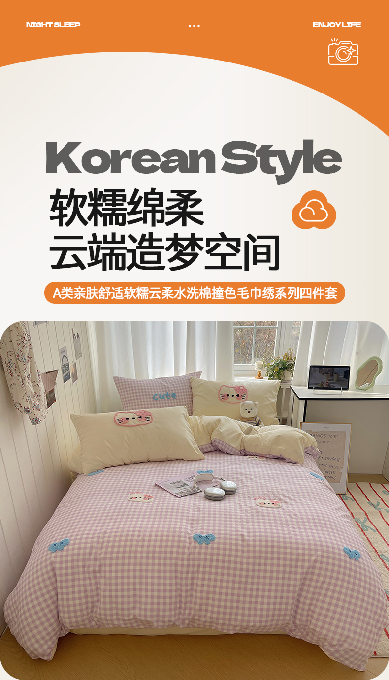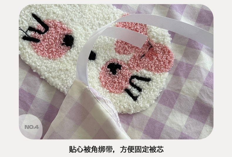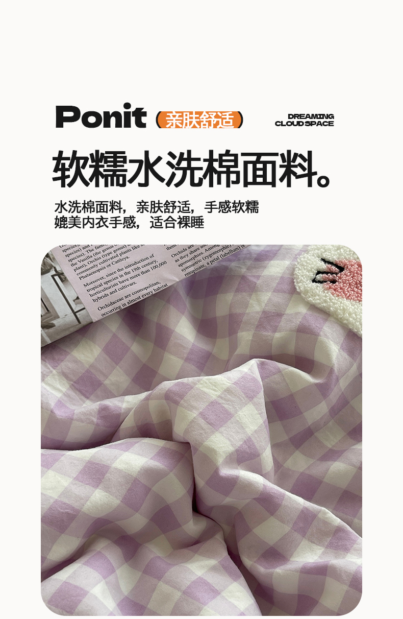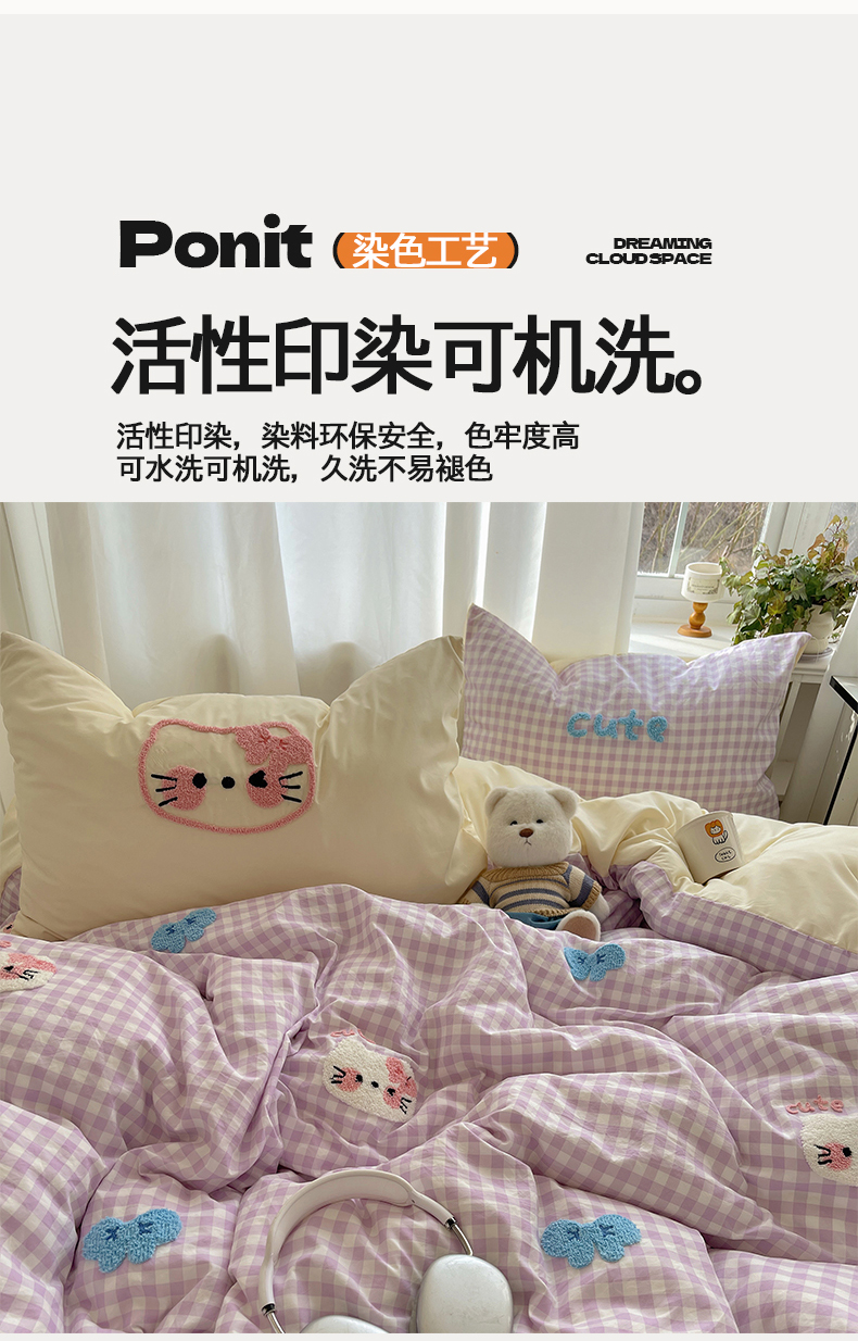当前位置: 91家纺网 > 商品网购 > 床品套件 > 四件套 > 水洗棉四件套 > 桃心家居 2025新款A类亲肤舒适软糯云柔水洗棉奶油格子撞色毛巾绣猫咪蝴蝶结水洗棉系列四件套 云柔水洗棉-蝴蝶结猫咪紫黄