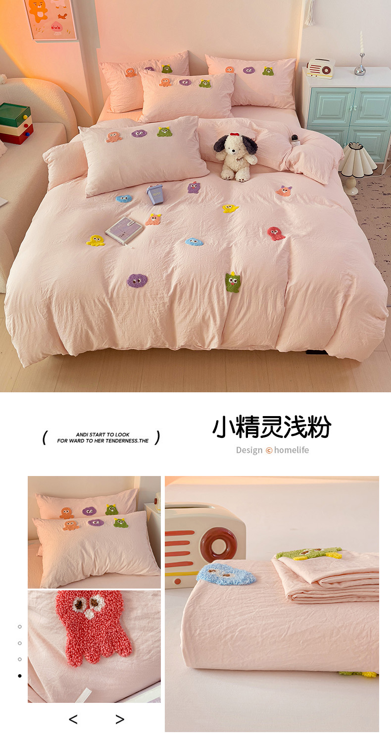 当前位置: 91家纺网 > 商品网购 > 床品套件 > 四件套 > 毛巾绣四件套 > 韩巢家纺 2025超柔水洗棉毛巾绣床上用品四件套-小精灵系列(提供卖家秀 ) 小精灵浅粉