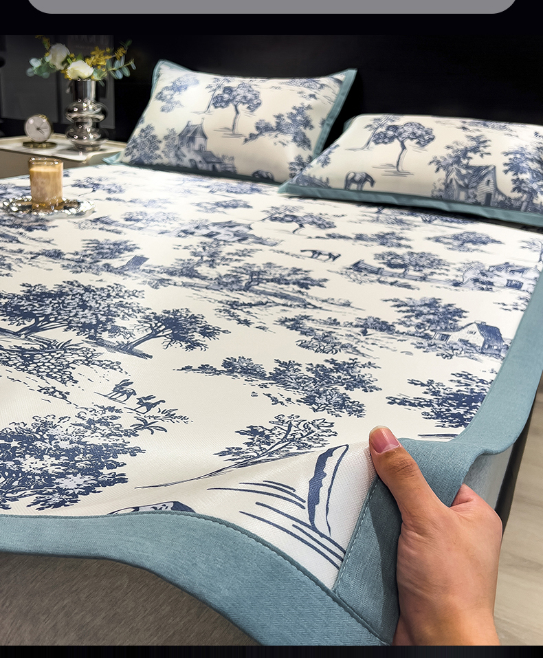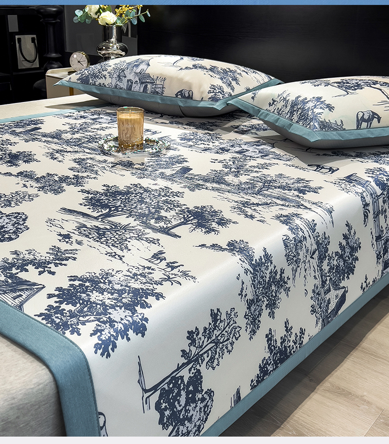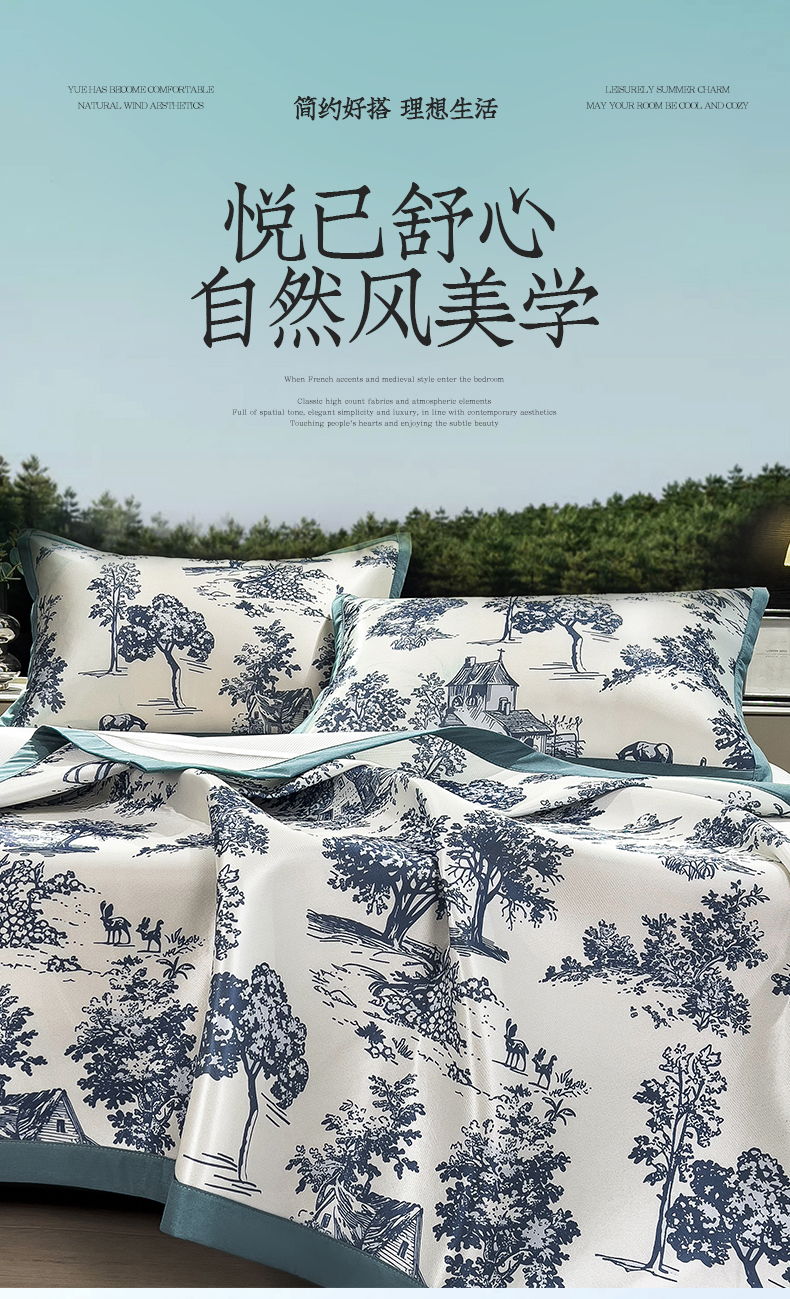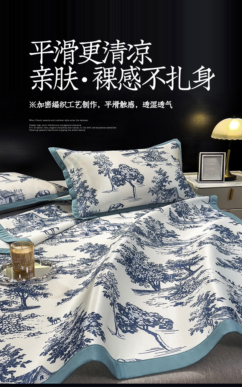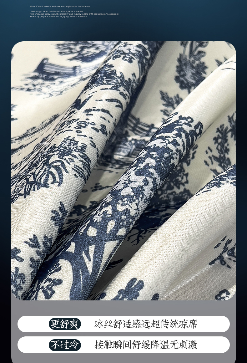 商品名称:兄弟坊 2025新款新中式花卉印花冰丝席 庄园画图-蓝