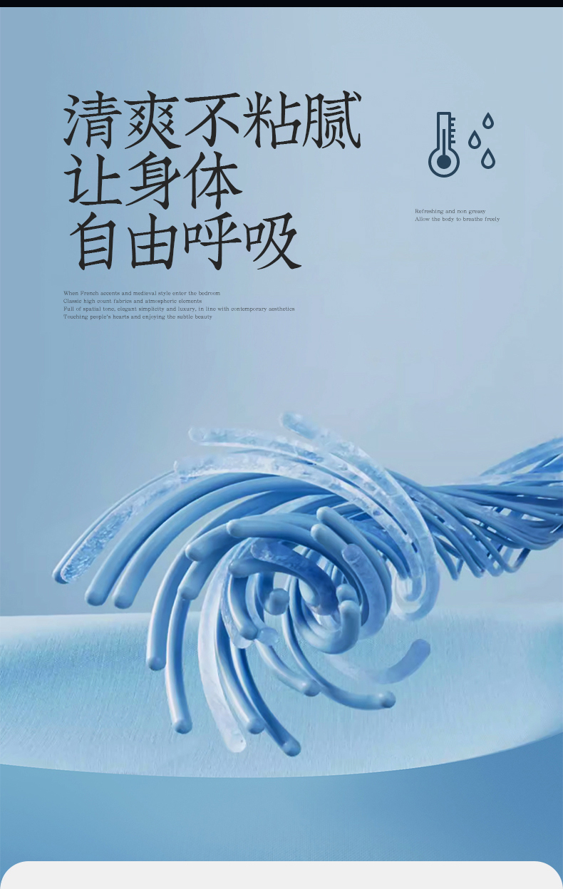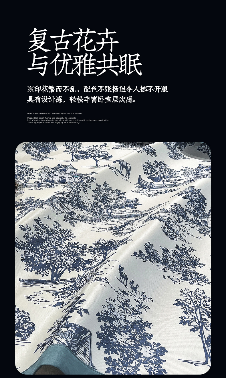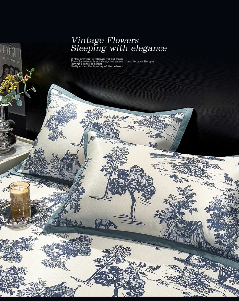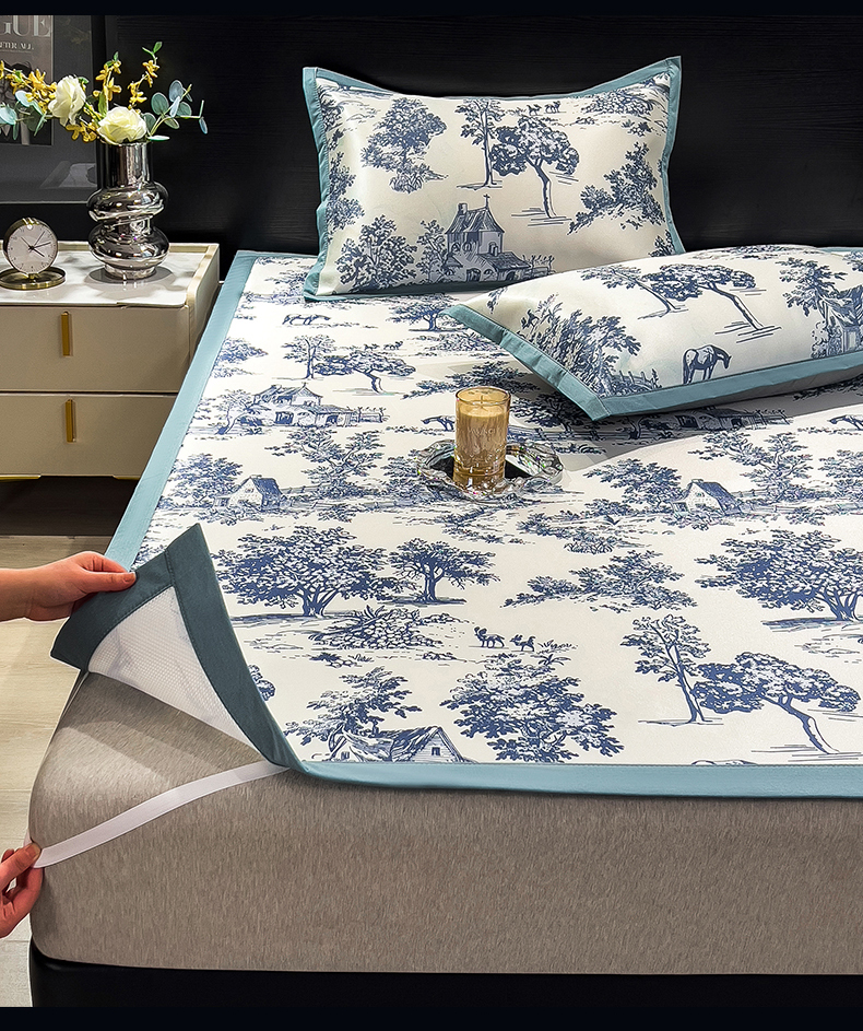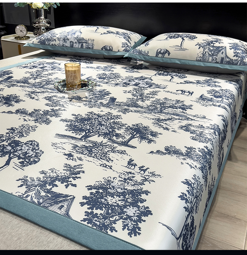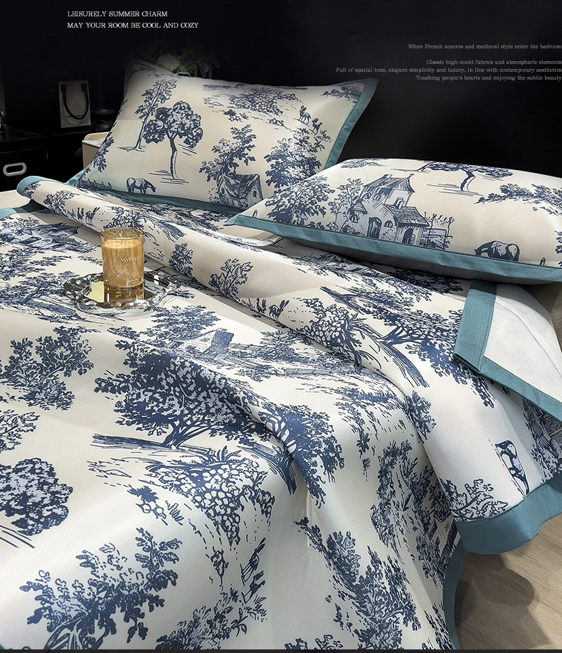 商品名称:兄弟坊 2025新款新中式花卉印花冰丝席 庄园画图-蓝