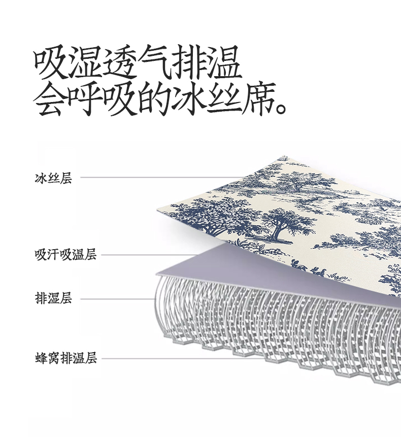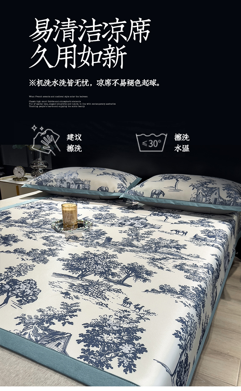 兄弟坊 2025新款新中式花卉印花冰丝席 庄园画图-蓝
