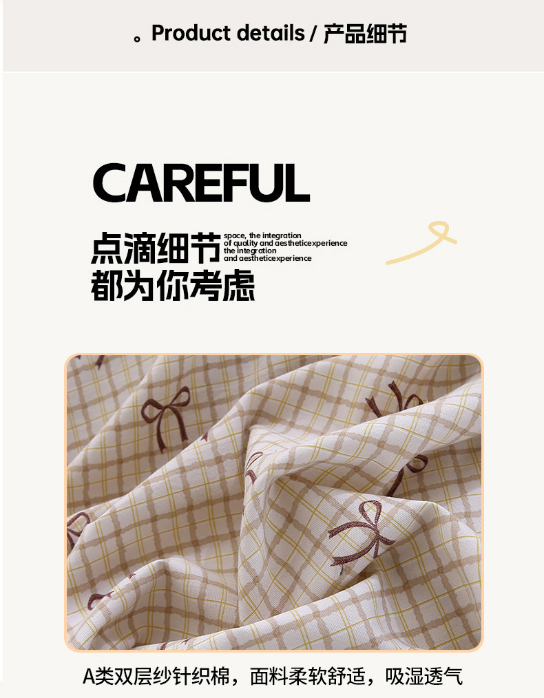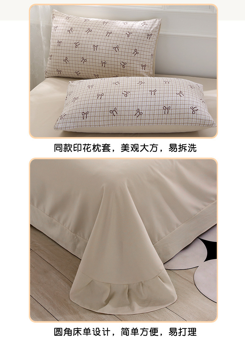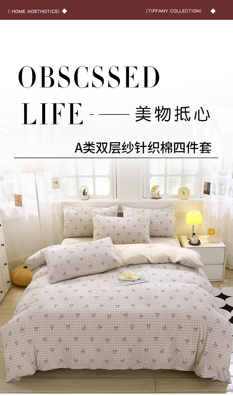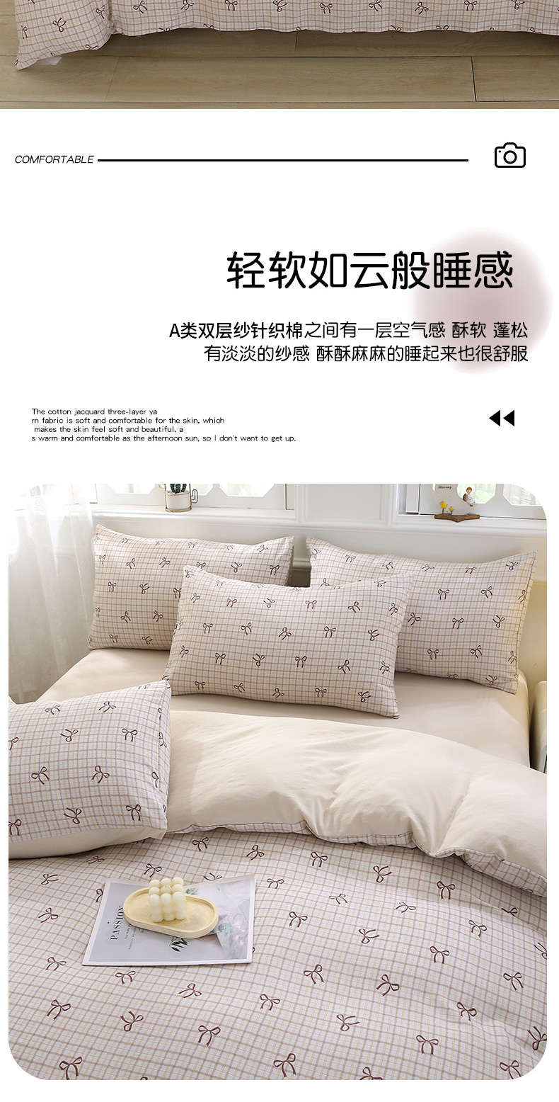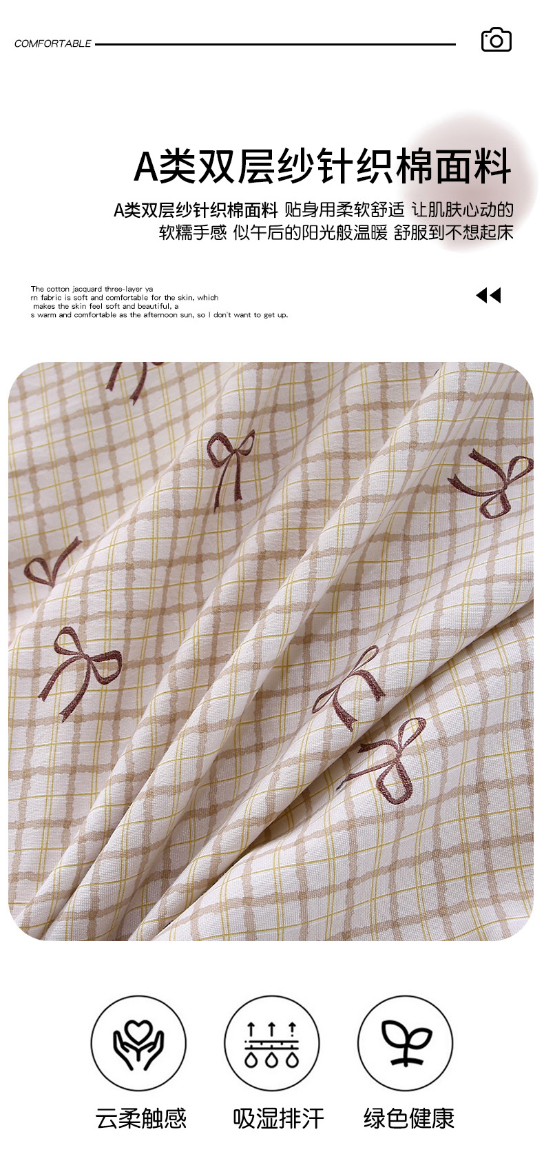 商品名称:织写 2025新款A类双层纱针织棉四件套床单四件套床单四件套小清新四件套 蝴蝶结-咖