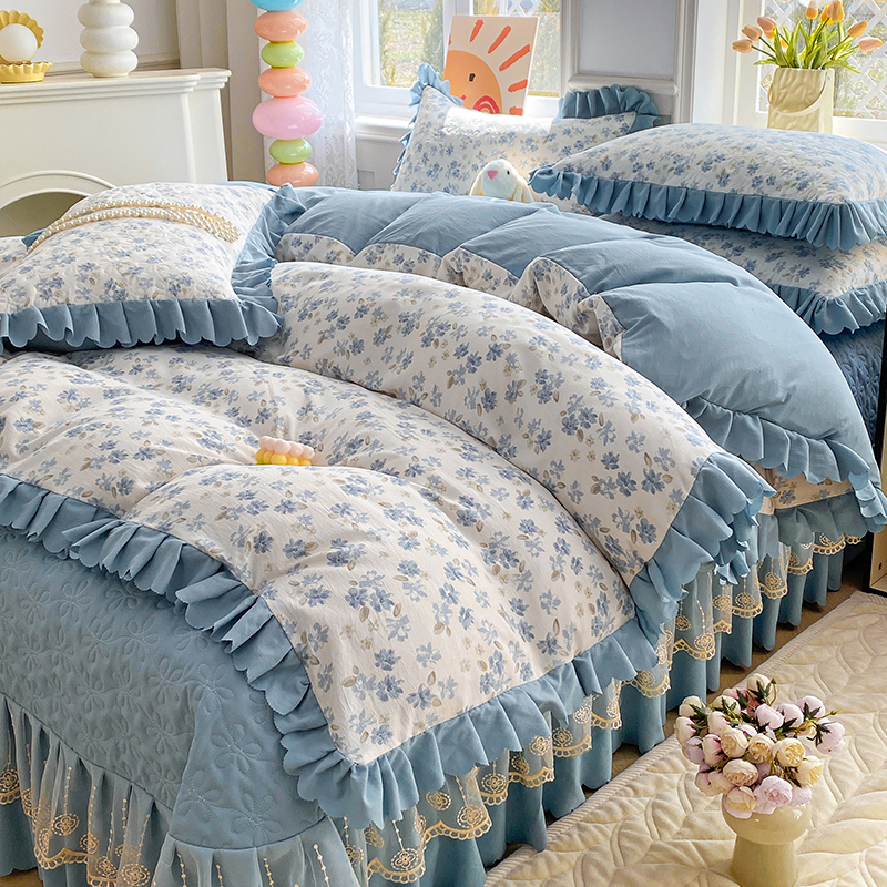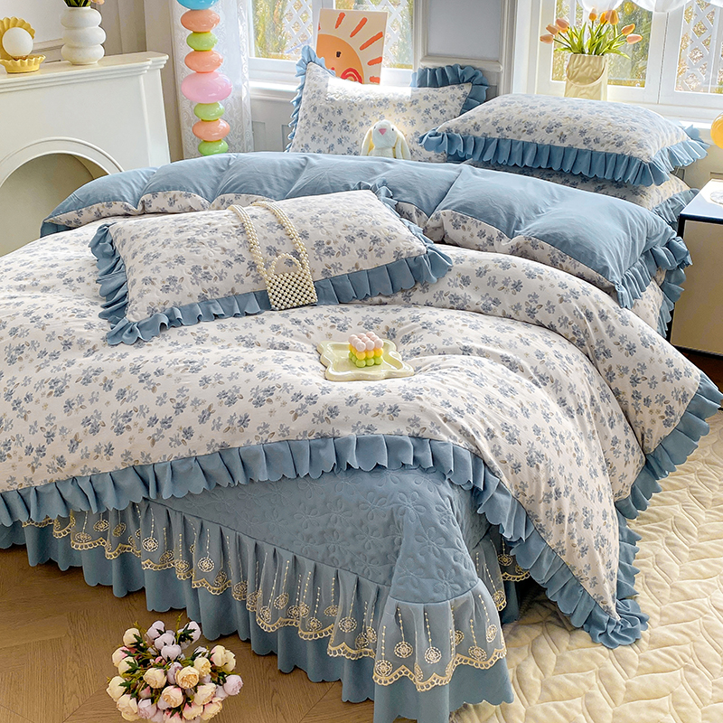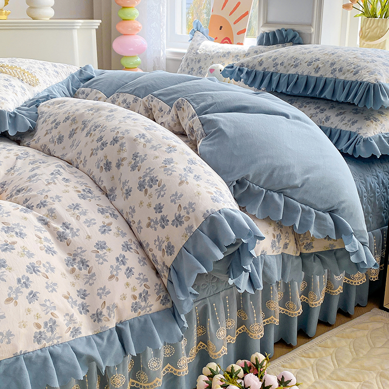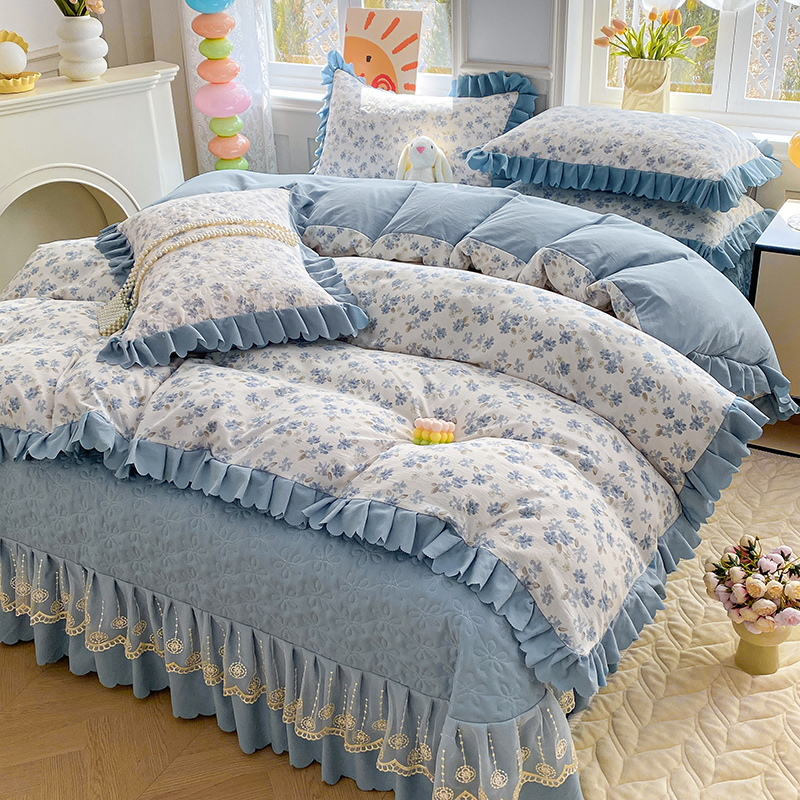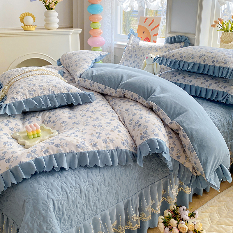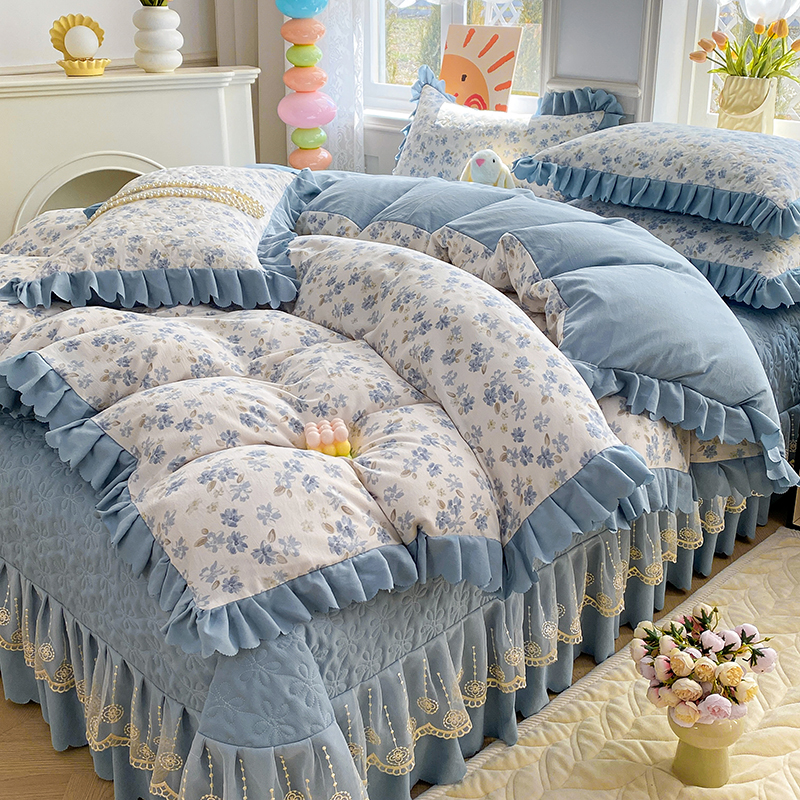 提花大世界 2025直播热款A类针织棉双层纱夹棉床盖床裙花边单件三件四件套 畅游花海