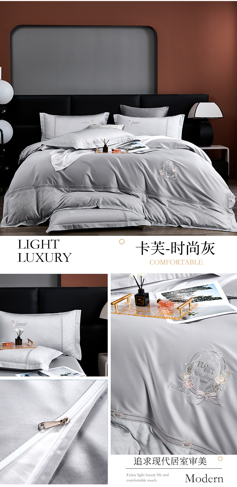 商品名称:2025新款120S60支双股贡缎长绒棉刺绣花四件套纯棉全棉100%棉轻奢时尚 卡芙-时尚灰