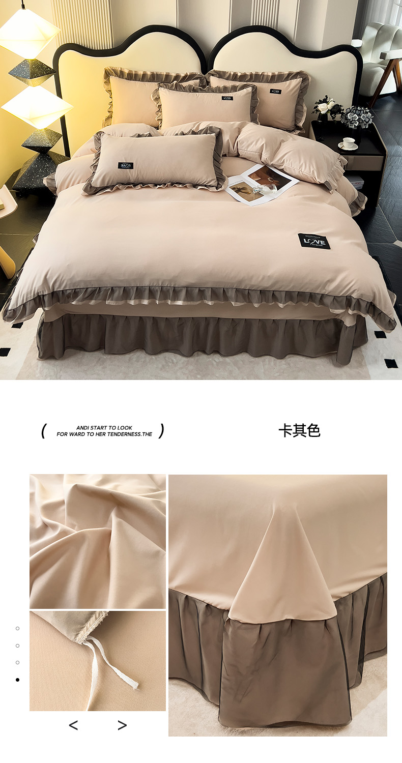 找底底2023新款230g牛奶绒法莱绒刺绣蕾丝边床裙款四件套,豆沙色,橘橙色,玛卡蓝,嫩黄,浅粉色,雾紫,质感灰