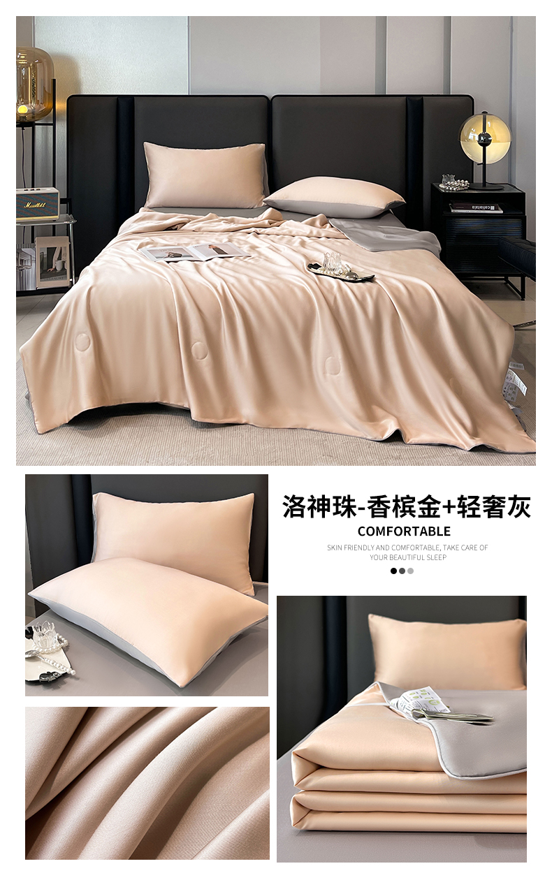 • 91家纺网 家纺一手货源 找家纺 雯豆天丝夏被纯色拼色A类莱赛尔凉感被子轻奢夏凉被子四件套 洛神珠-香槟金+轻奢灰