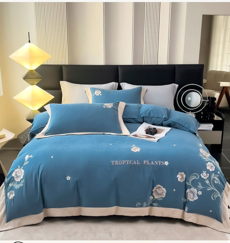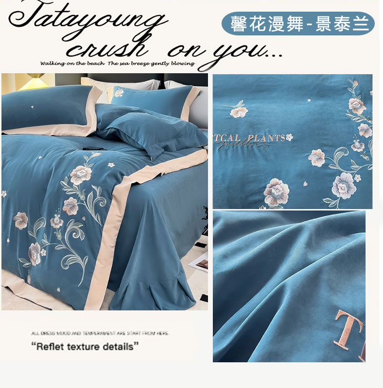 商品名称:曲之慕 2025新品四季款高端刺绣四件套简约可水洗轻奢纯色刺绣四件套 馨花漫舞景泰兰