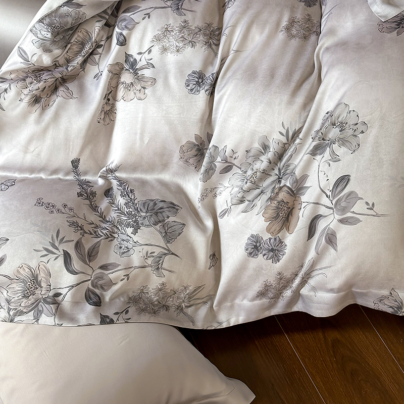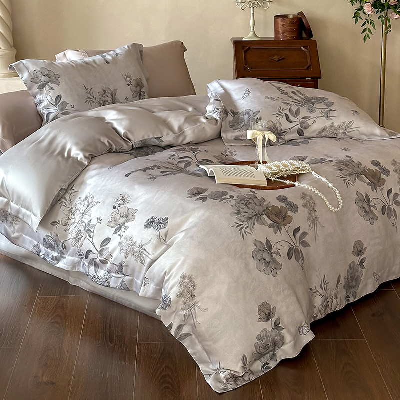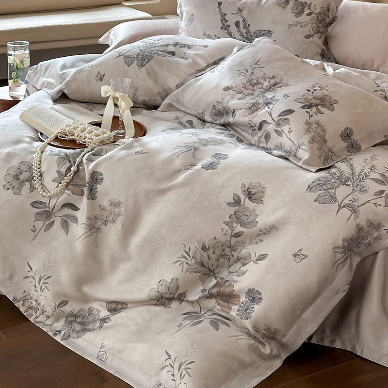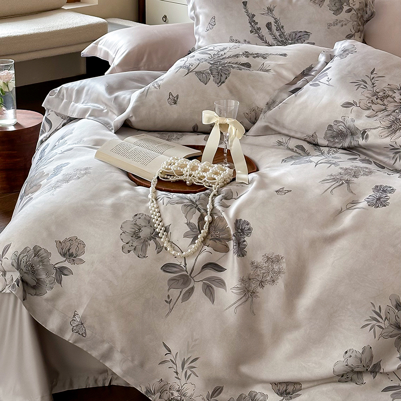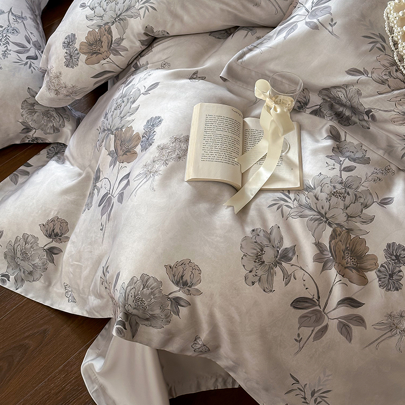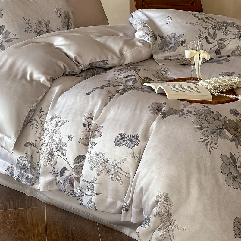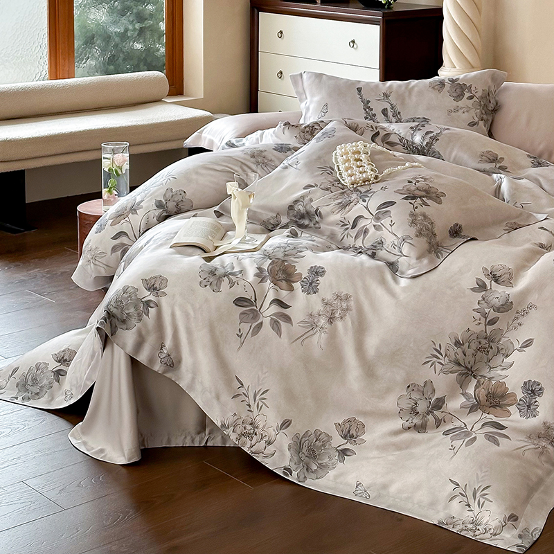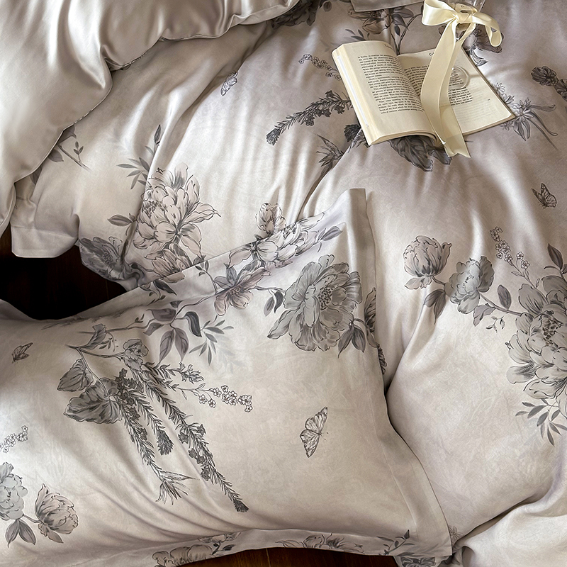 (总)2025春夏新品数码印花60兰精天丝宽边工艺款四件套,奥菲娜-粉,奥菲娜-灰,莫丽花园-灰,楠风-咖,倾城-豆沙,倾城-灰,莫丽花园-紫