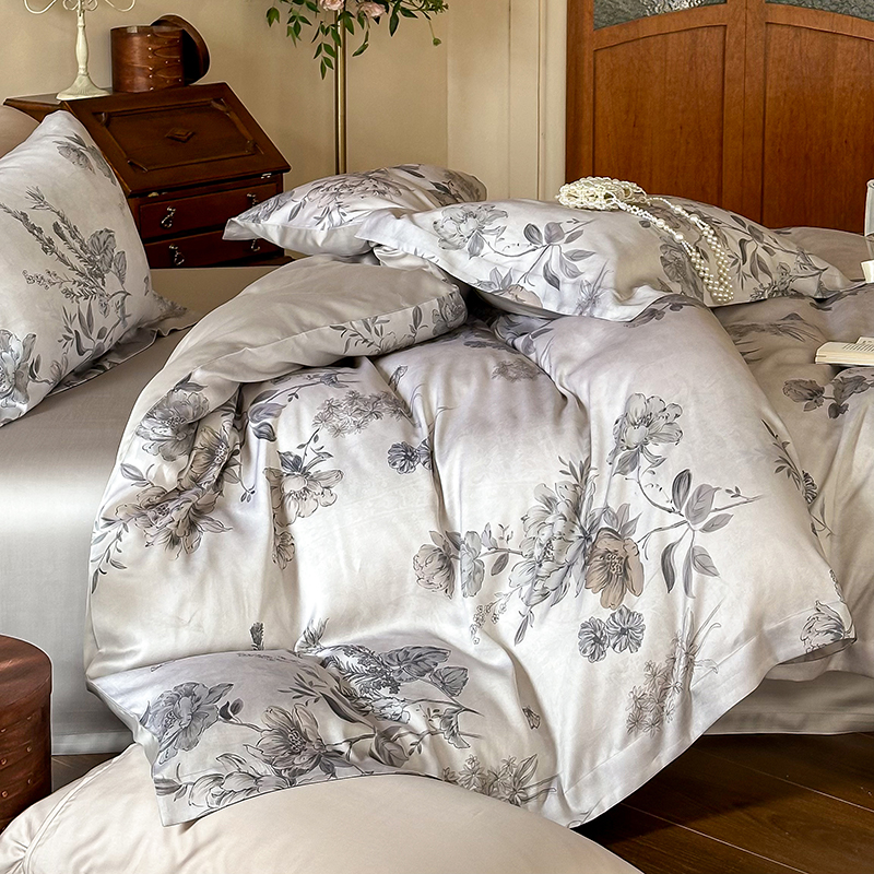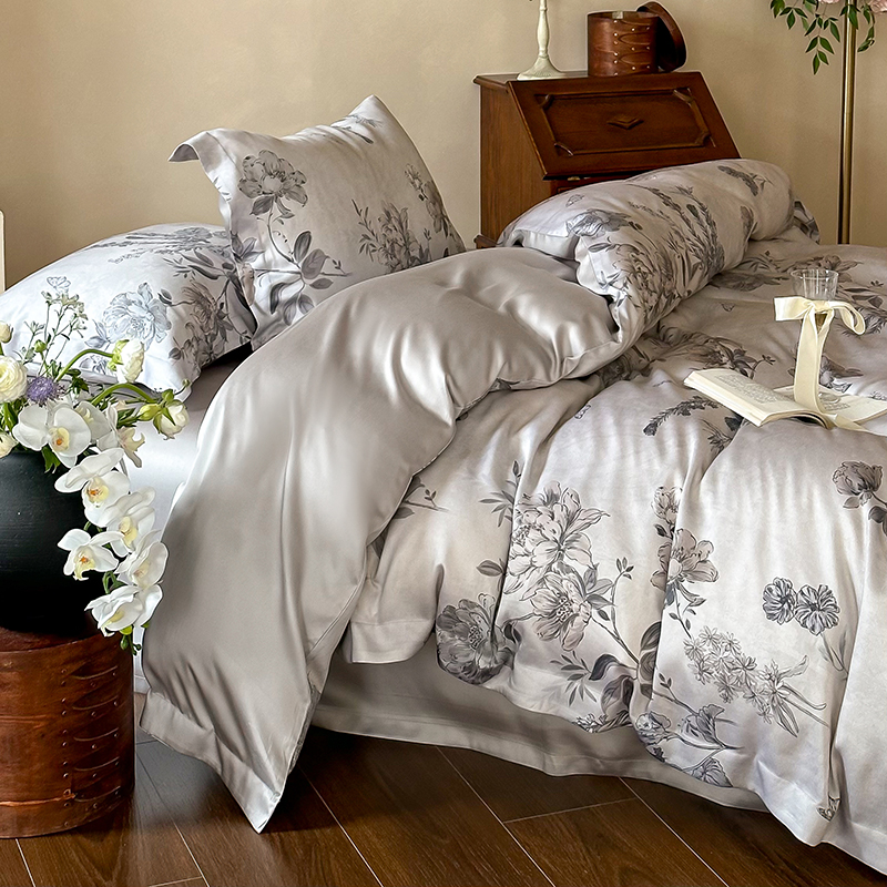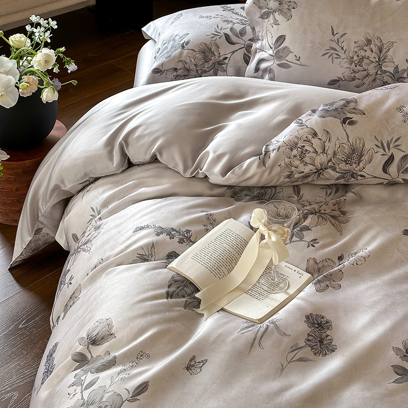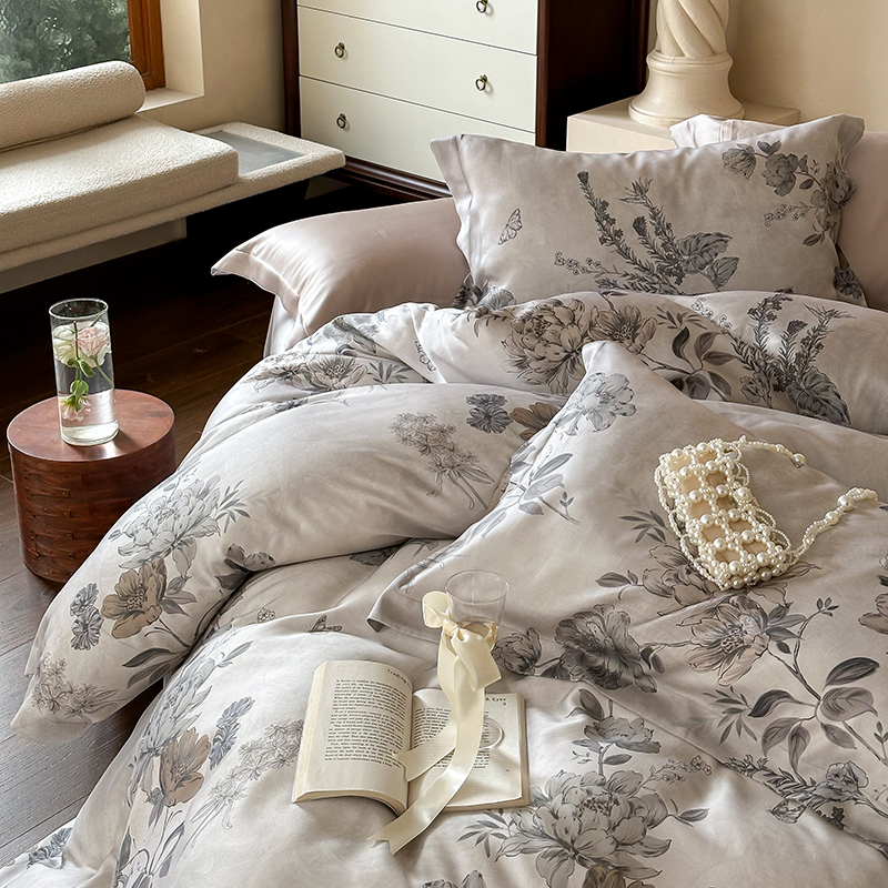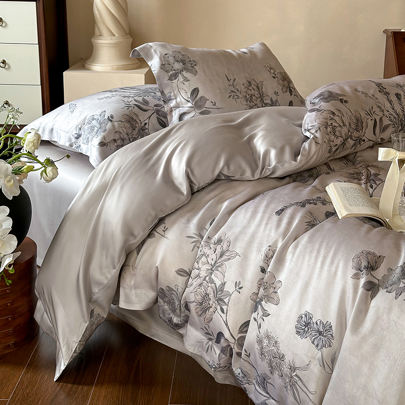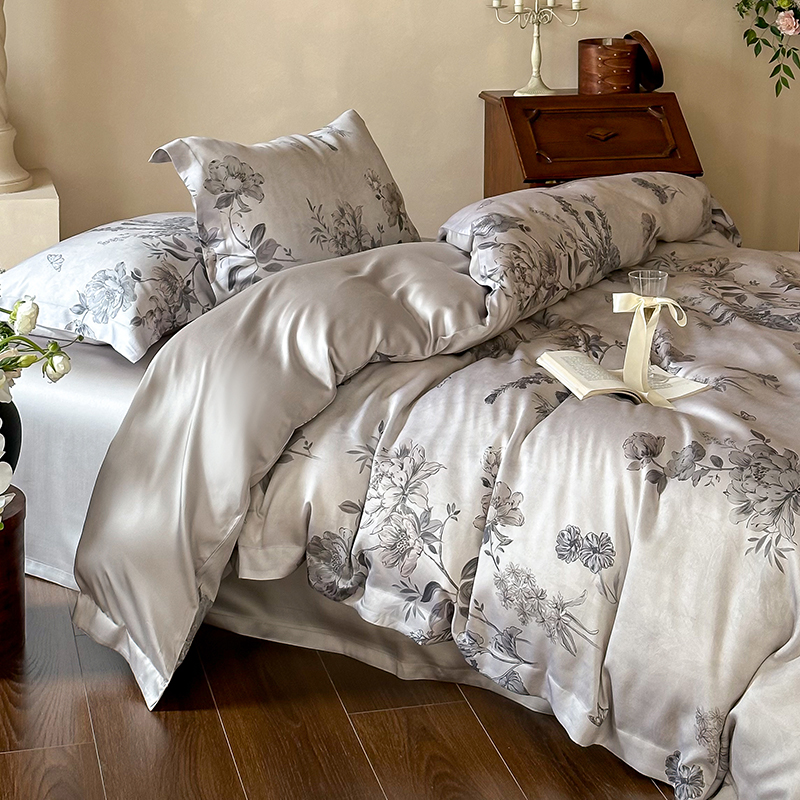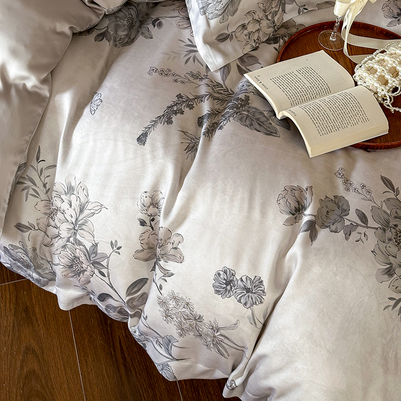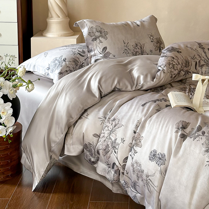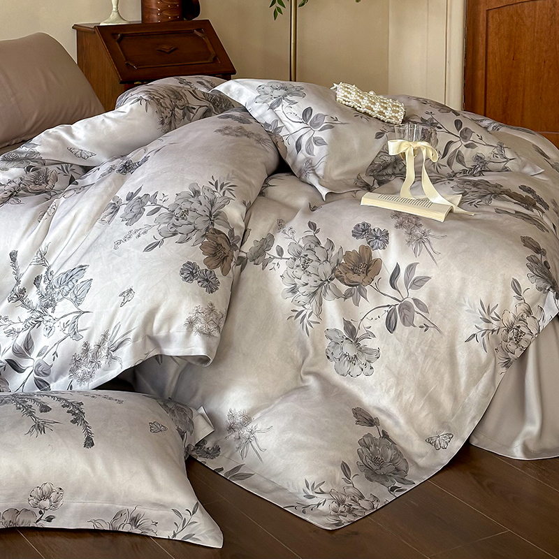 (总)2025春夏新品数码印花60兰精天丝宽边工艺款四件套,奥菲娜-粉,奥菲娜-灰,莫丽花园-灰,楠风-咖,倾城-豆沙,倾城-灰,莫丽花园-紫