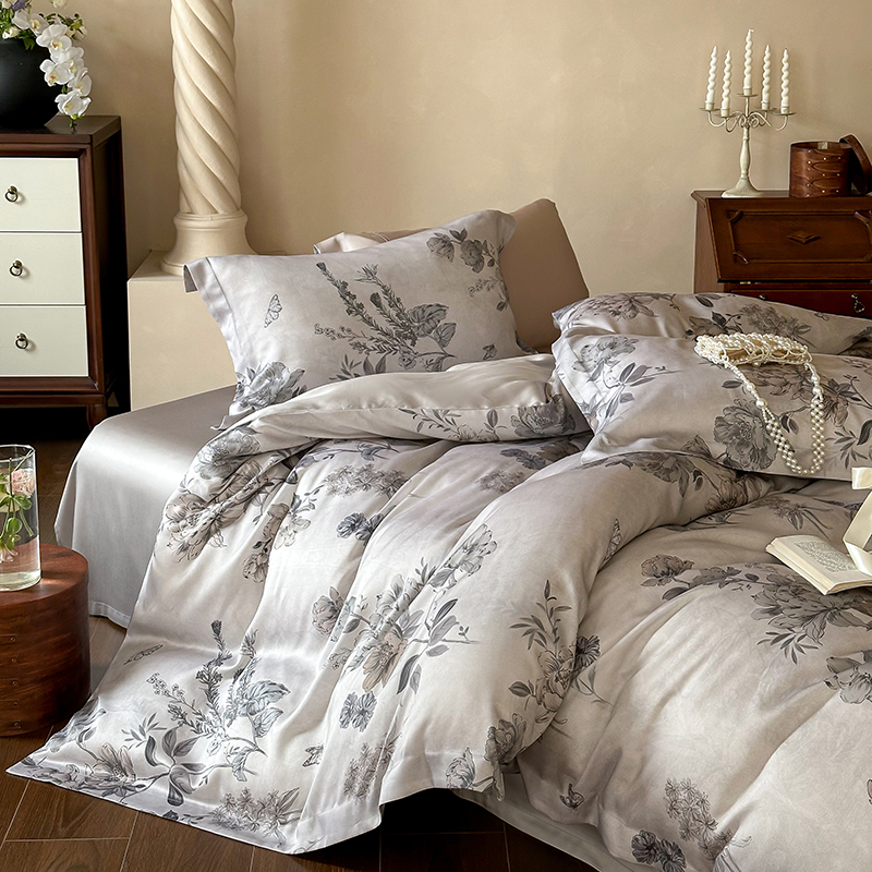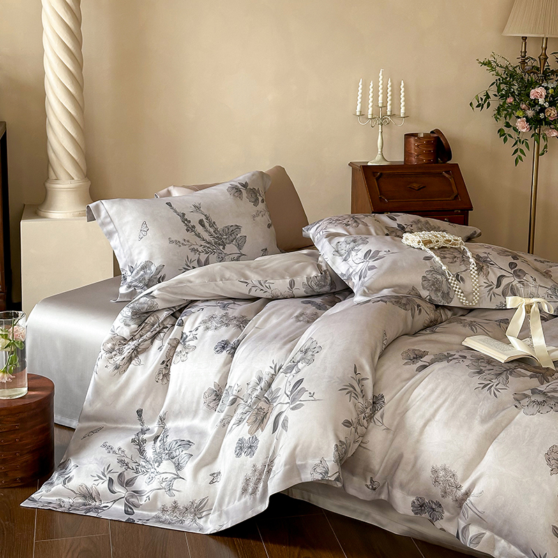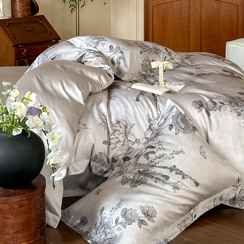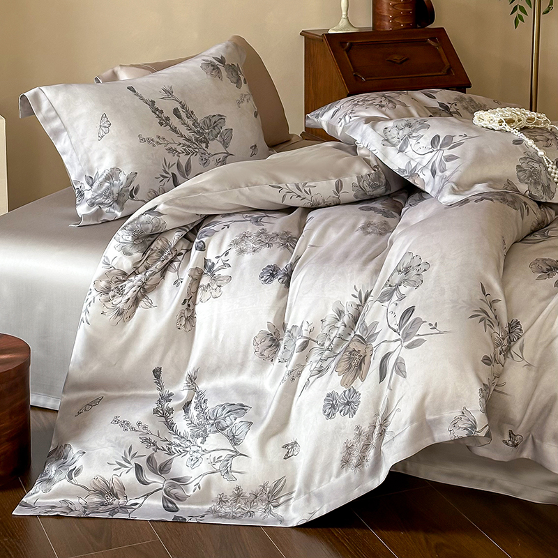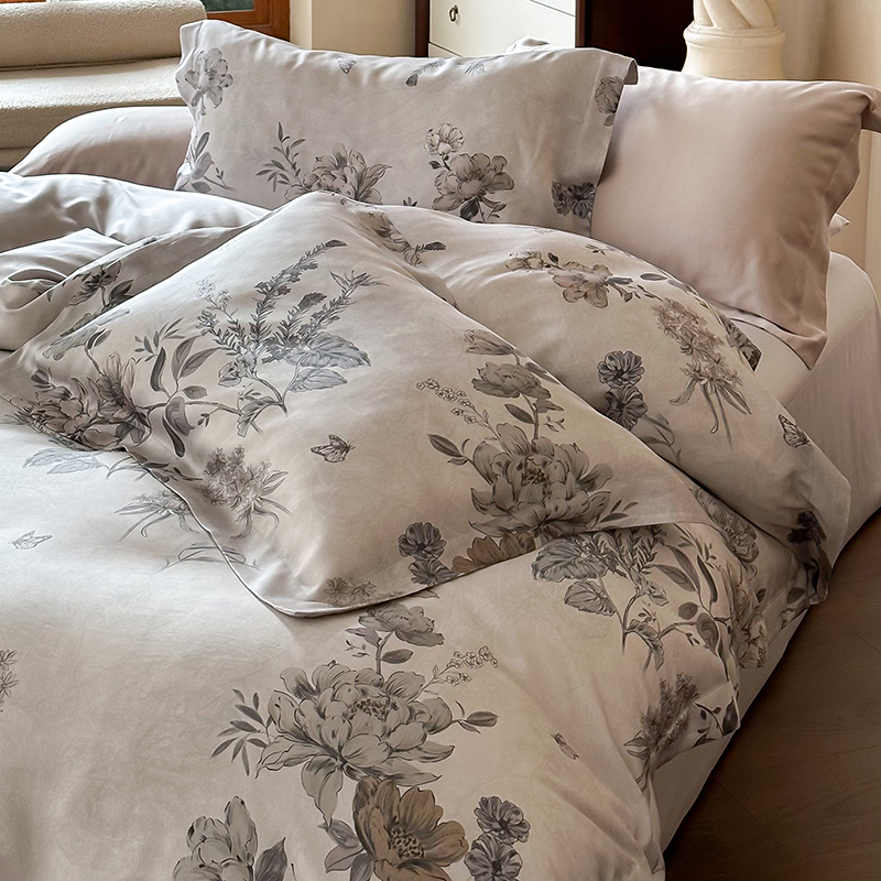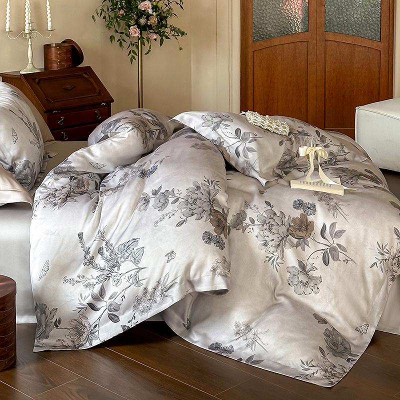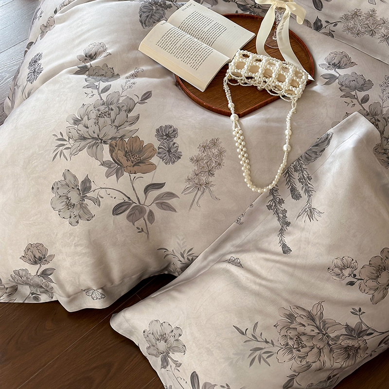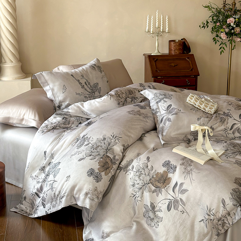 (总)2025春夏新品数码印花60兰精天丝宽边工艺款四件套,奥菲娜-粉,奥菲娜-灰,莫丽花园-灰,楠风-咖,倾城-豆沙,倾城-灰,莫丽花园-紫
