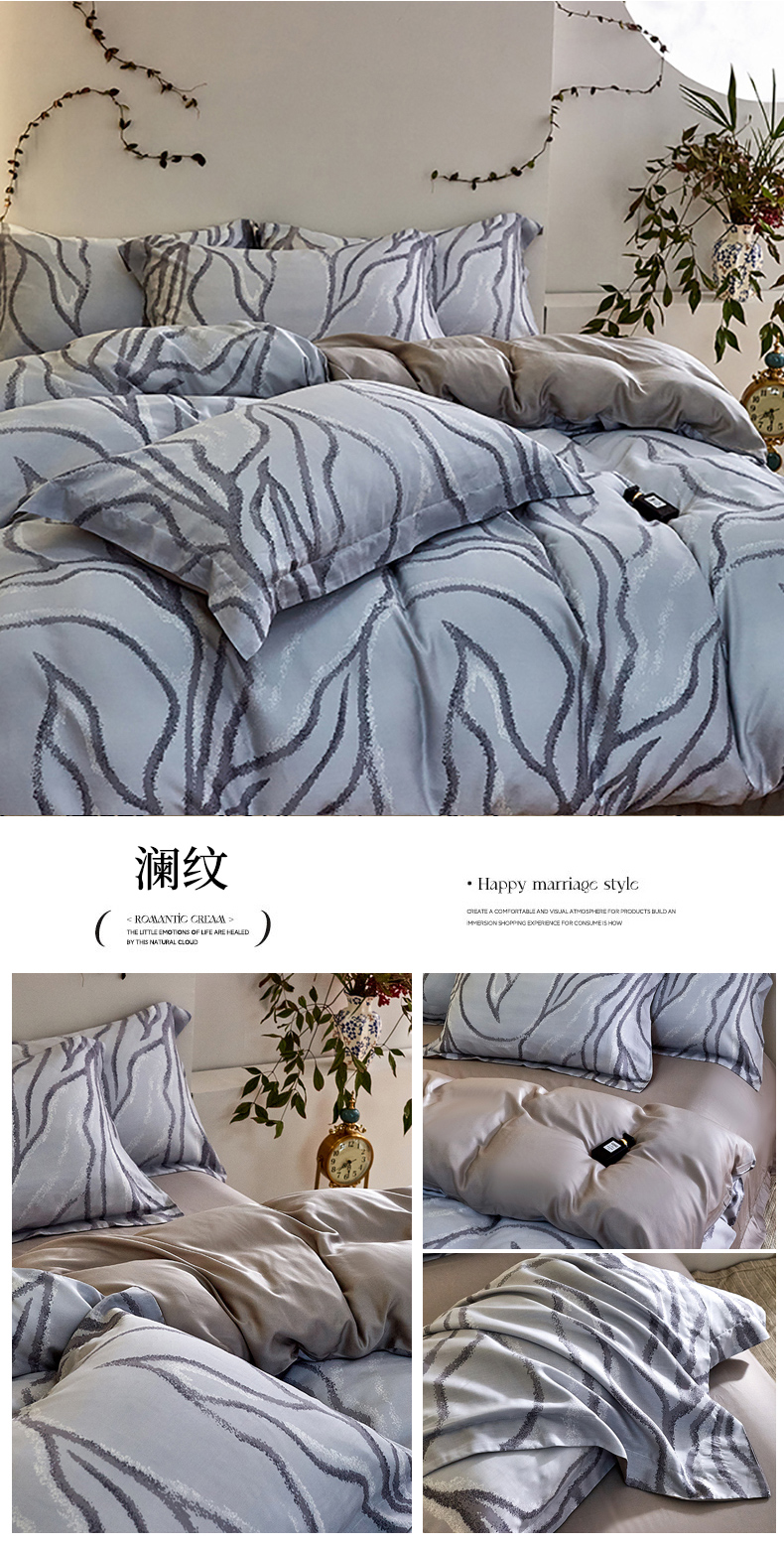 商品名称:未来家居 2025春夏新款100支莱赛尔天丝贡缎纯色印花系列高端礼盒四件套 澜纹