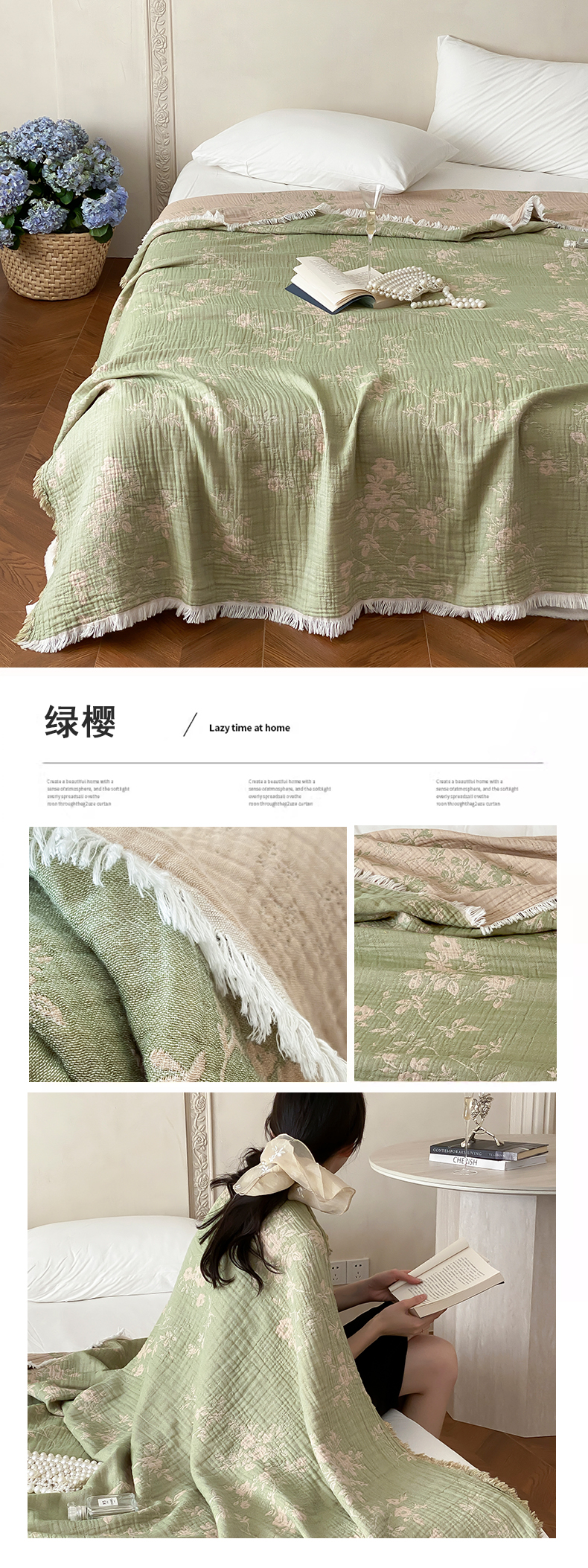 商品名称:麻依 2025新款全棉精细纱民宿纱布毯子四层 绿樱