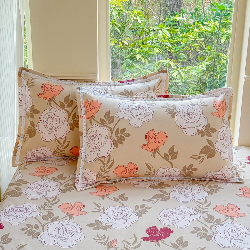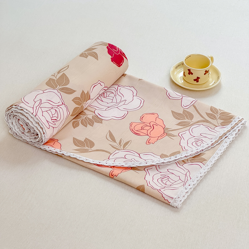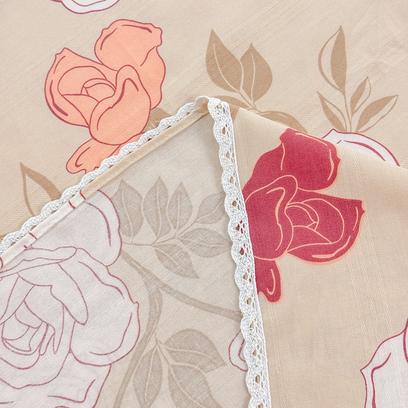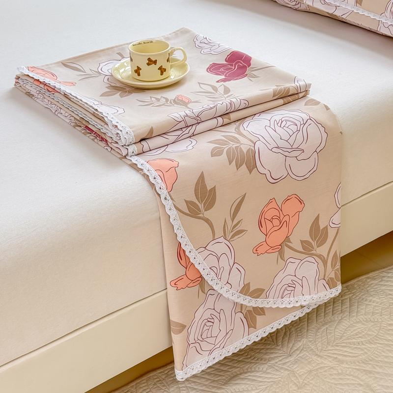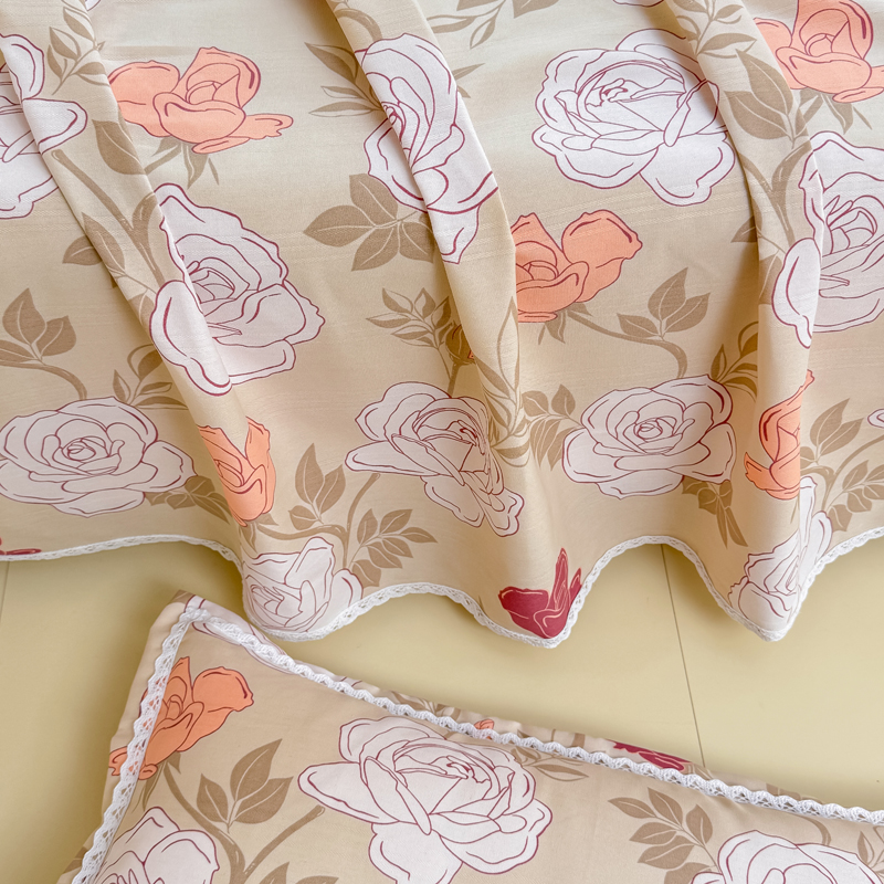 商品名称:宜家坊 2025新款春夏原棉鱼骨棉老粗布花边印花床单软凉席三件套 玫瑰