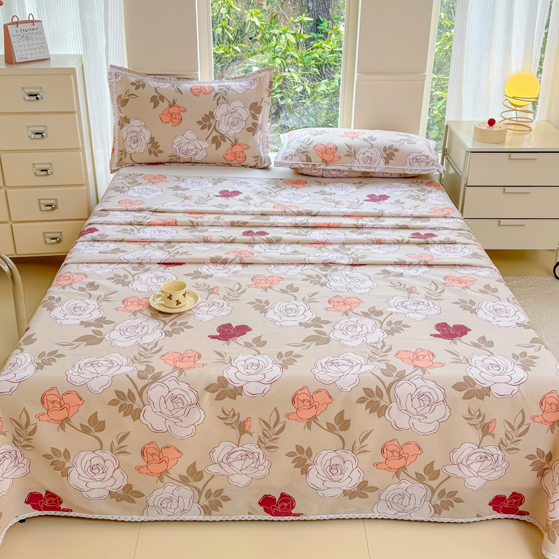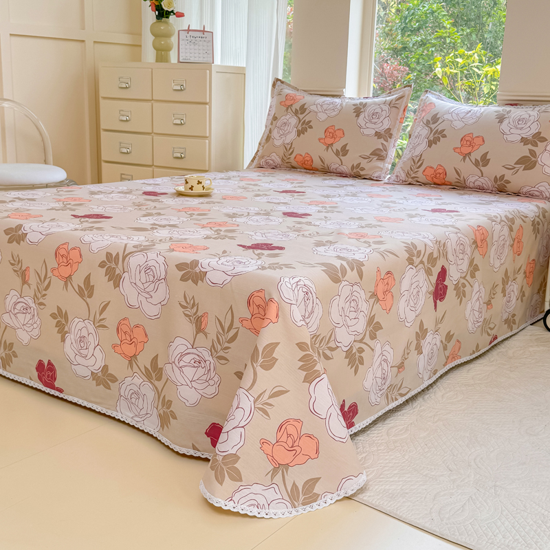 宜家坊 2025新款春夏原棉鱼骨棉老粗布花边印花床单软凉席三件套 玫瑰