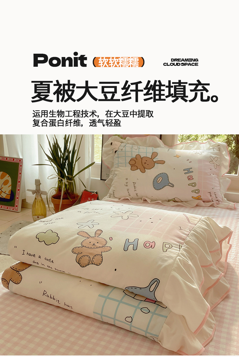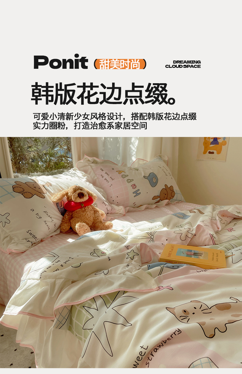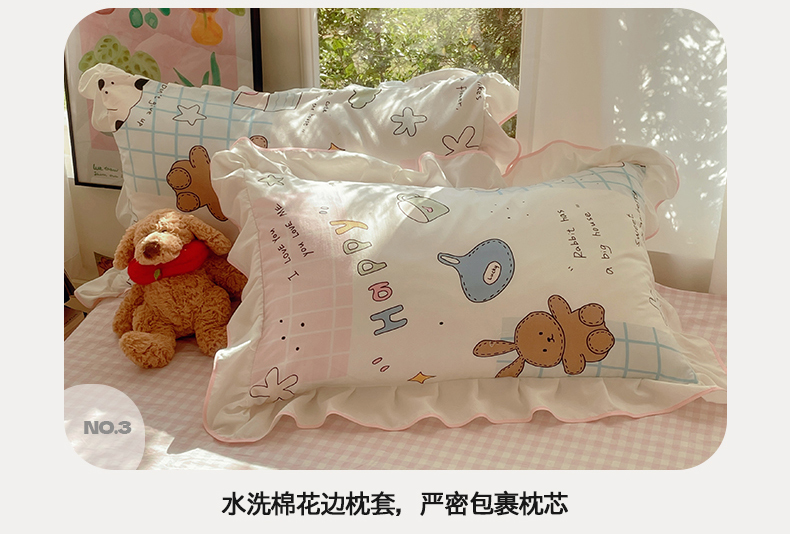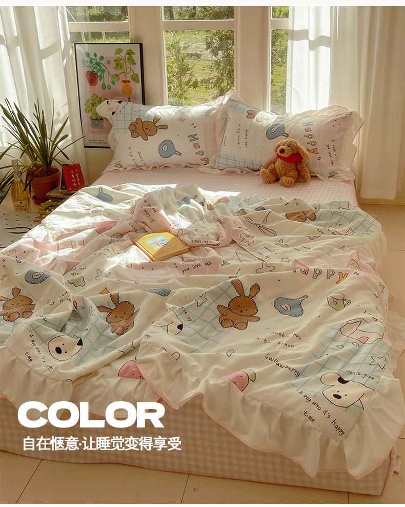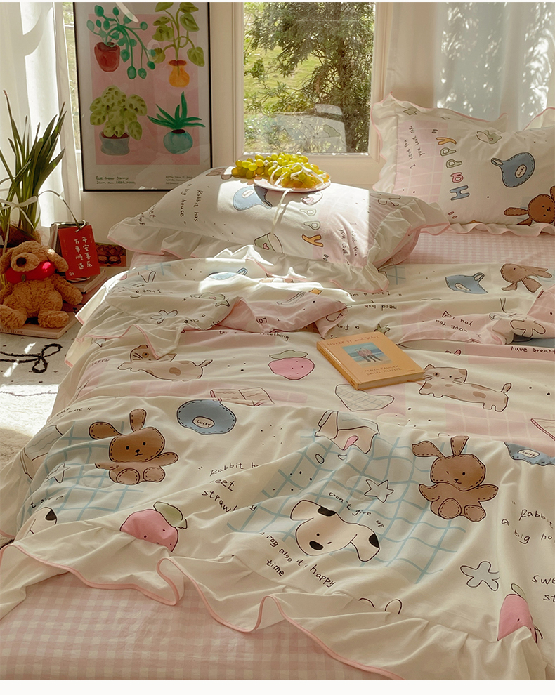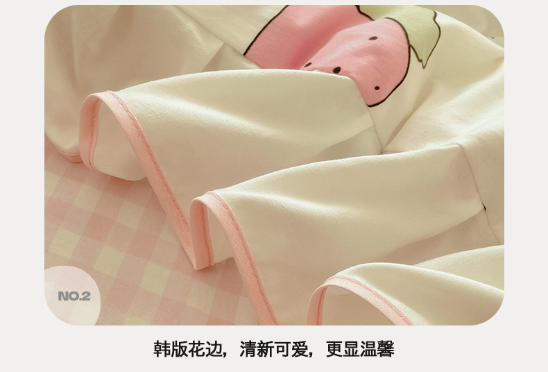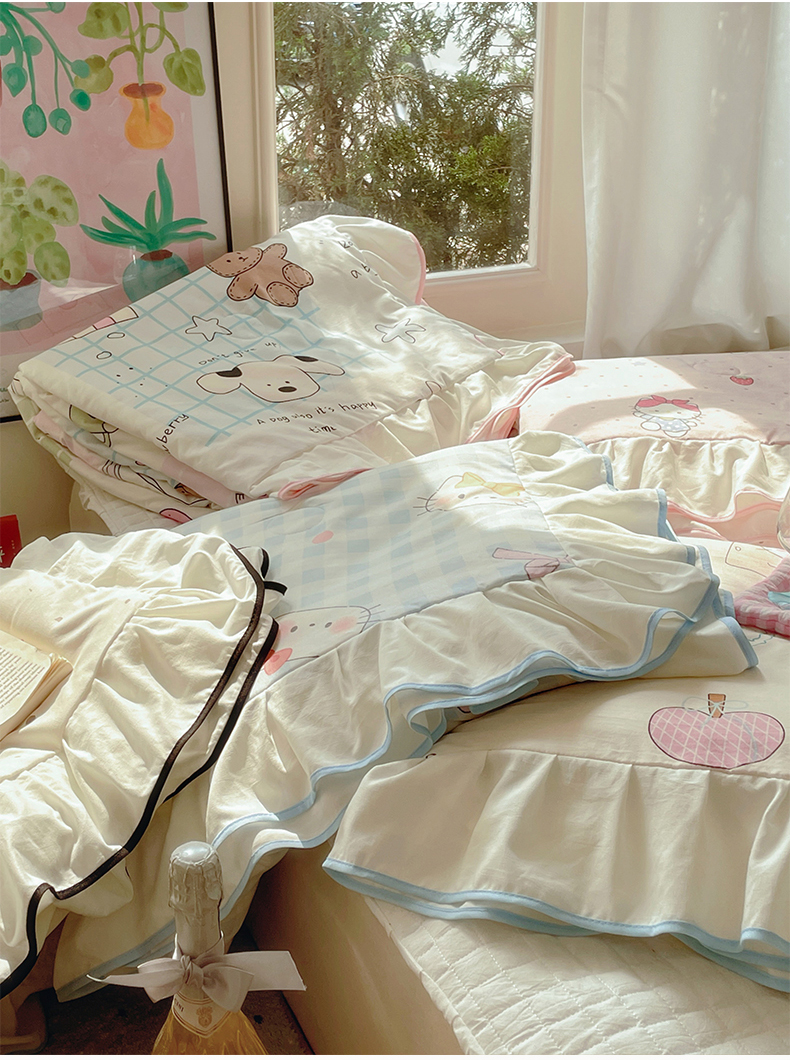 当前位置: 91家纺网 > 商品网购 > 床品套件 > 四件套 > 全棉普通四件套 > 桃心家居 2025新款A类云柔水洗棉花边韩版少女可爱仙仙大豆单夏被夏凉被空调被四件套 水洗棉花边-夏被卡哇伊