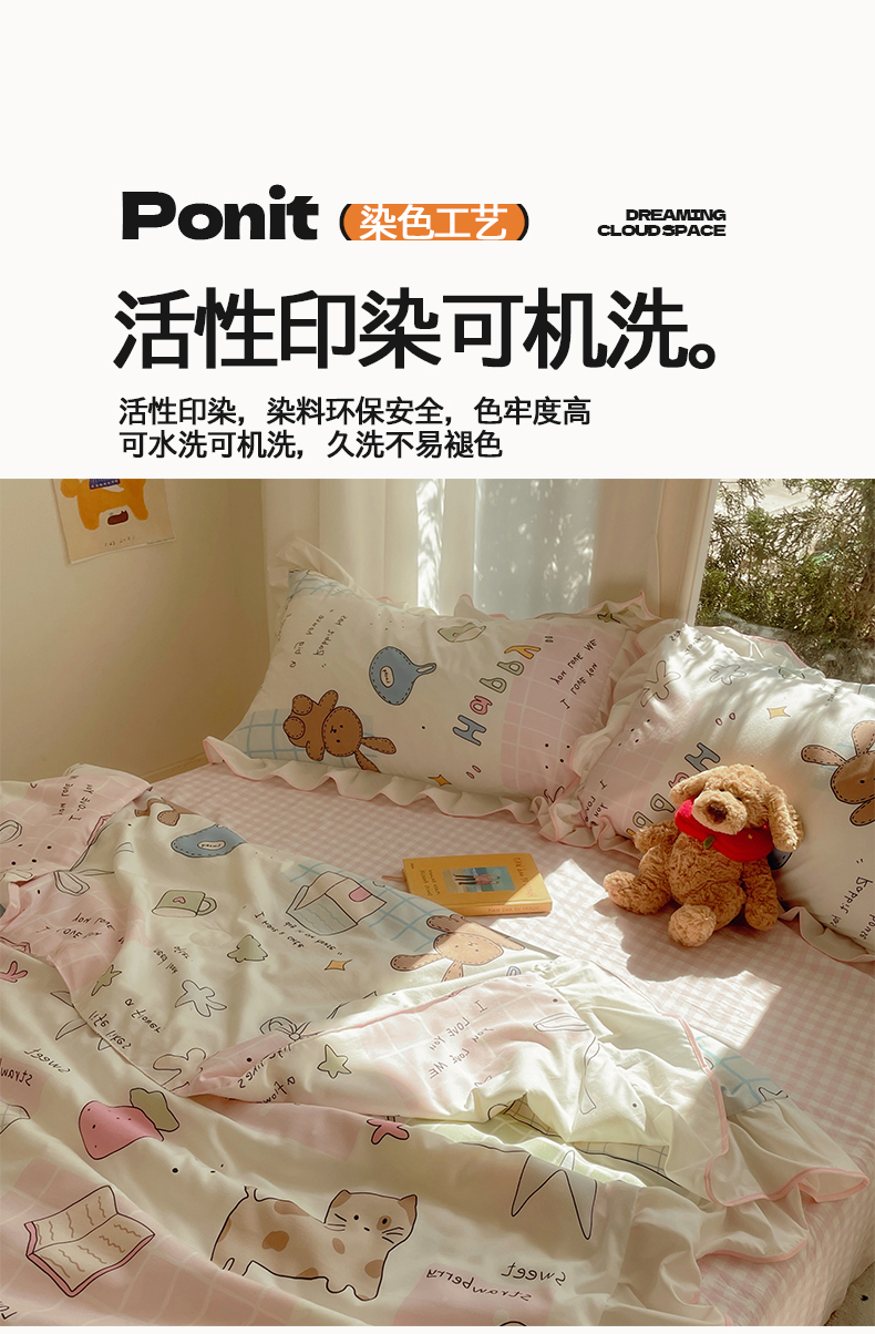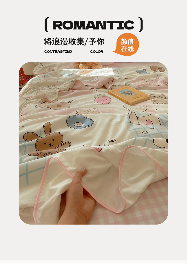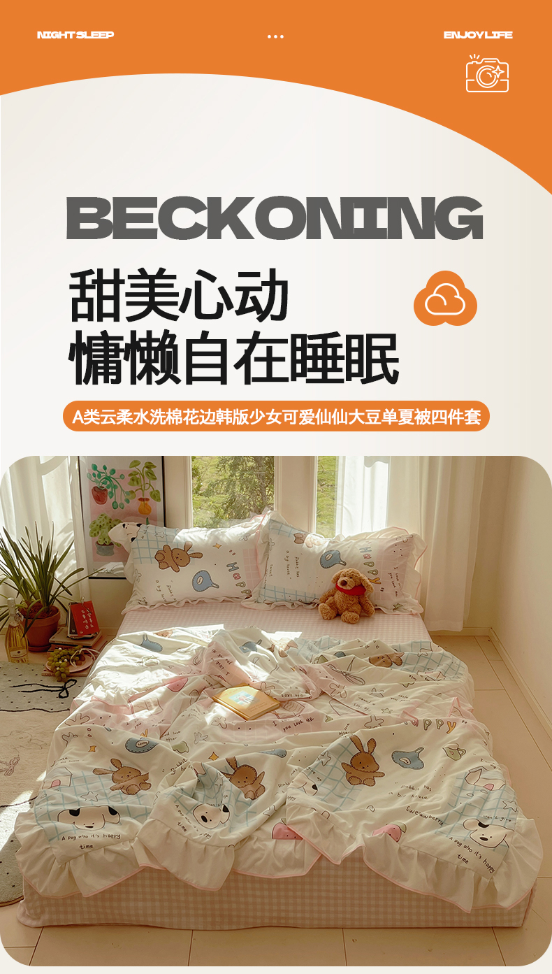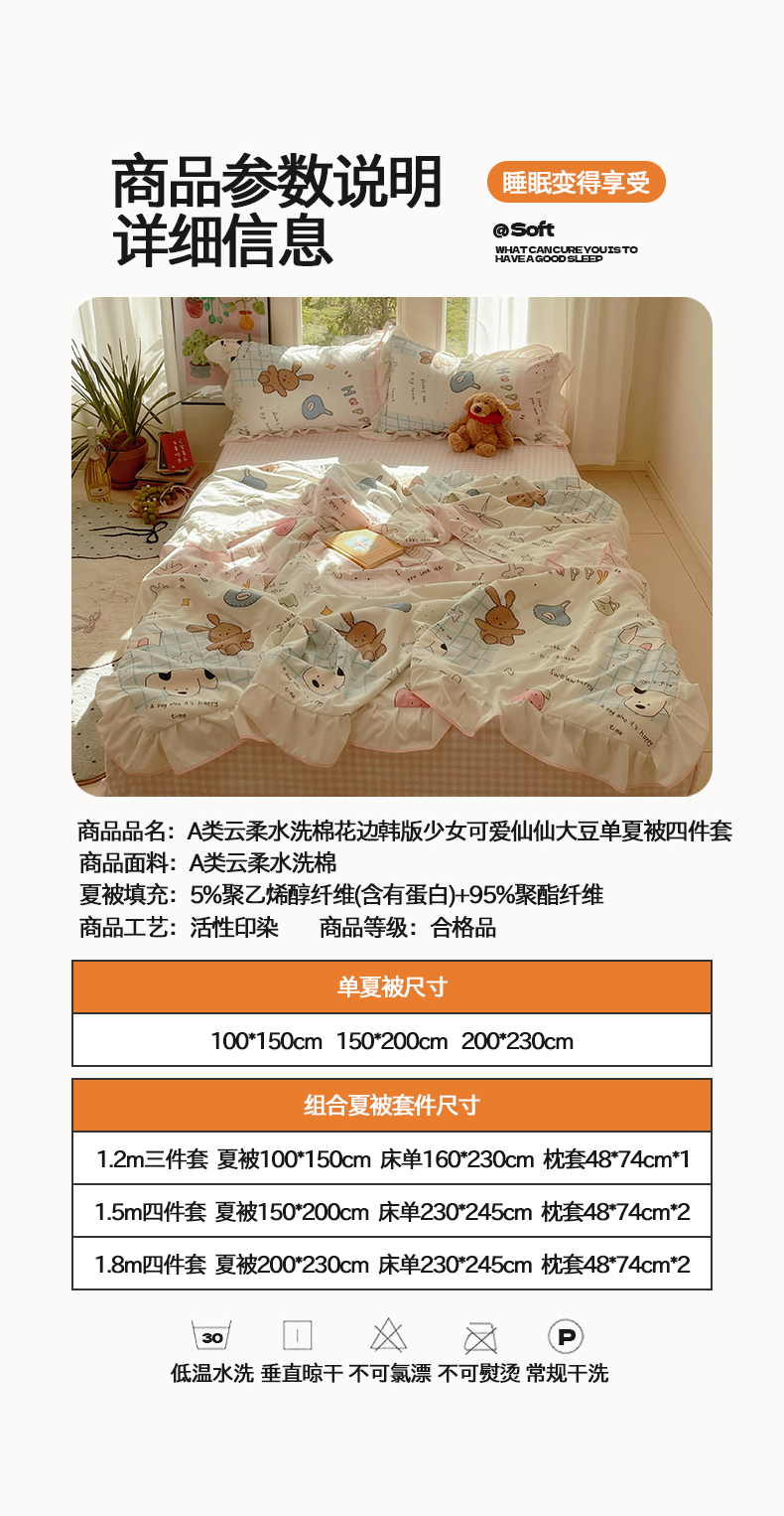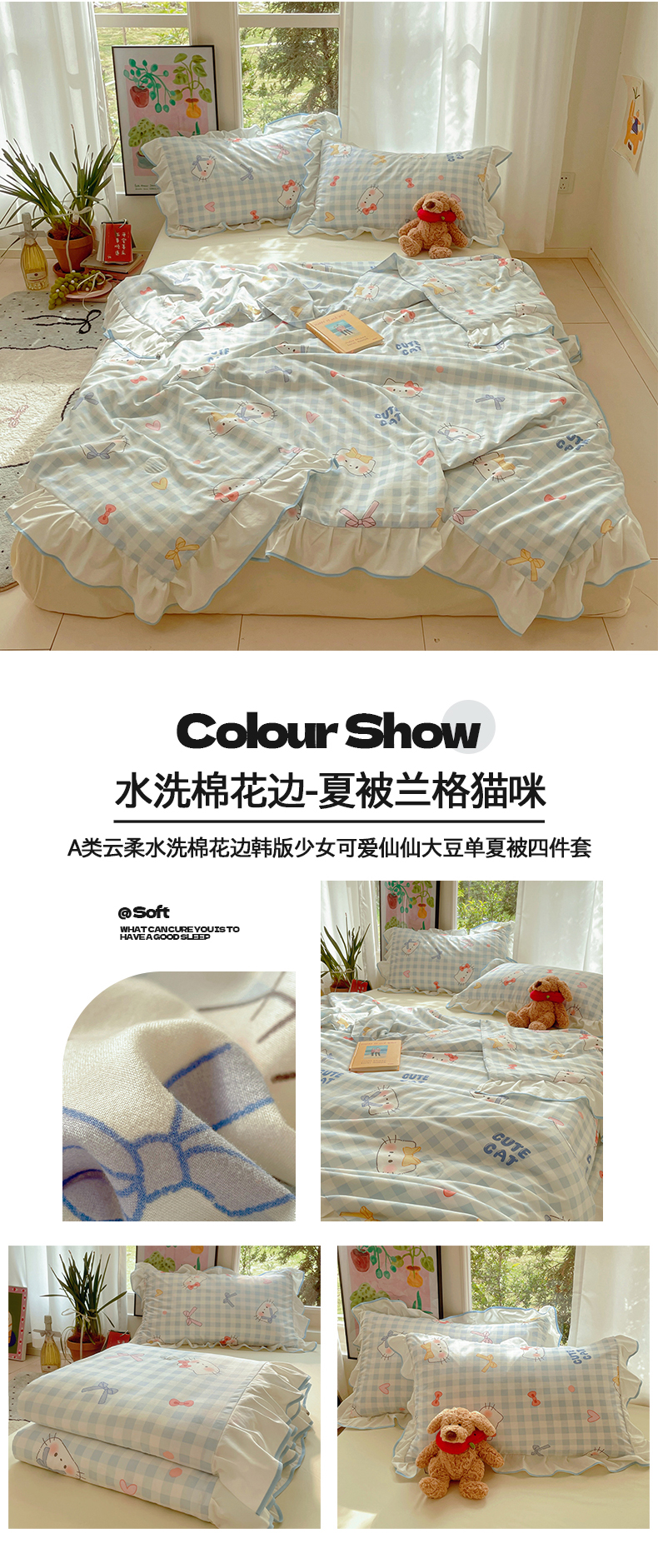 当前位置: 91家纺网 > 商品网购 > 床品套件 > 四件套 > 全棉普通四件套 > 桃心家居 2025新款A类云柔水洗棉花边韩版少女可爱仙仙大豆单夏被夏凉被空调被四件套 水洗棉花边-夏被卡哇伊