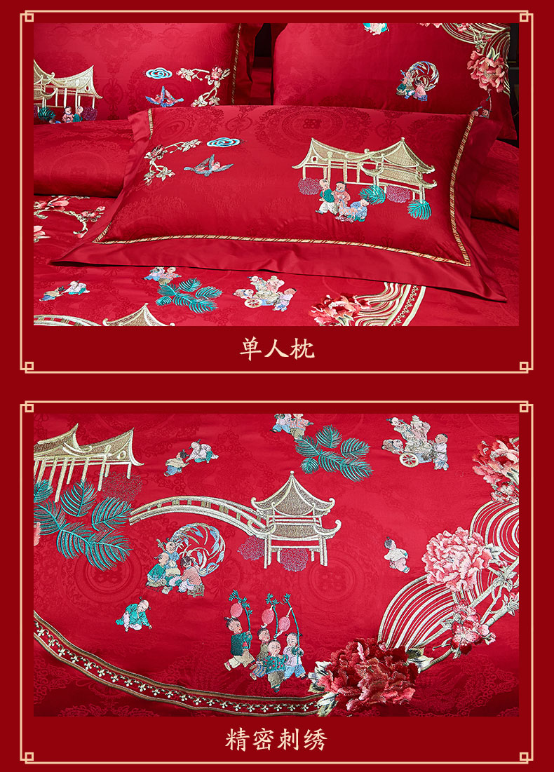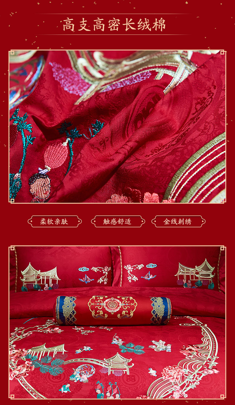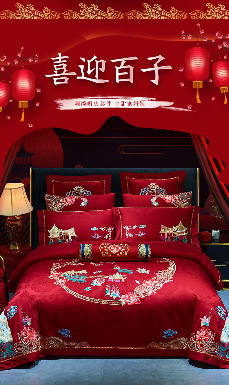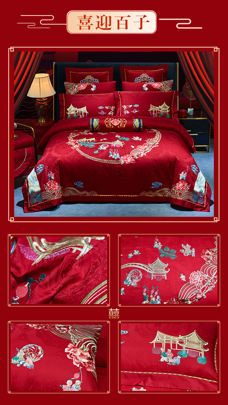 当前位置: 91家纺网 > 商品网购 > 床品套件 > 四件套 > 婚庆四件套 > 洽想家 2025新款120支双面新疆长绒棉刺绣工艺款婚庆四件套多件套 喜迎百子