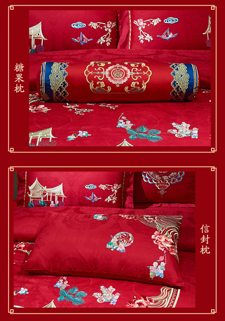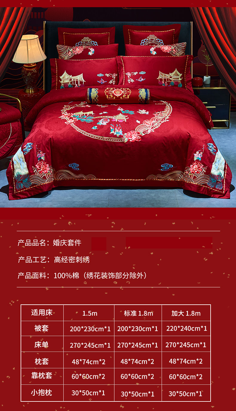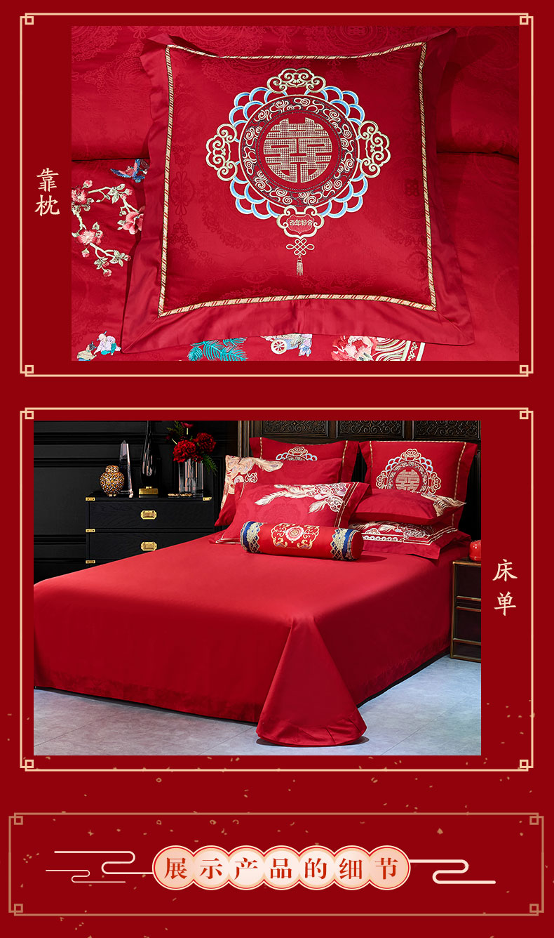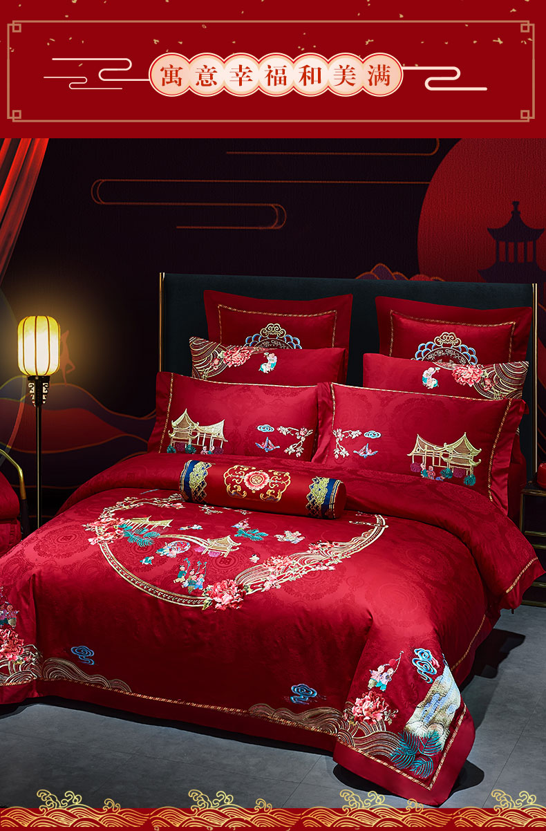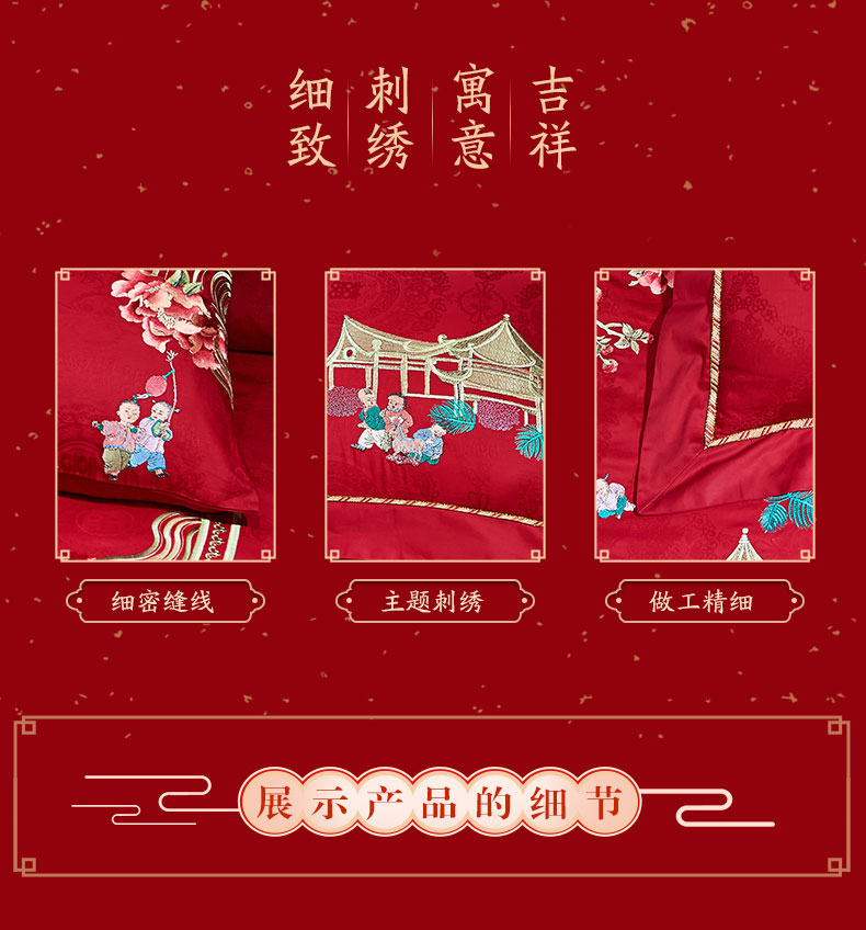 当前位置: 91家纺网 > 商品网购 > 床品套件 > 四件套 > 婚庆四件套 > 洽想家 2025新款120支双面新疆长绒棉刺绣工艺款婚庆四件套多件套 喜迎百子