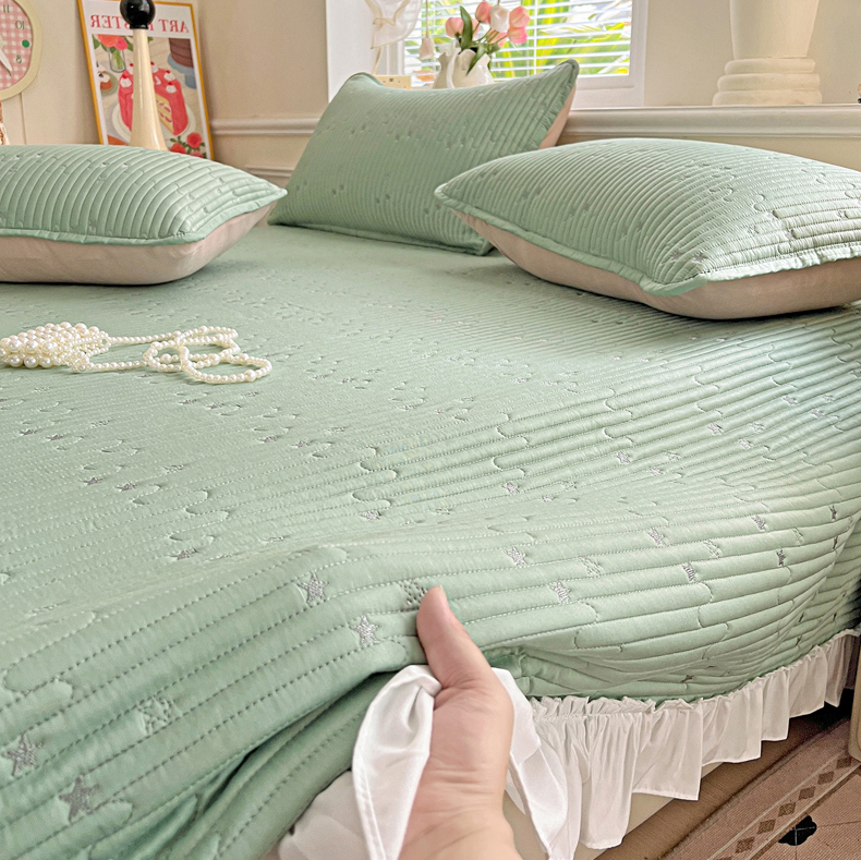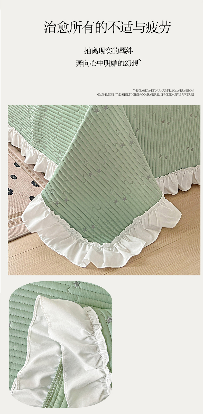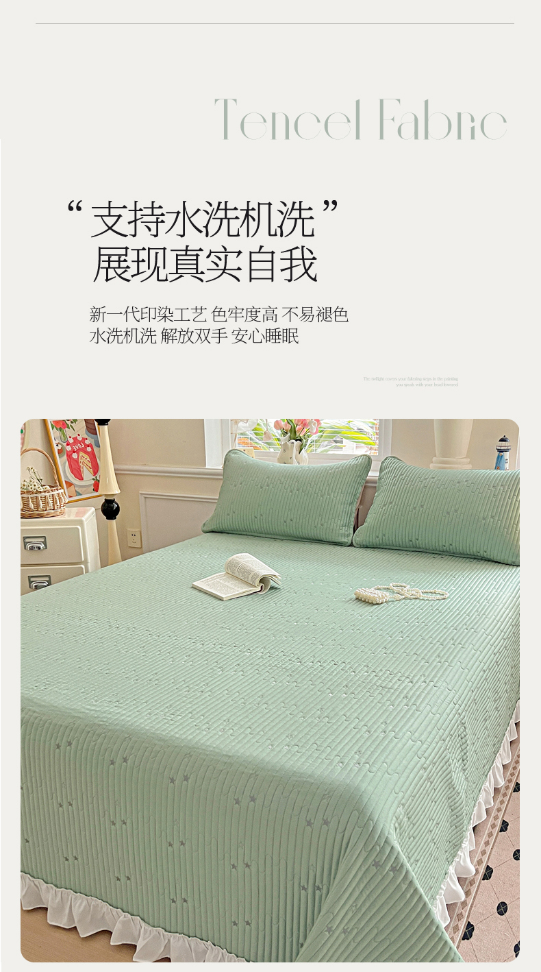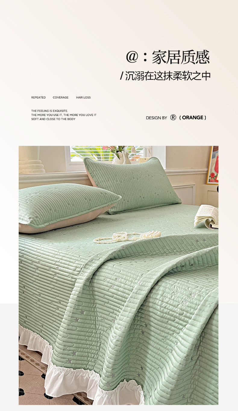 • 91家纺网 家纺一手货源 找家纺 恒尚居2025花边床盖莫代尔夏季夹棉床单星星刺绣绗缝三件套 夏时光-绿