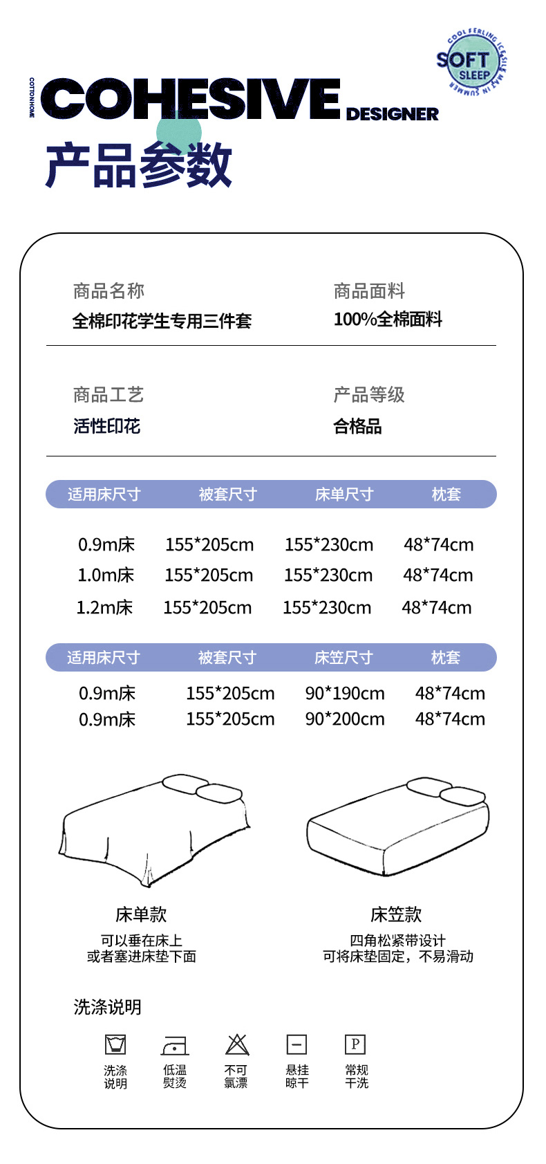 0.9m床单款三件套【被套1.55*2.05床单1.55*230 枕套48*74*1只】 | ¥85.00 |