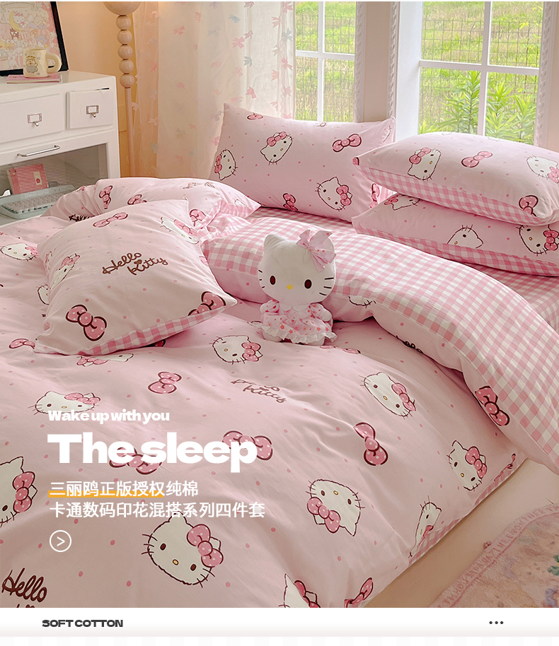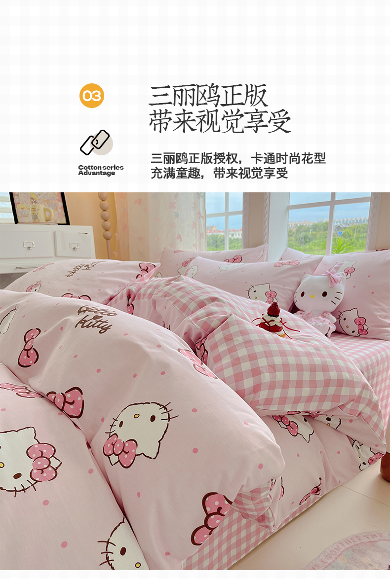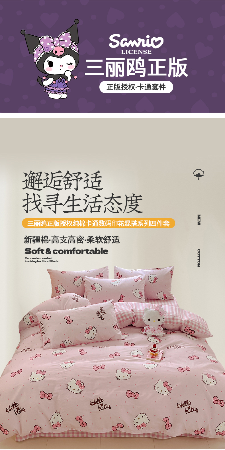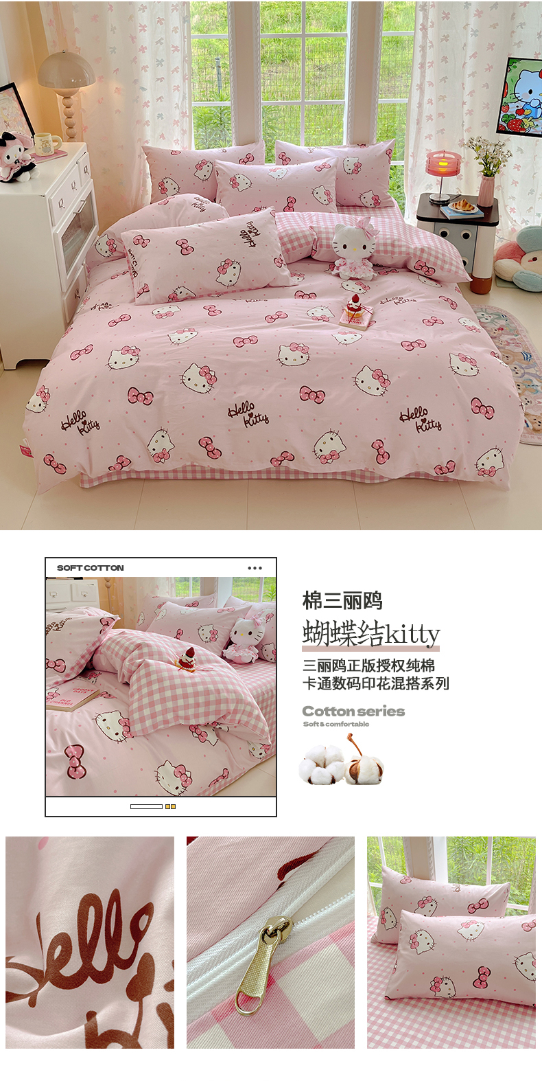 当前位置: 91家纺网 > 商品网购 > 床品套件 > 四件套 > 全棉普通四件套 > 金爱家2025新款三丽鸥正版授权卡通数码印花混搭纯棉印花系列四件套 棉三丽鸥-蝴蝶结kitty