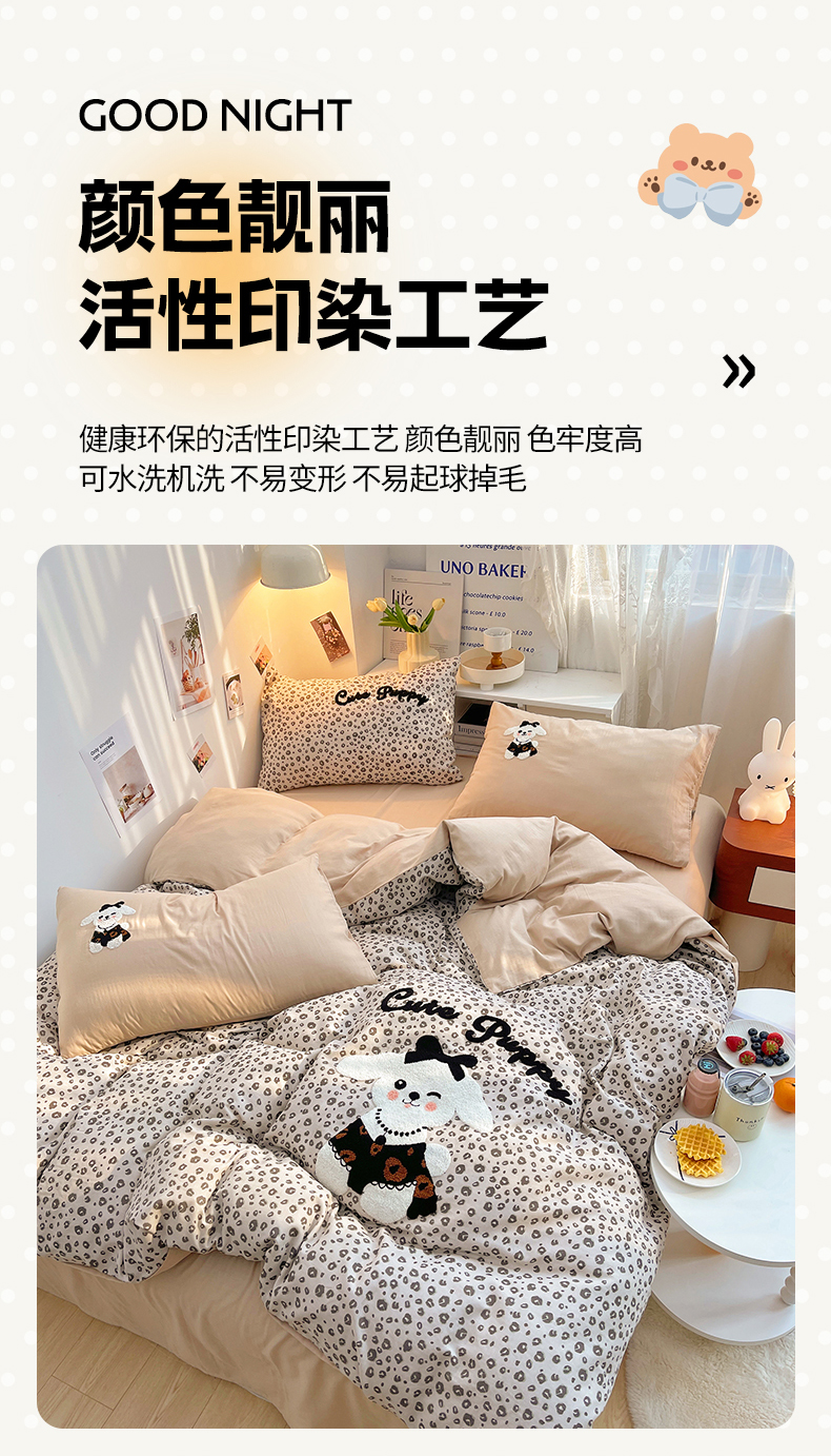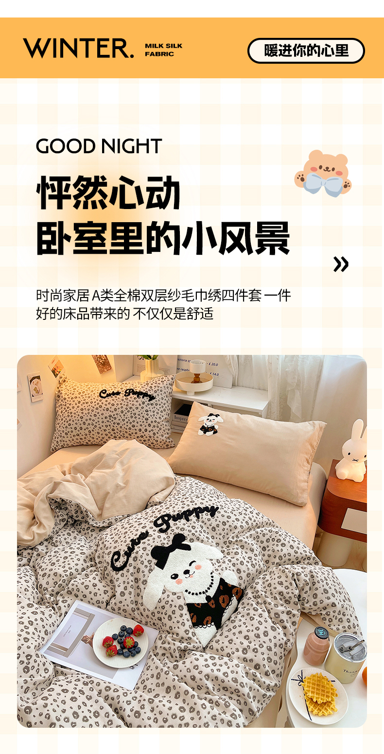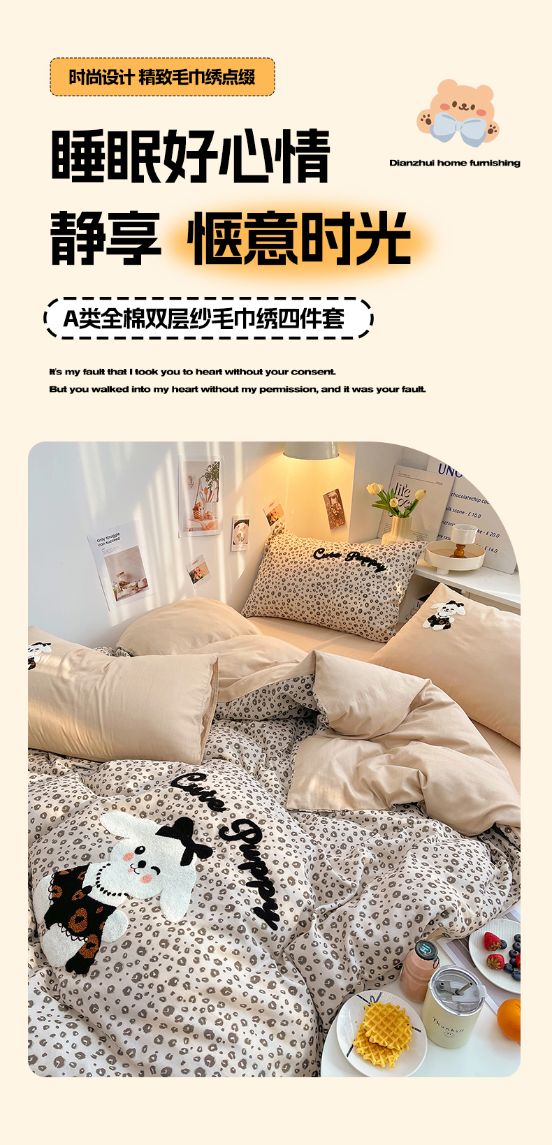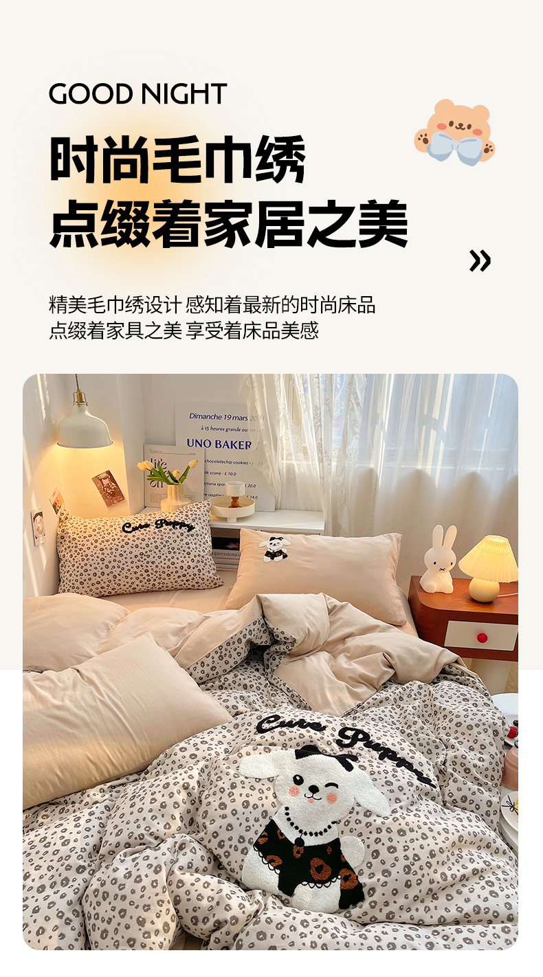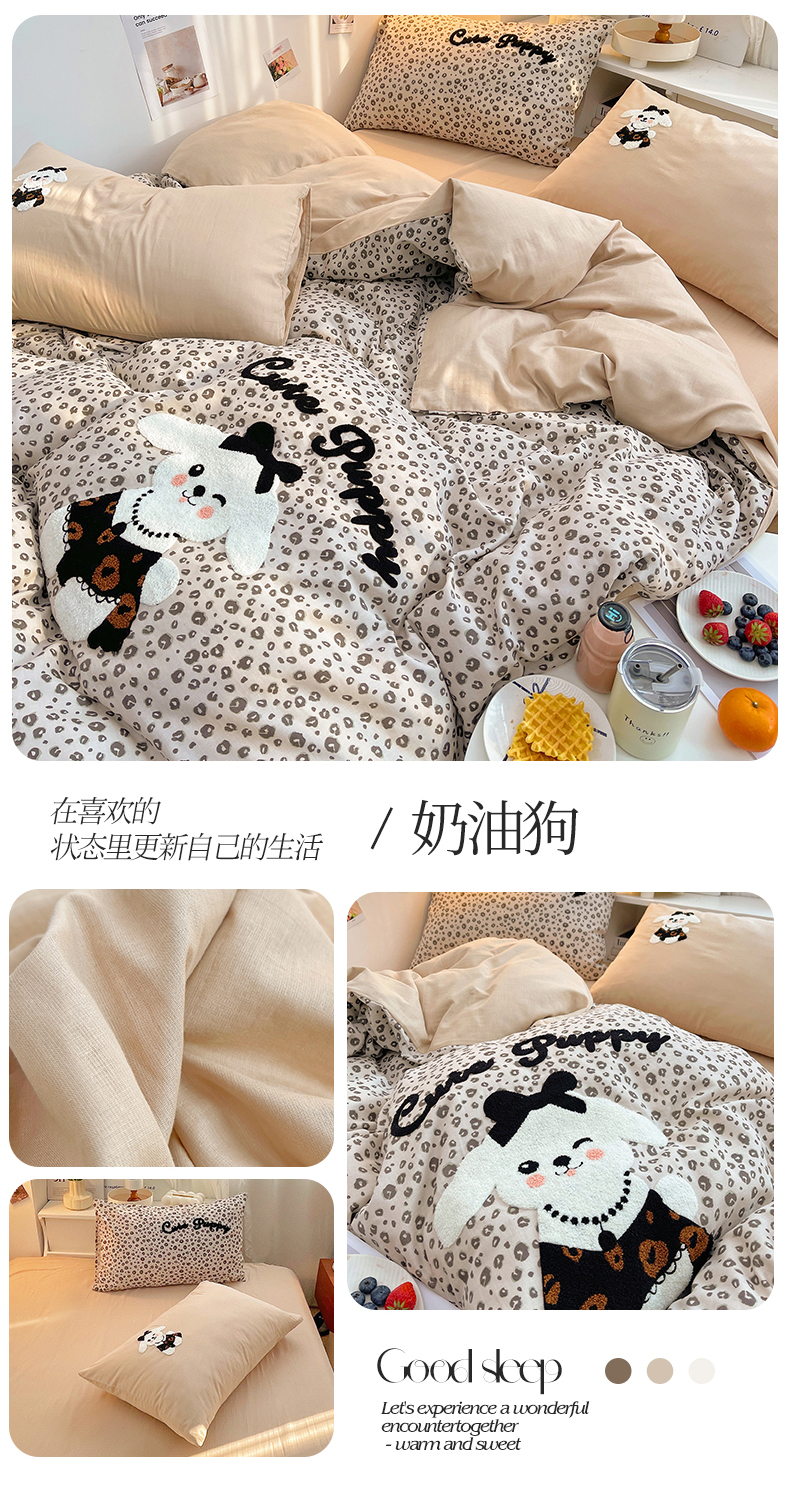 当前位置: 91家纺网 > 商品网购 > 床品套件 > 四件套 > 全棉普通四件套 > 炫拼家纺 2026春夏新款全棉纯棉A类40支双层纱卡通毛巾绣四件套-慕斯 奶油狗