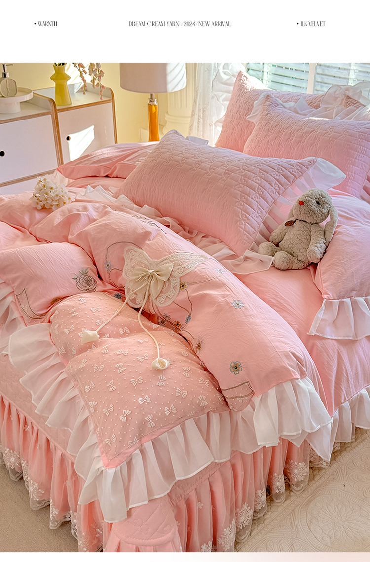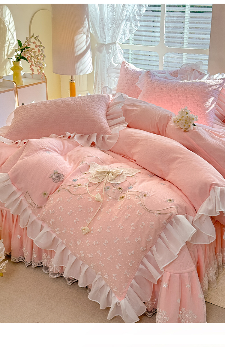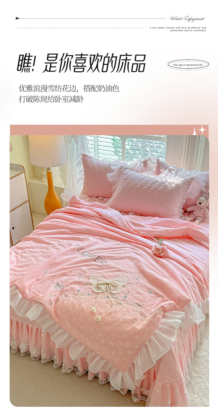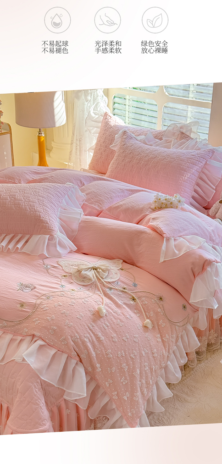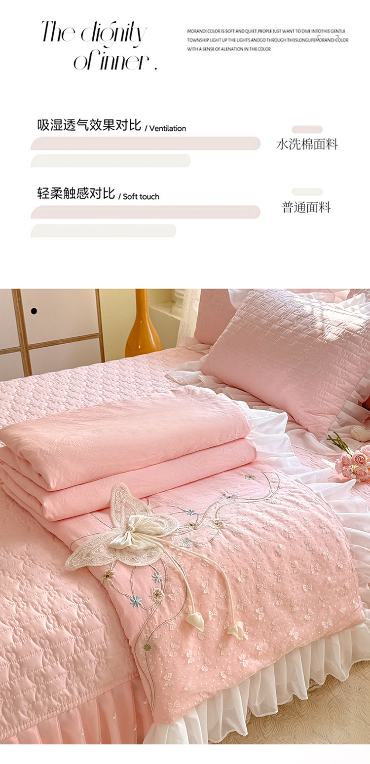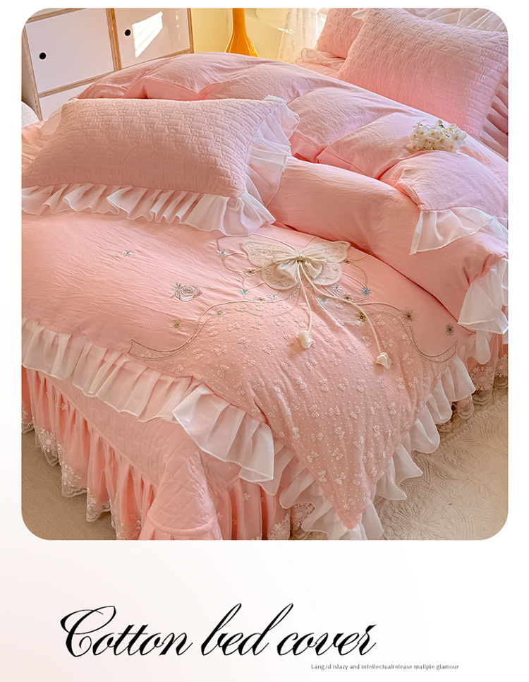 商品名称:漫布云家纺2025春夏新品韩版甜美公主风超柔水洗棉床盖四件套刺绣针织棉双层纱纯棉棉麻全棉少女心夹棉床裙款夏被款床盖四件套 幻蝶-樱花粉