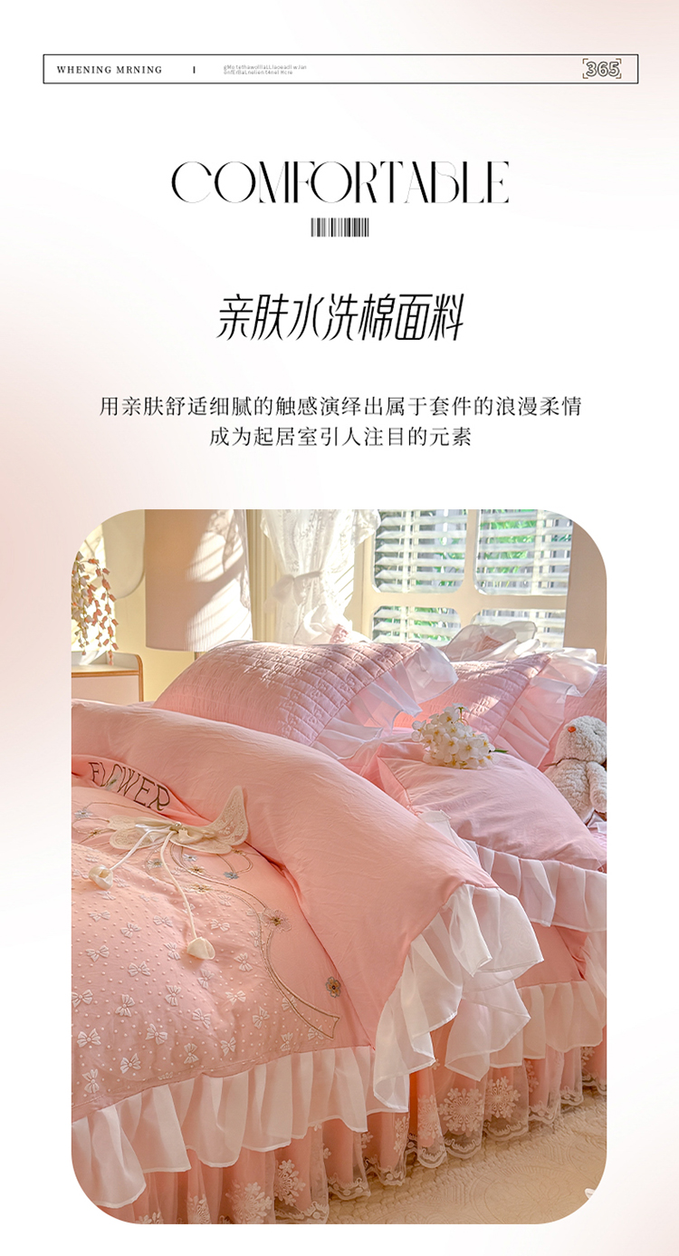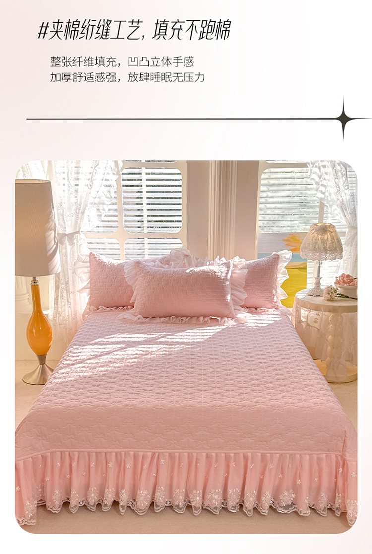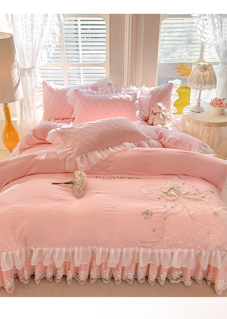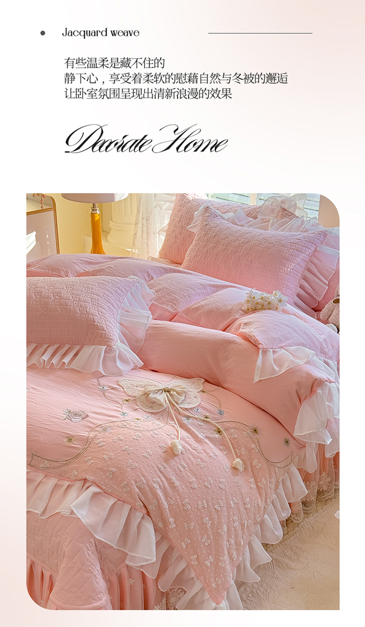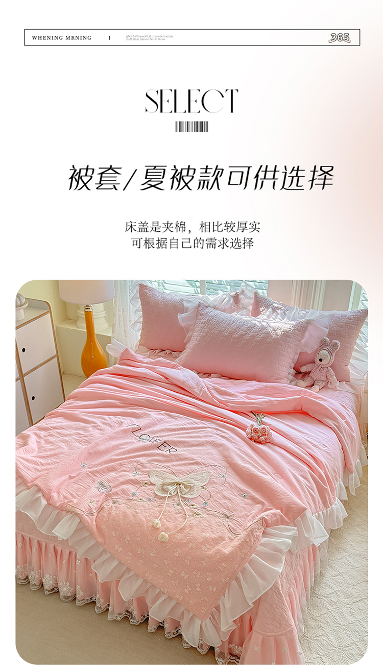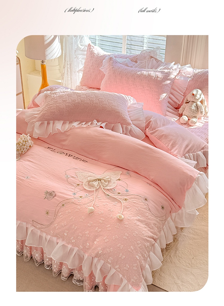 商品名称:漫布云家纺2025春夏新品韩版甜美公主风超柔水洗棉床盖四件套刺绣针织棉双层纱纯棉棉麻全棉少女心夹棉床裙款夏被款床盖四件套 幻蝶-樱花粉