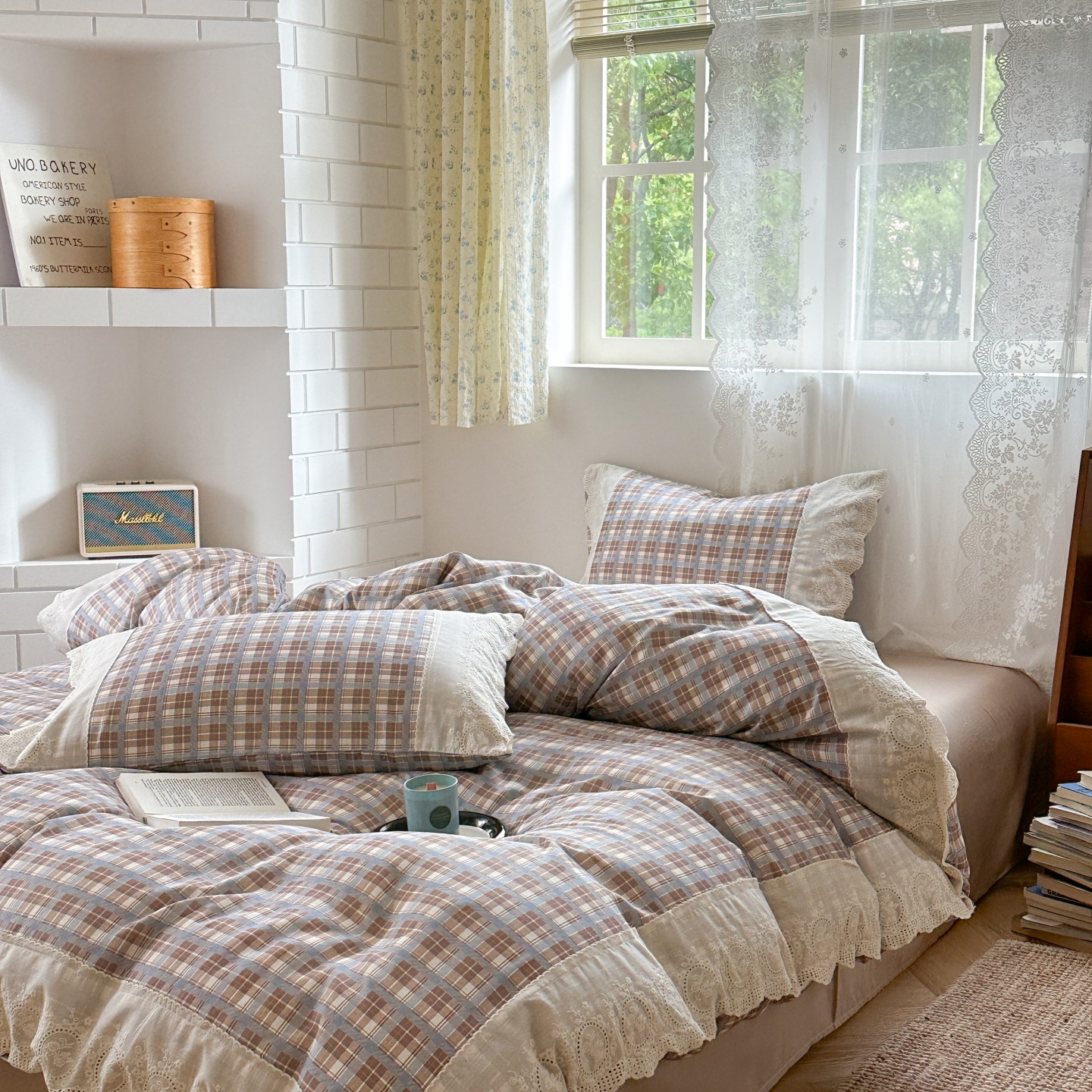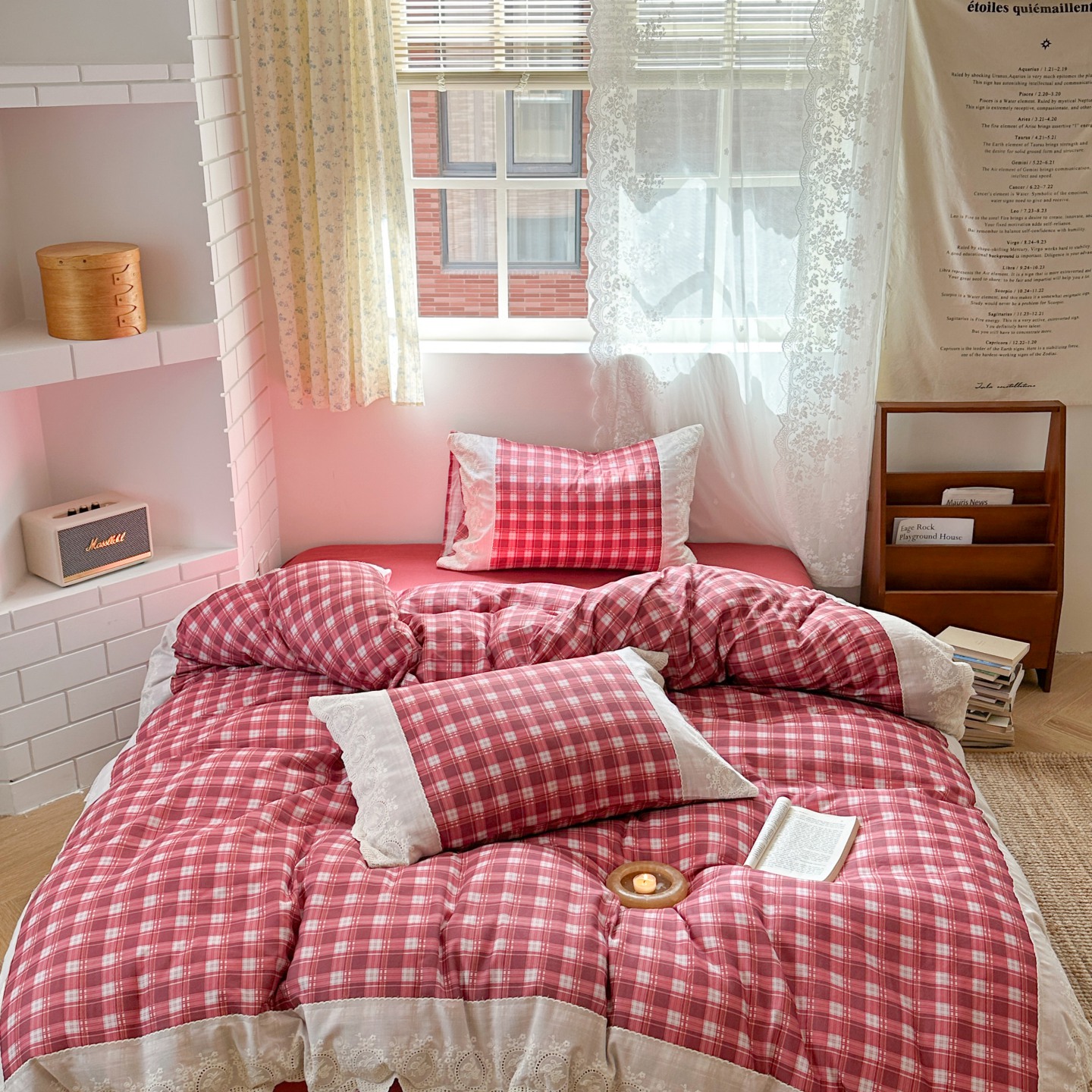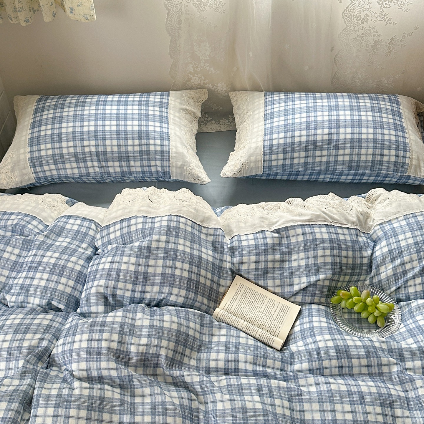 觅糖家纺 2025新款A类全棉云感双层纱蕾丝花边四件套 晴天蓝格