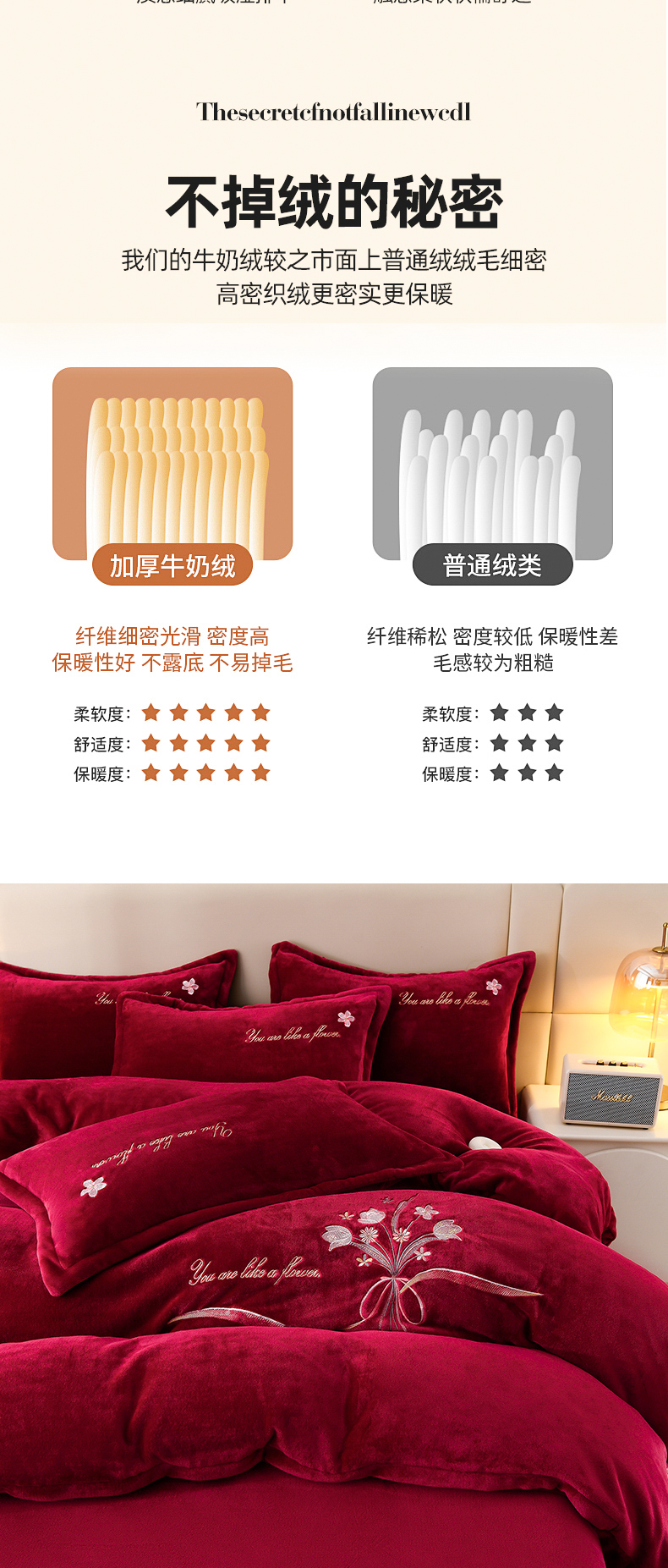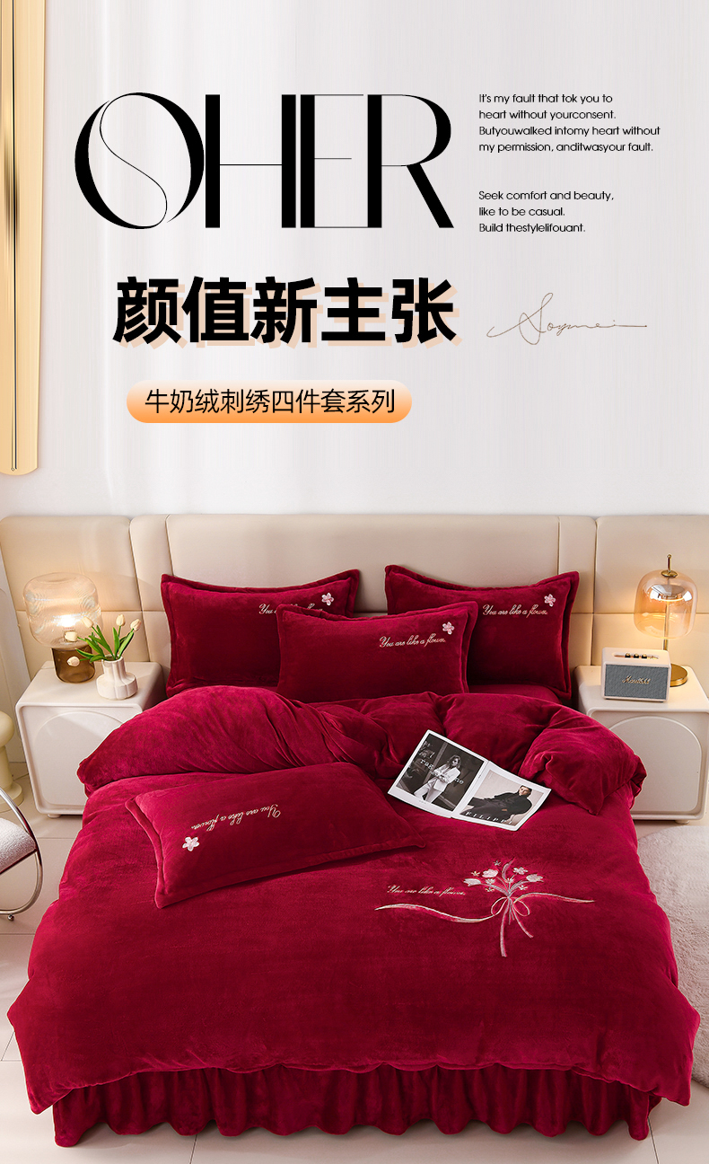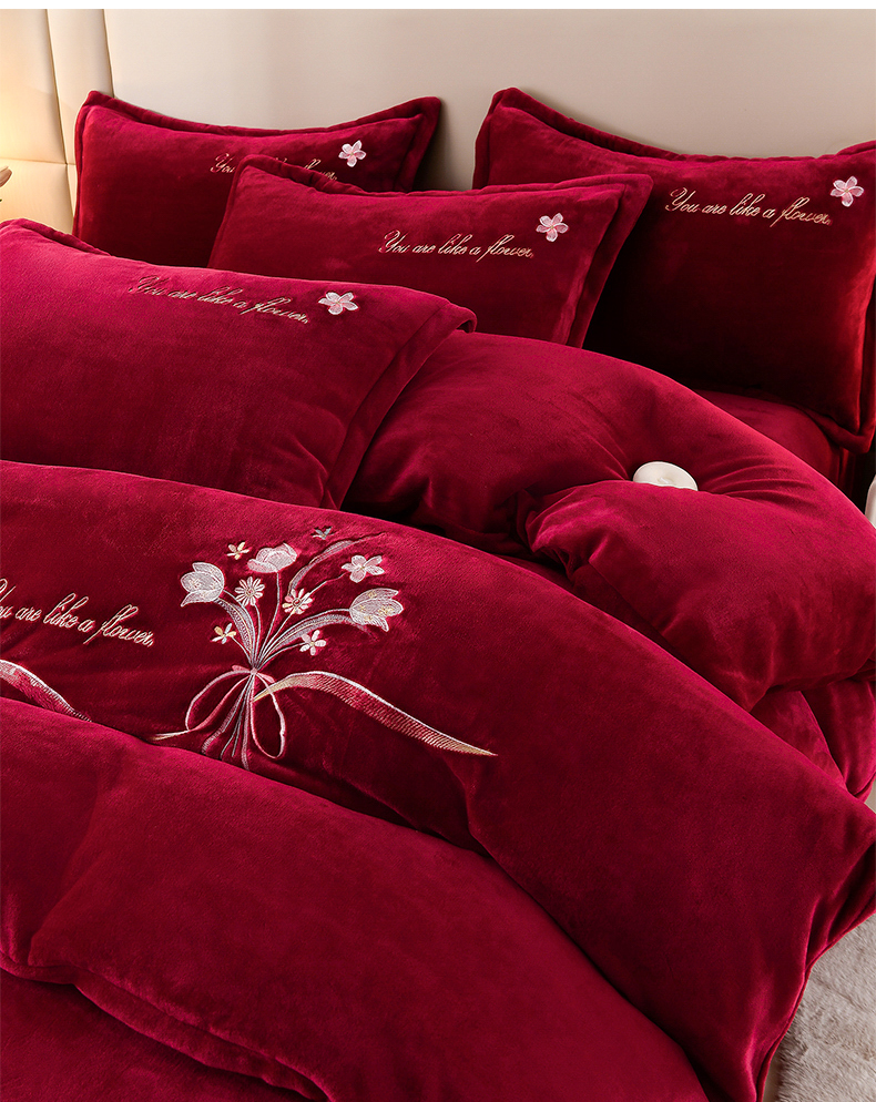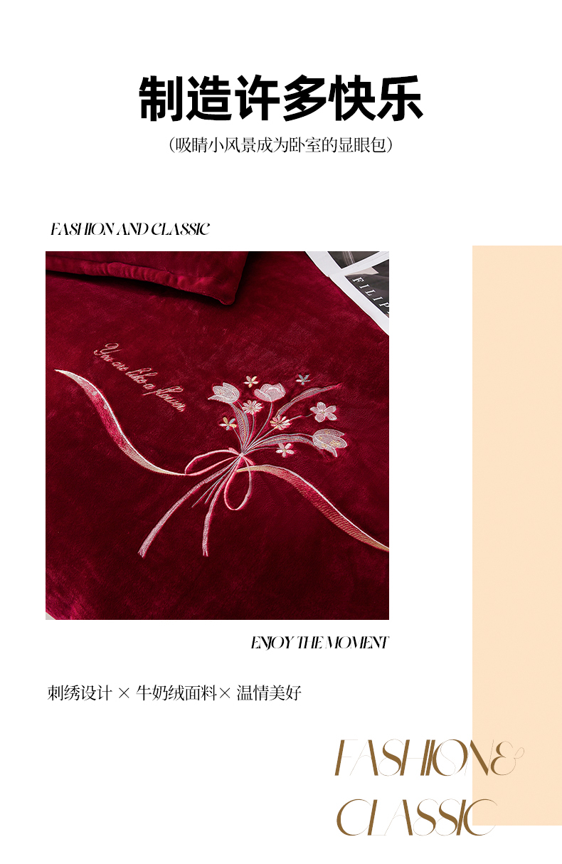 绣女坊 2025新款高克重牛奶绒刺绣四件套 郁金香-酒红