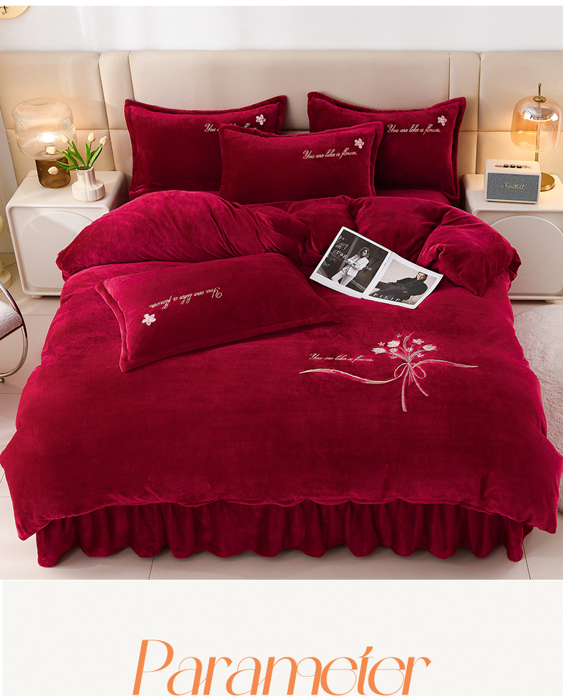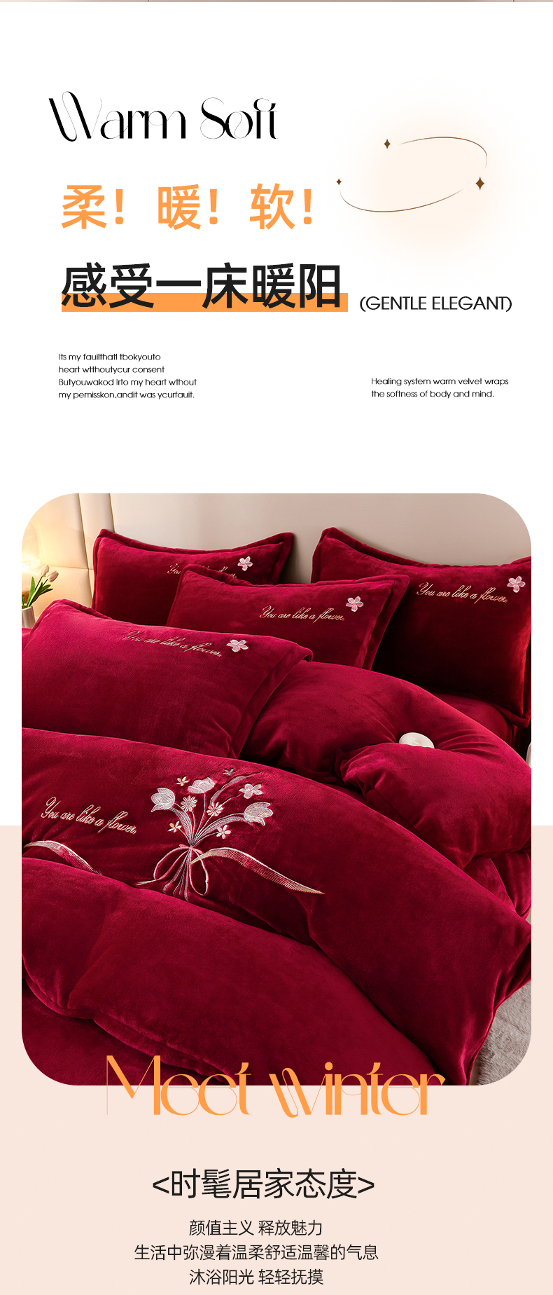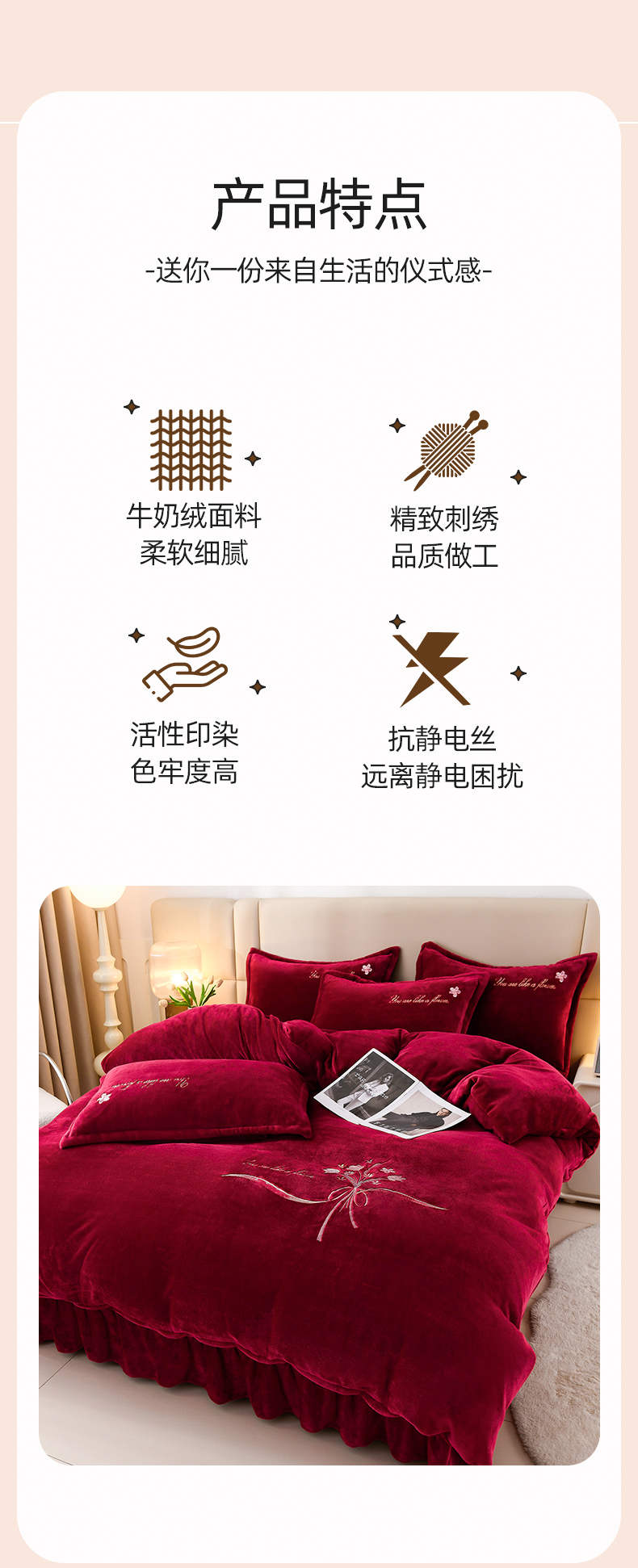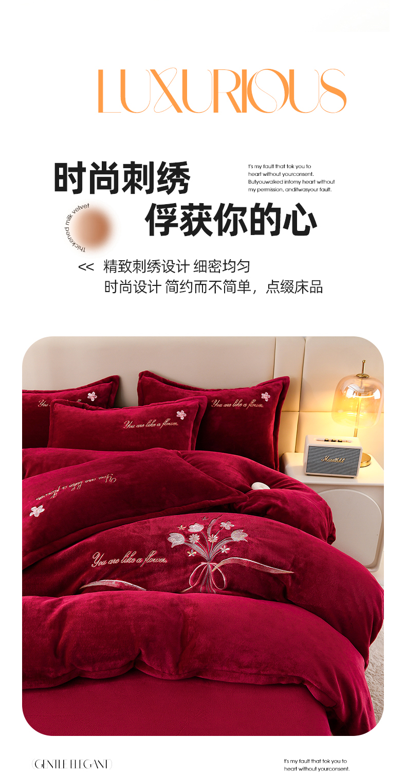 绣女坊 2025新款高克重牛奶绒刺绣四件套 郁金香-酒红