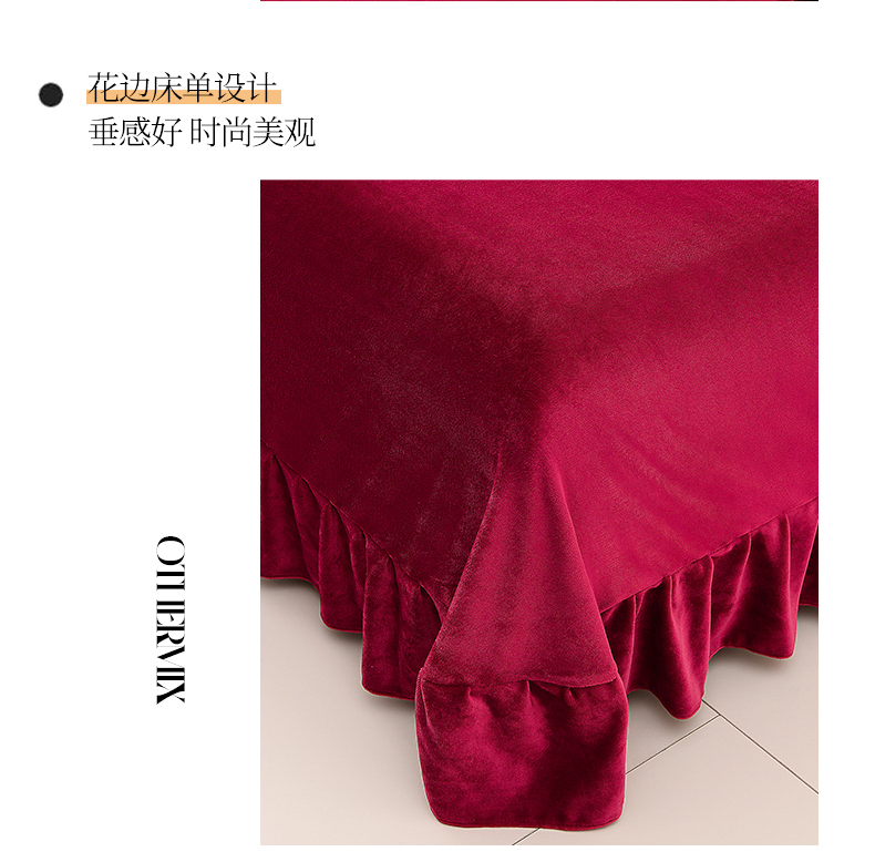(总)绣女坊2023新款韩版花边床裙款牛奶绒宝宝绒四件套,宾利蓝,豆沙,灰色,酒红色,松花绿,紫色