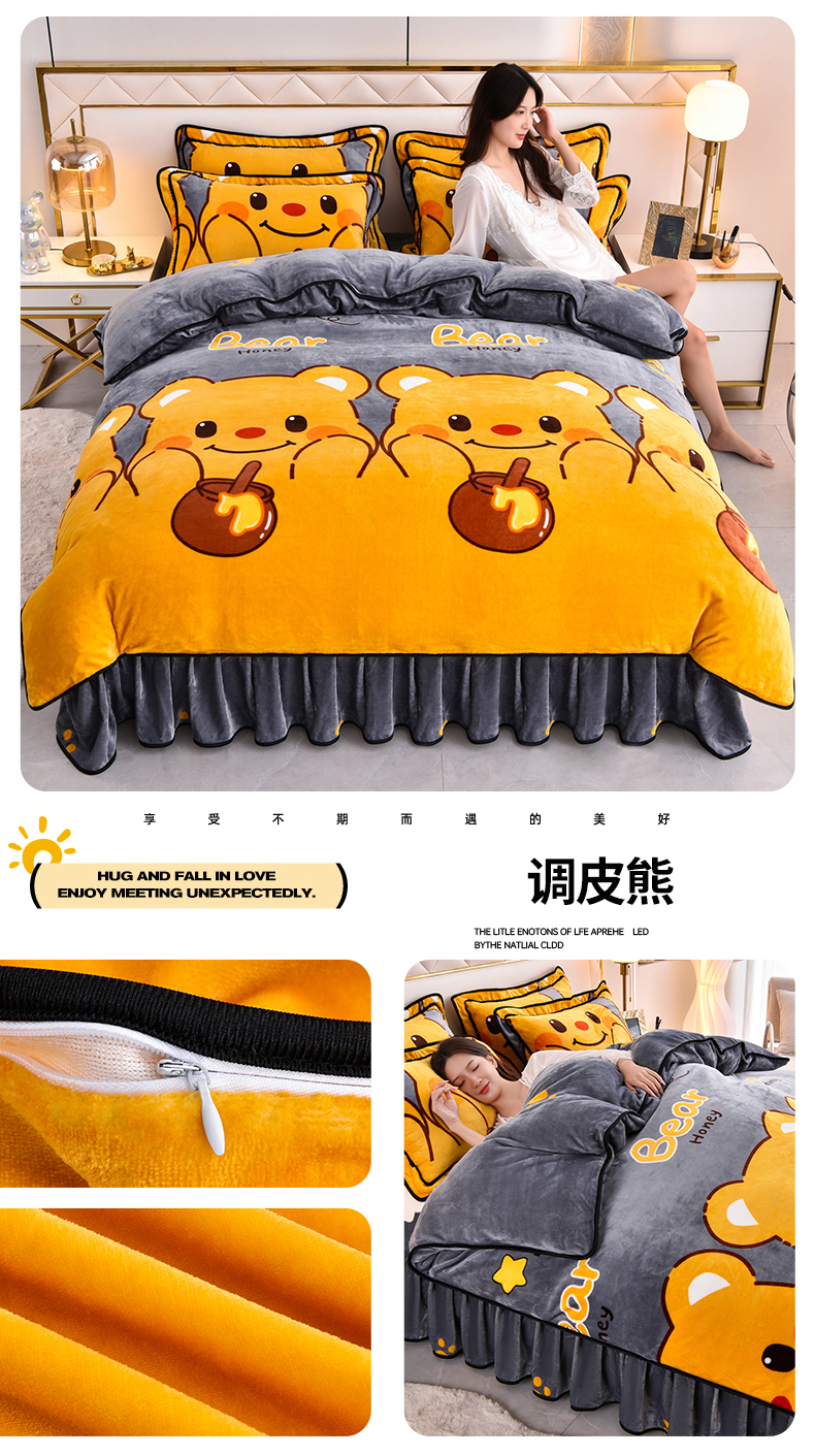 商品名称:启扬 2025直播爆款新款8.5斤加厚高克重牛奶绒四件套床裙款法莱绒宝宝绒金貂绒 调皮熊