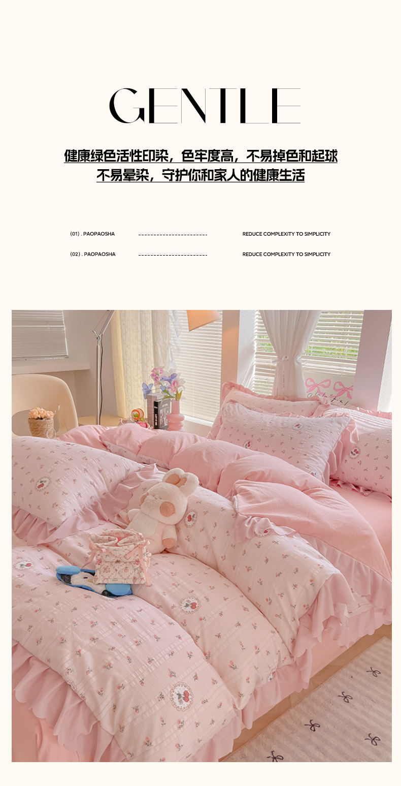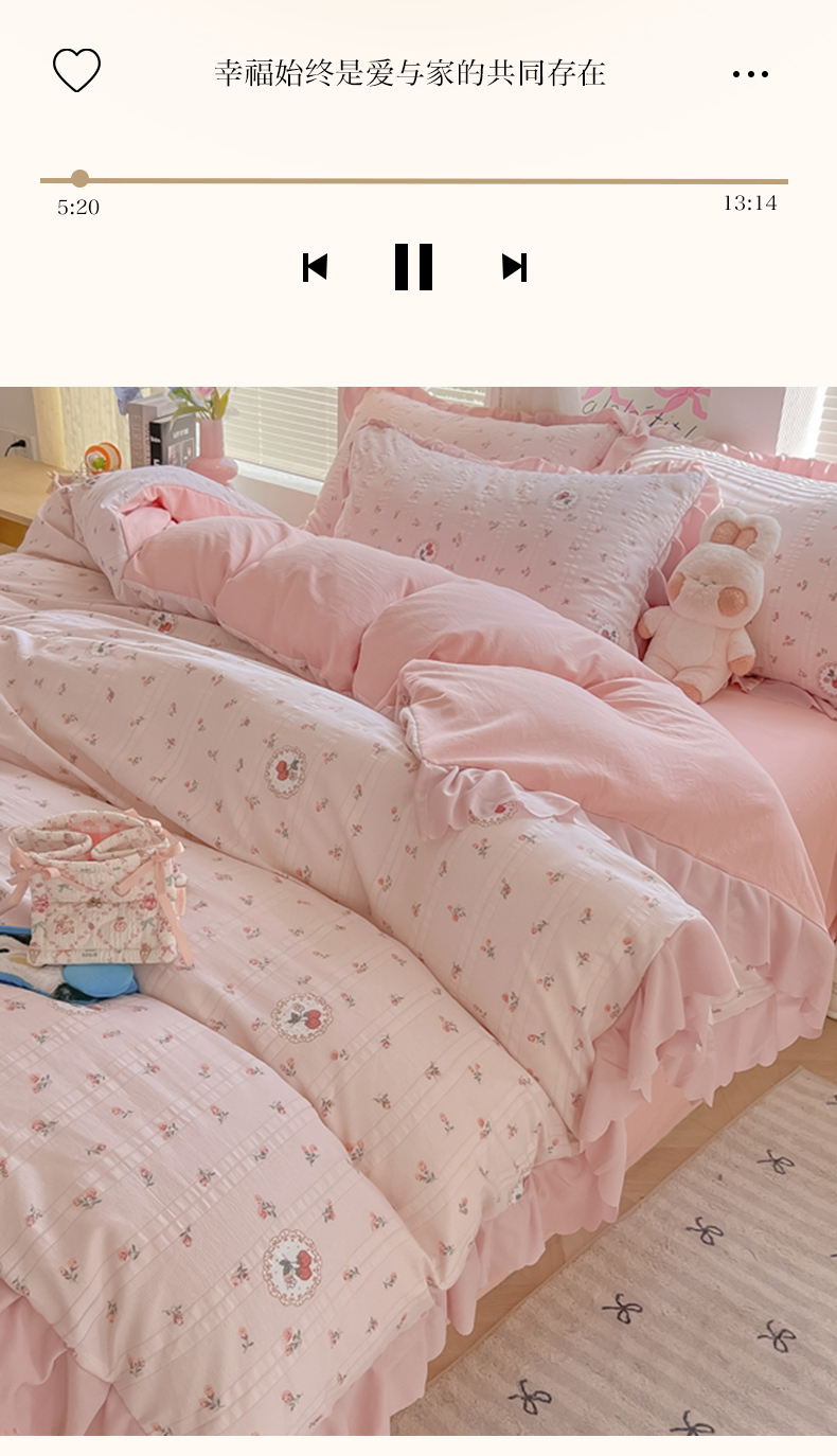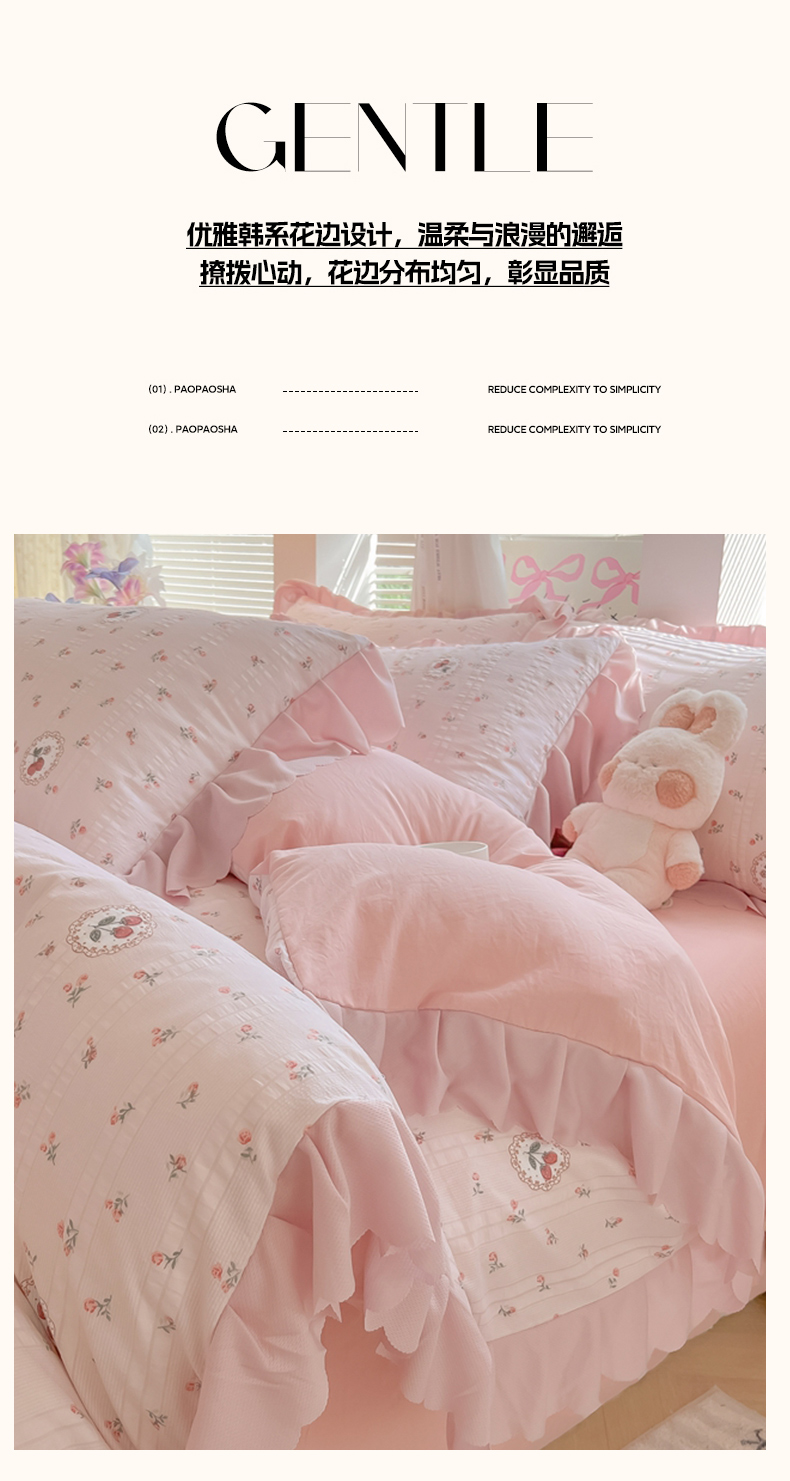 商品名称:(总)(含买家秀)2025年新款开学季泡泡棉小竹棉四件套韩系少女风花边款床单被套学生三件套床品套件