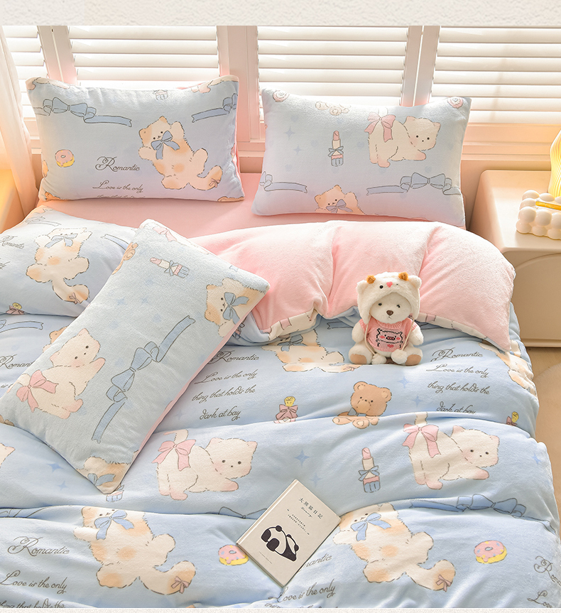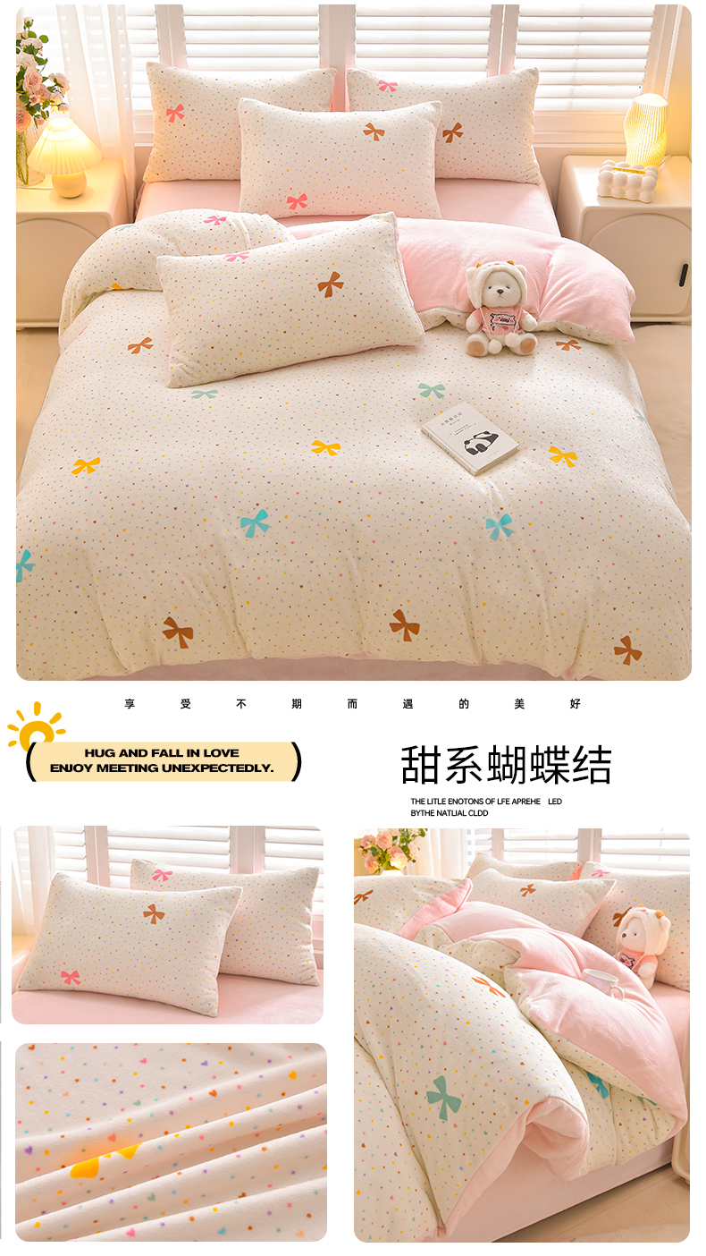 (总)鑫喜莱家纺 2025新款加厚牛奶绒卡通印花四件套,蝴蝶结小猫,波点动物园米,波点熊猫,宠物日记,调皮狗,黑白格小兔,可爱小狗,甜系蝴蝶结