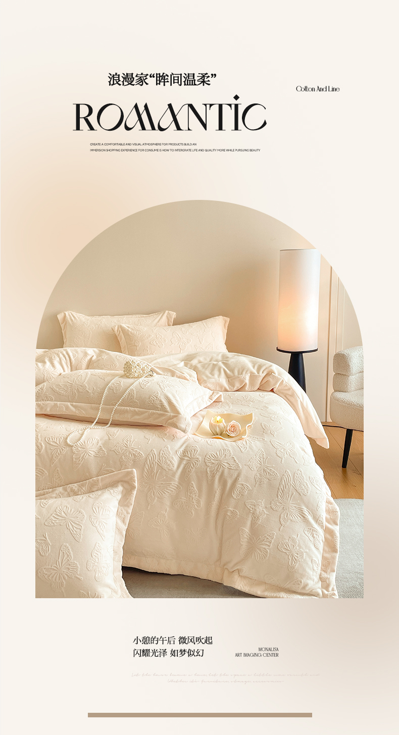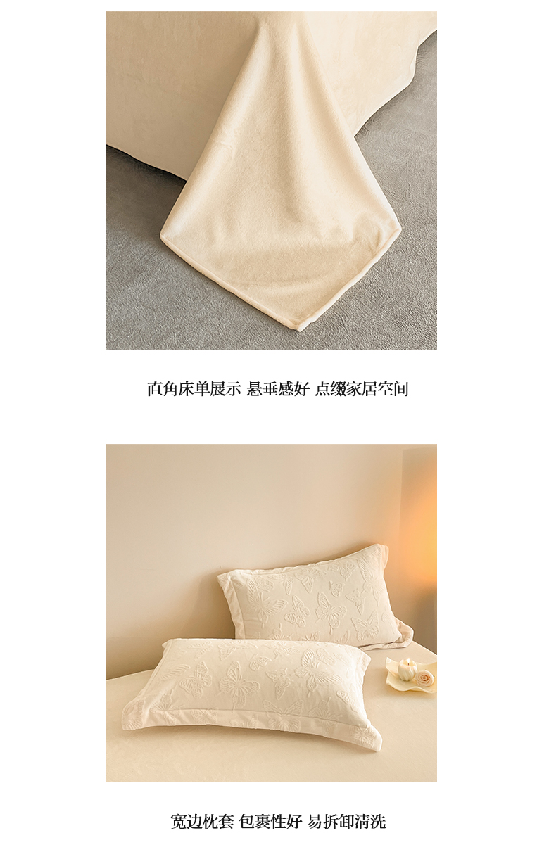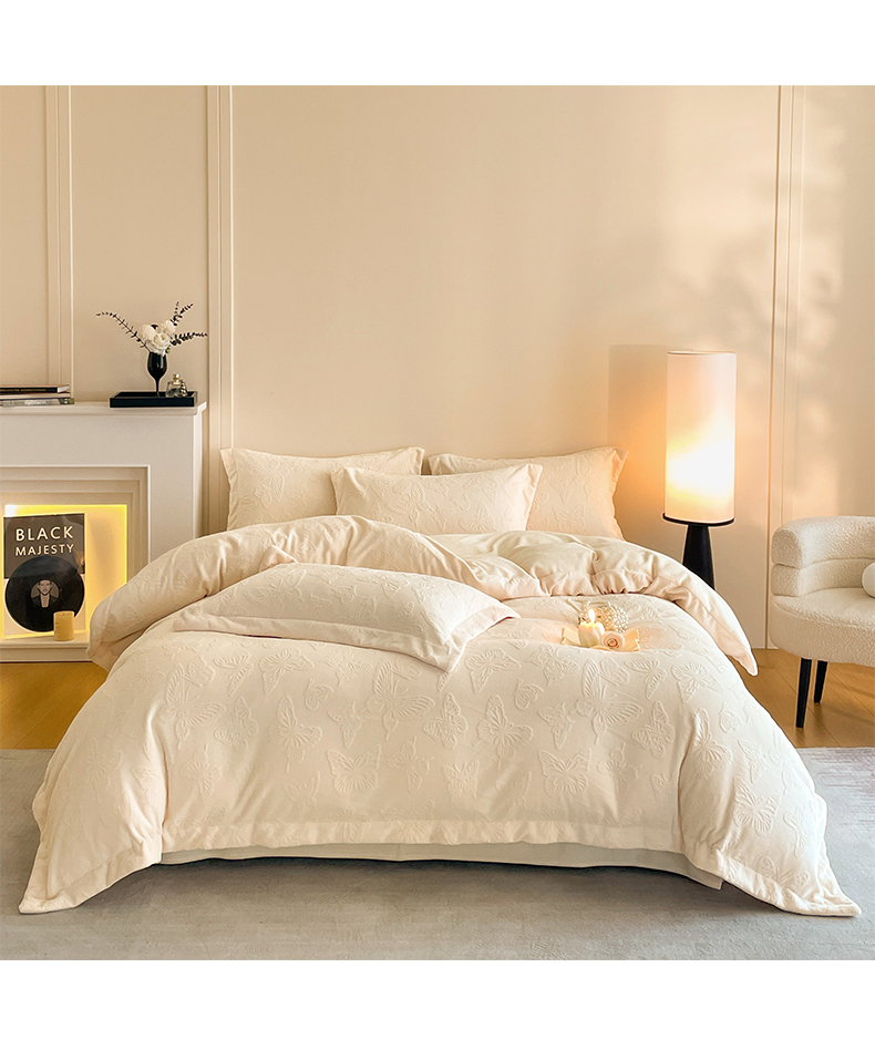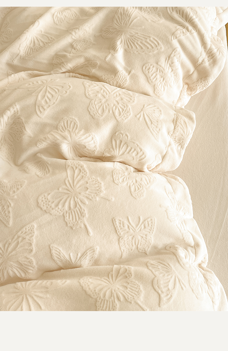 当前位置: 91家纺网 > 商品网购 > 床品套件 > 四件套 > 牛奶绒四件套 > 米彩家纺 2025新款A类牛奶绒立体雕花烂花宽边四件套 蝴蝶奶白