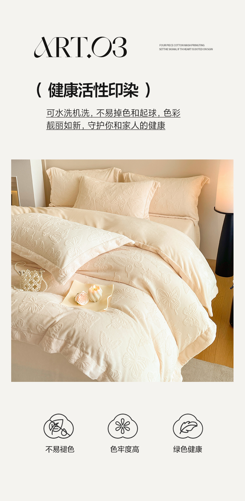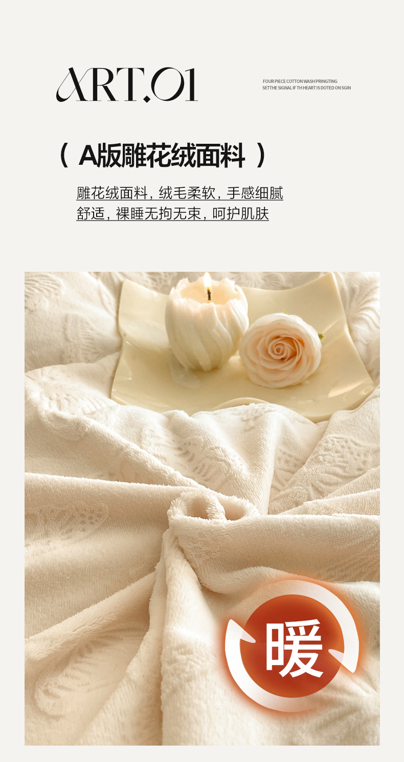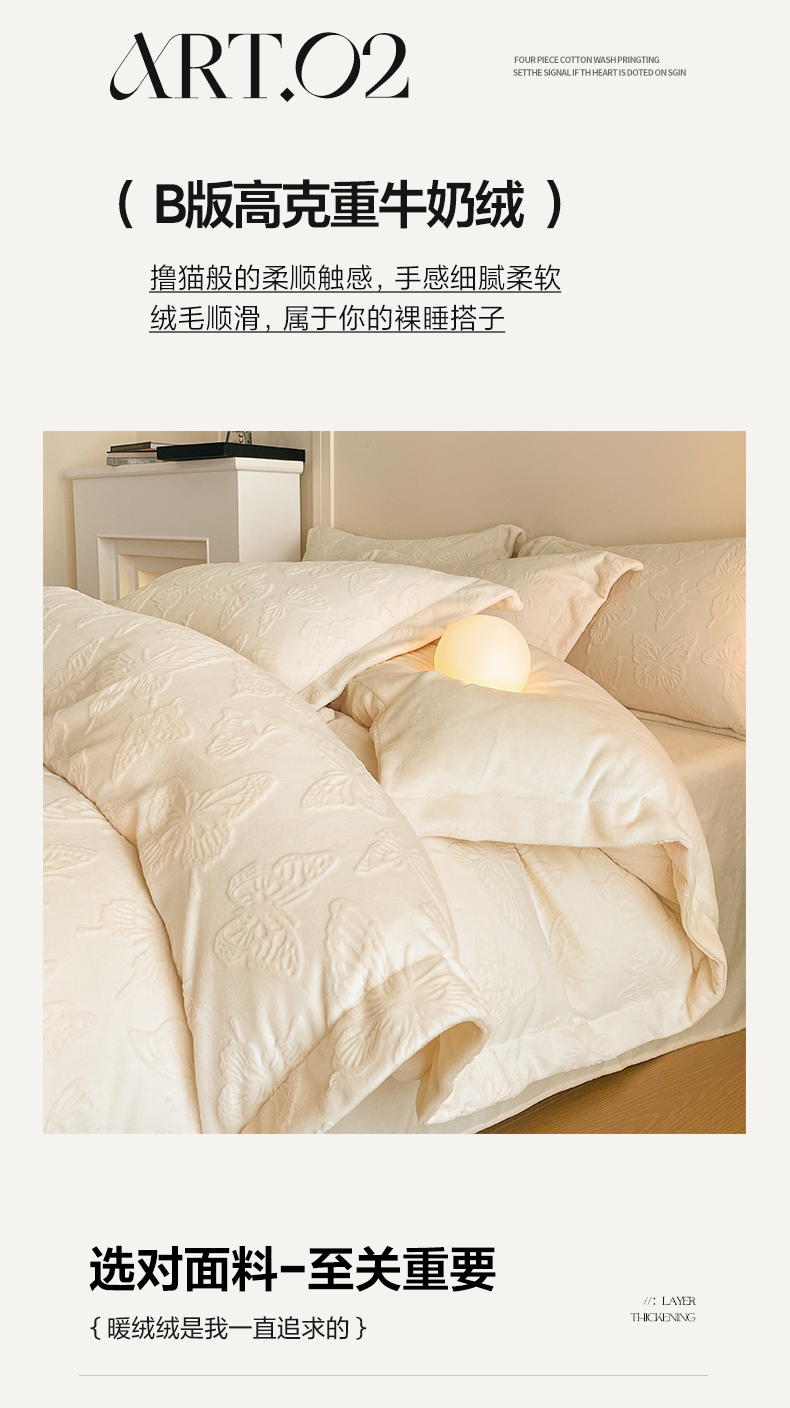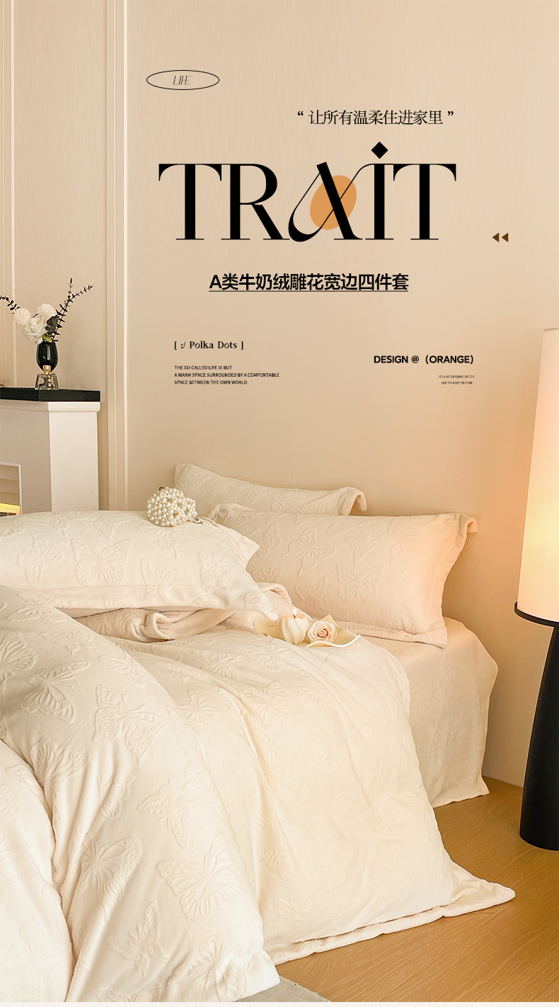 当前位置: 91家纺网 > 商品网购 > 床品套件 > 四件套 > 牛奶绒四件套 > 米彩家纺 2025新款A类牛奶绒立体雕花烂花宽边四件套 蝴蝶奶白