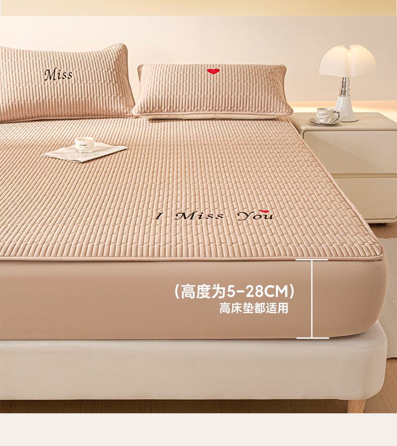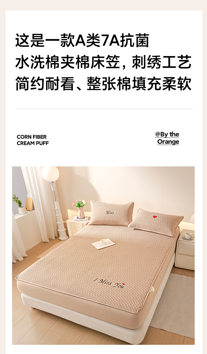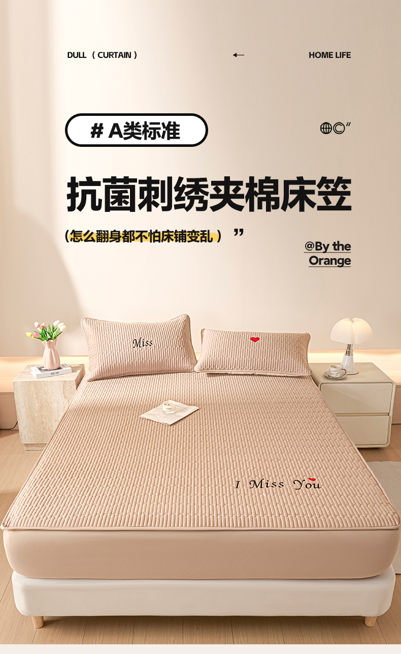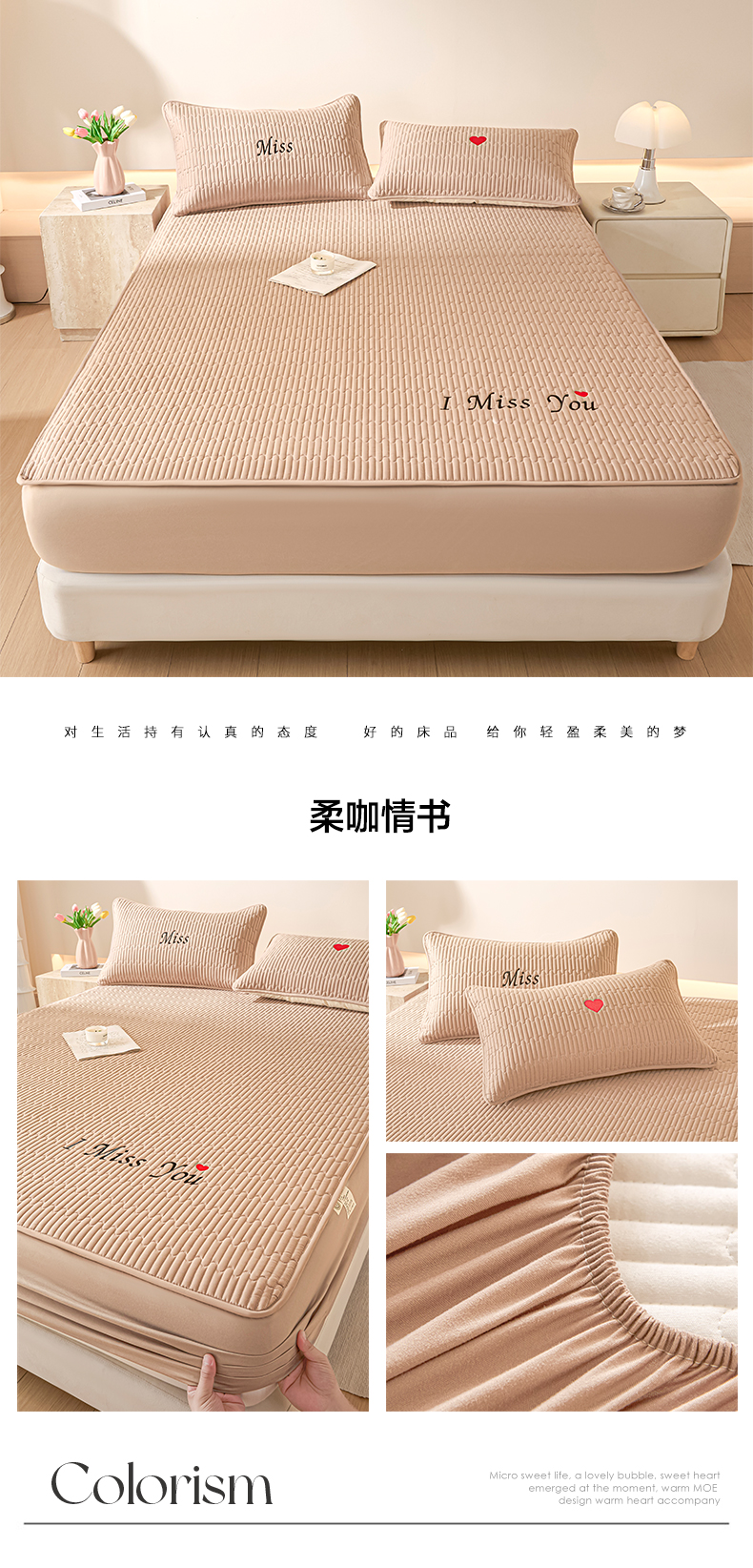 • 91家纺网 家纺一手货源 找家纺 卡伦家纺 2025新款A类刺绣夹棉床笠情书系列 柔咖情书