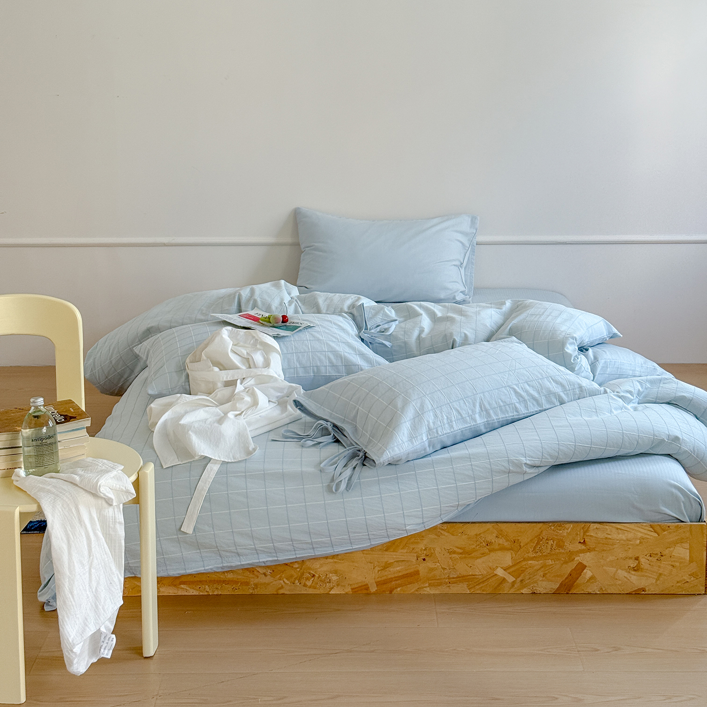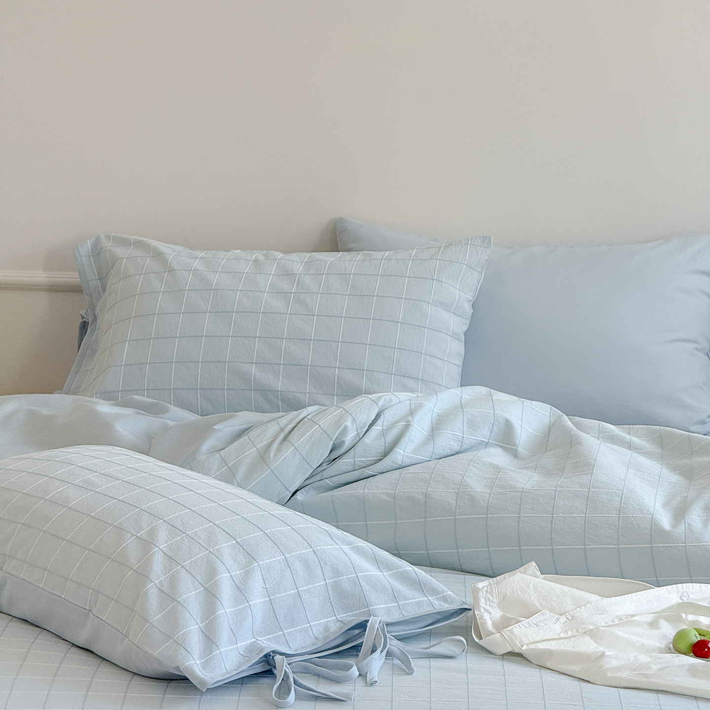 (总)小春日和 2025新款全棉提花条纹四件套纯棉人字纹水洗提花绑带款四件套民宿四件套纯色床单1.8床笠简约被套,云漫