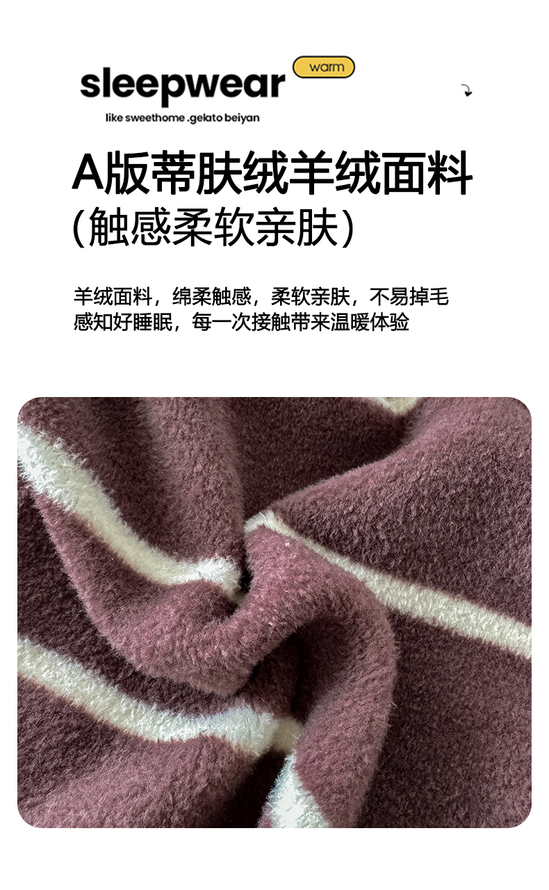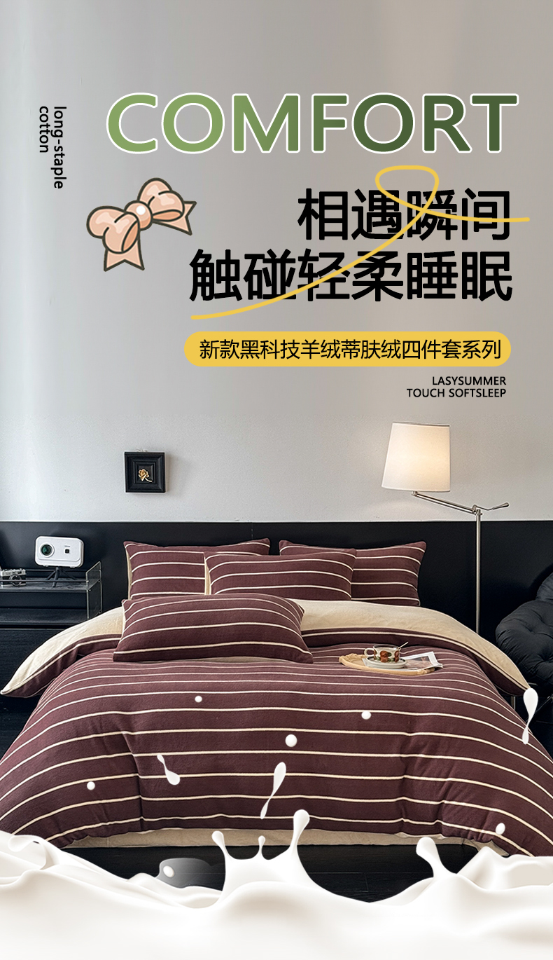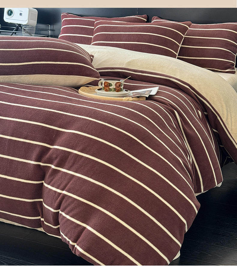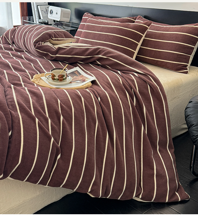 商品名称:子曰 2025新款A类高克重蒂肤绒羊绒保暖印花四件套 紫条纹-浅米