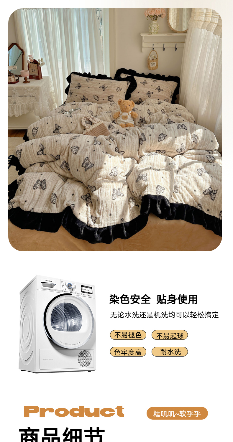商品名称:十里居 2025新款烂花牛奶绒花边款四件套 黑蝴蝶-咖