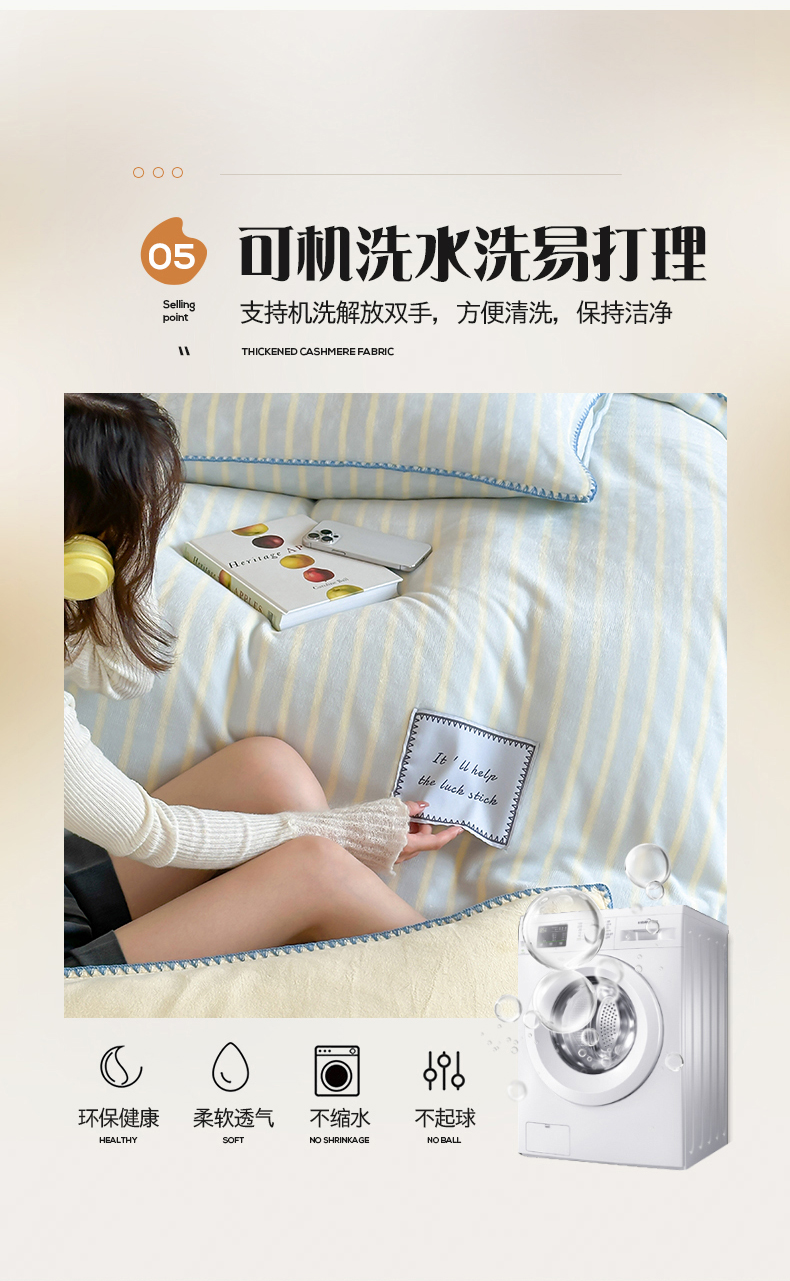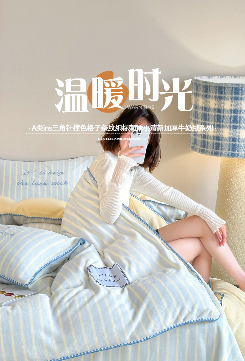 桃子家居 2025新款A类ins三角针撞色格子条纹织标高级刺绣小清新加厚牛奶绒系列四件套 组合图仅供展示