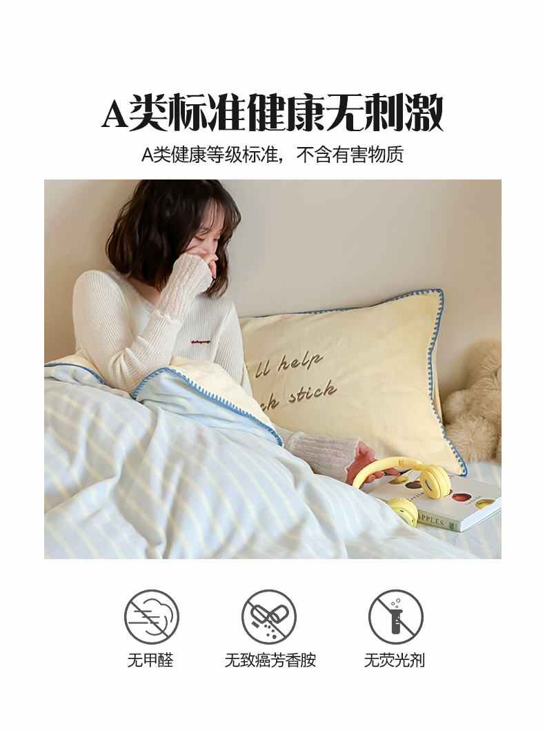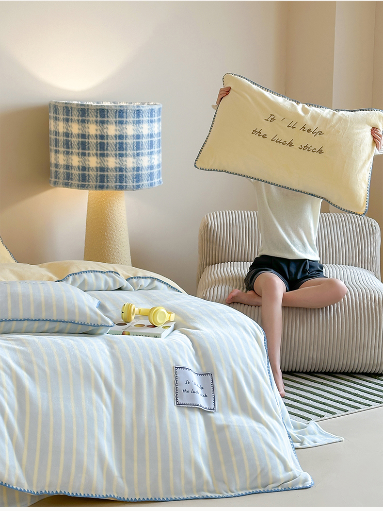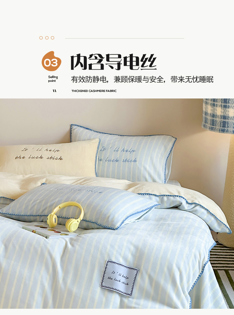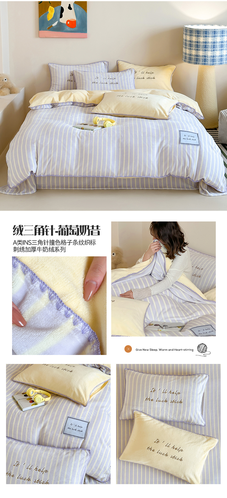 商品名称:桃子家居 2025新款A类ins三角针撞色格子条纹织标高级刺绣小清新加厚牛奶绒系列四件套 组合图仅供展示