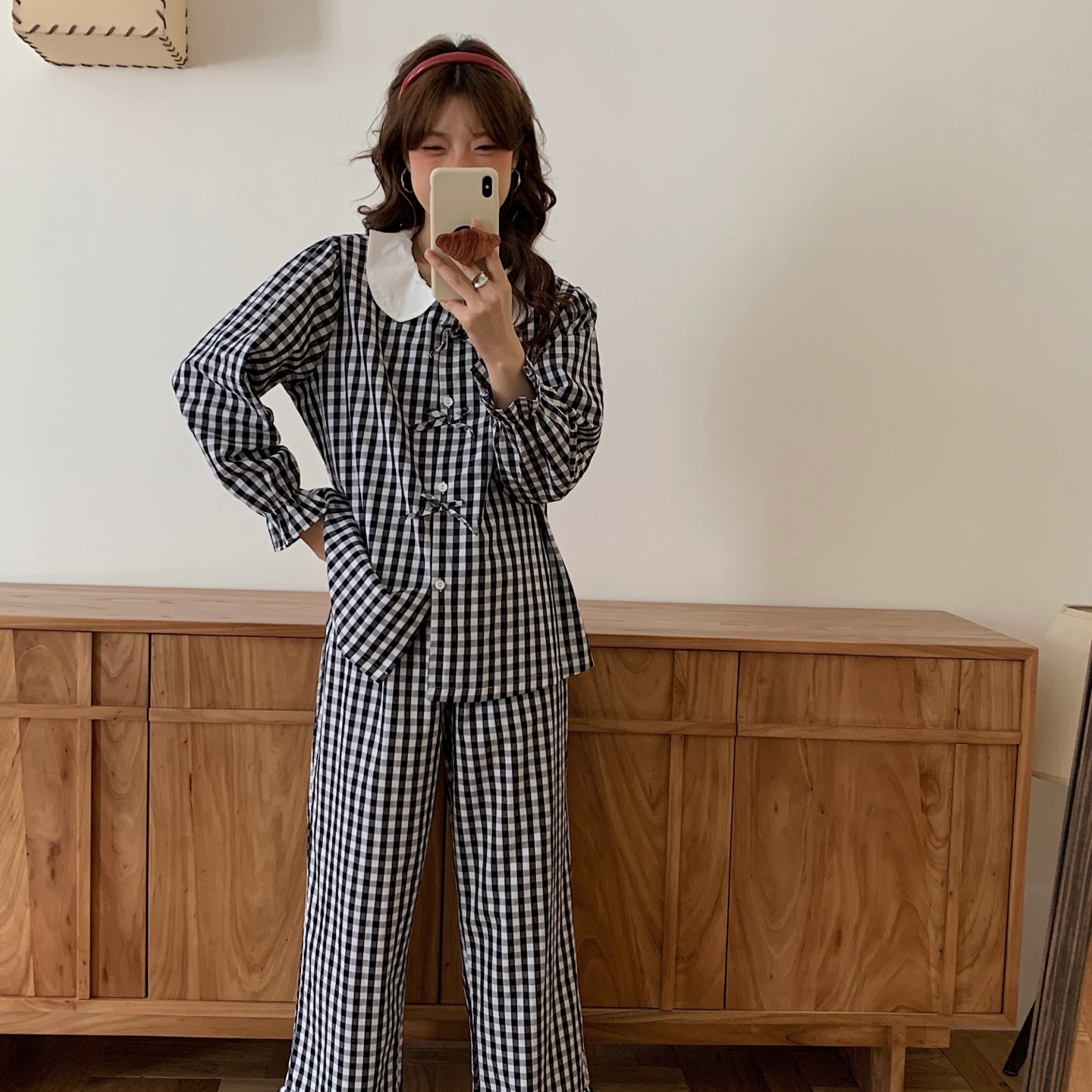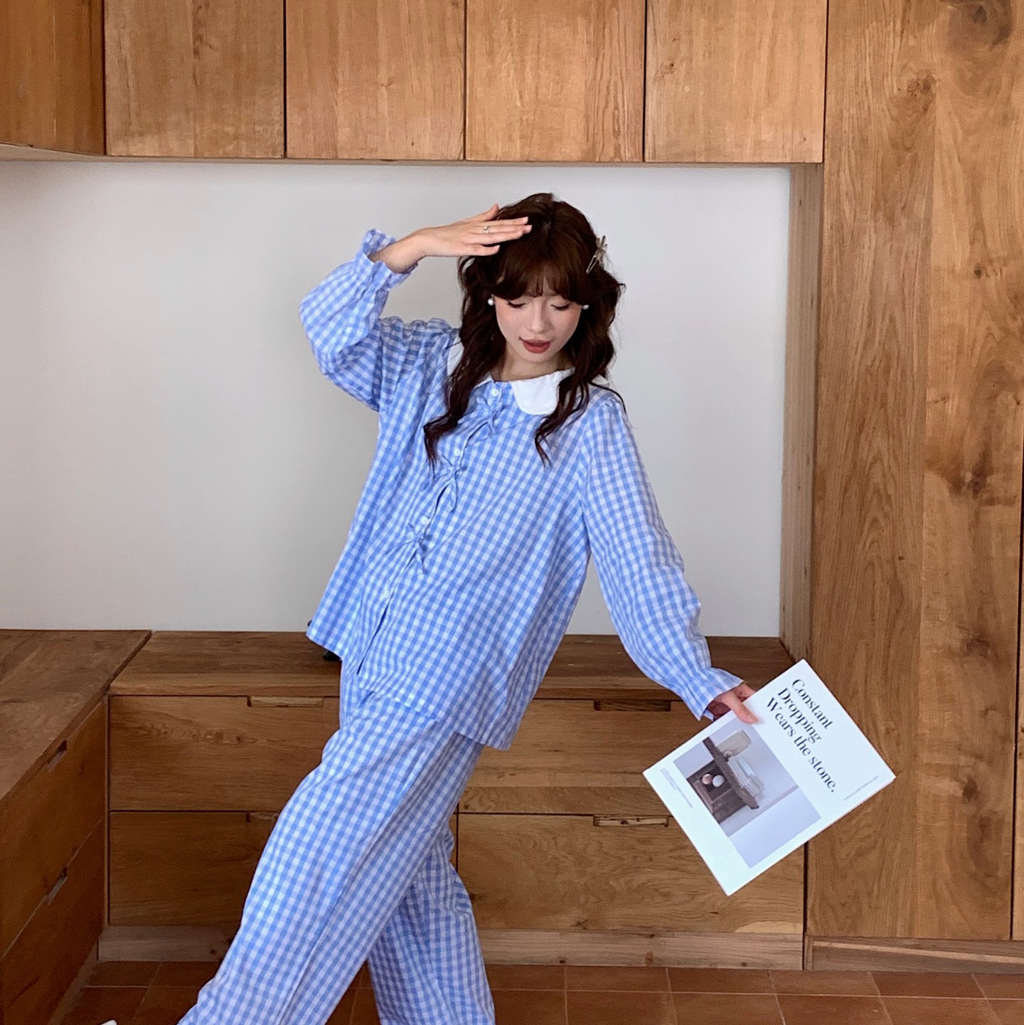 商品名称:妍景家居生活馆 2025新款韩系全棉纯棉娃娃领格子蝴蝶结套装 蓝色