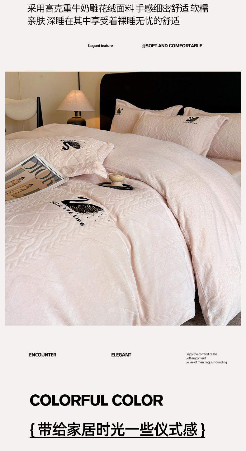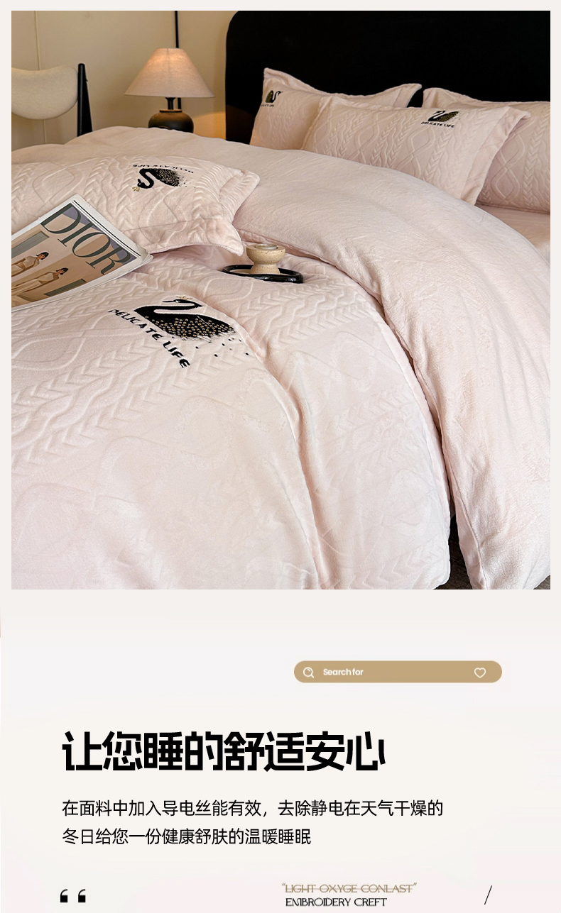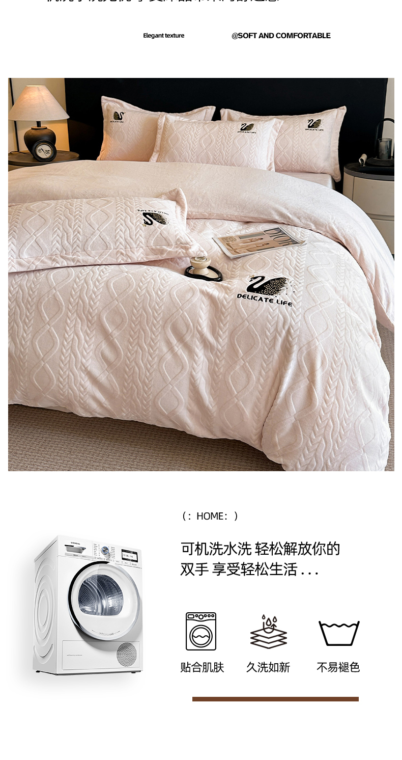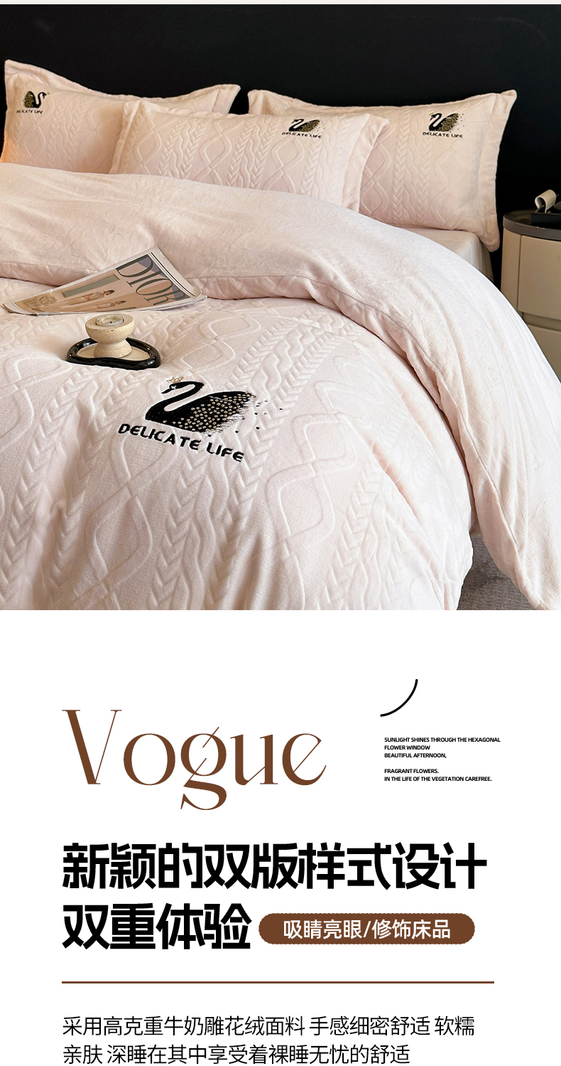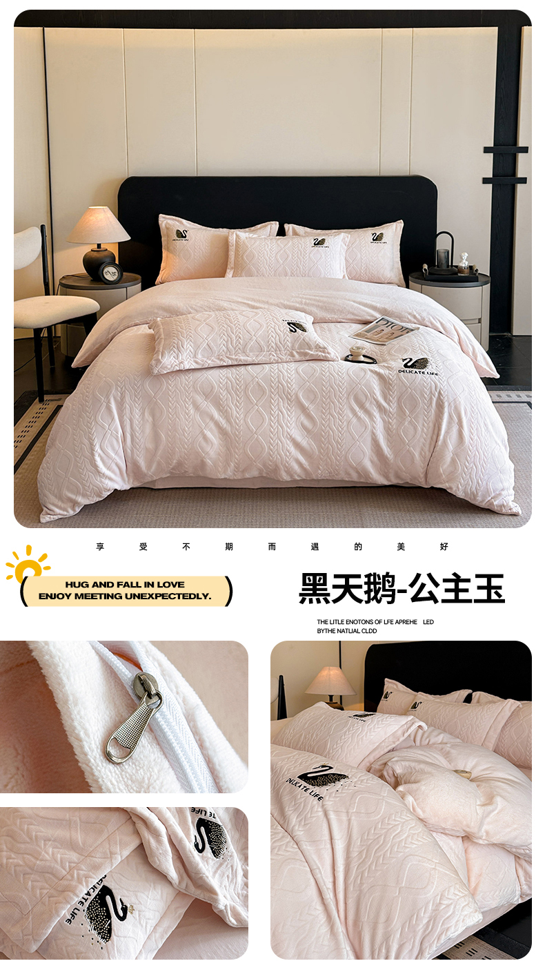 当前位置: 91家纺网 > 商品网购 > 床品套件 > 四件套 > 牛奶绒四件套 > 爱家(原缔乐家纺) 2025新款A类牛奶雕花绒四件套 保罗-黑天鹅系列 黑天鹅-公主玉