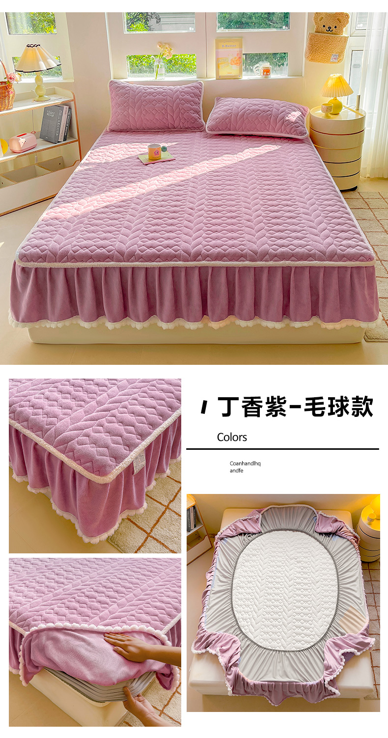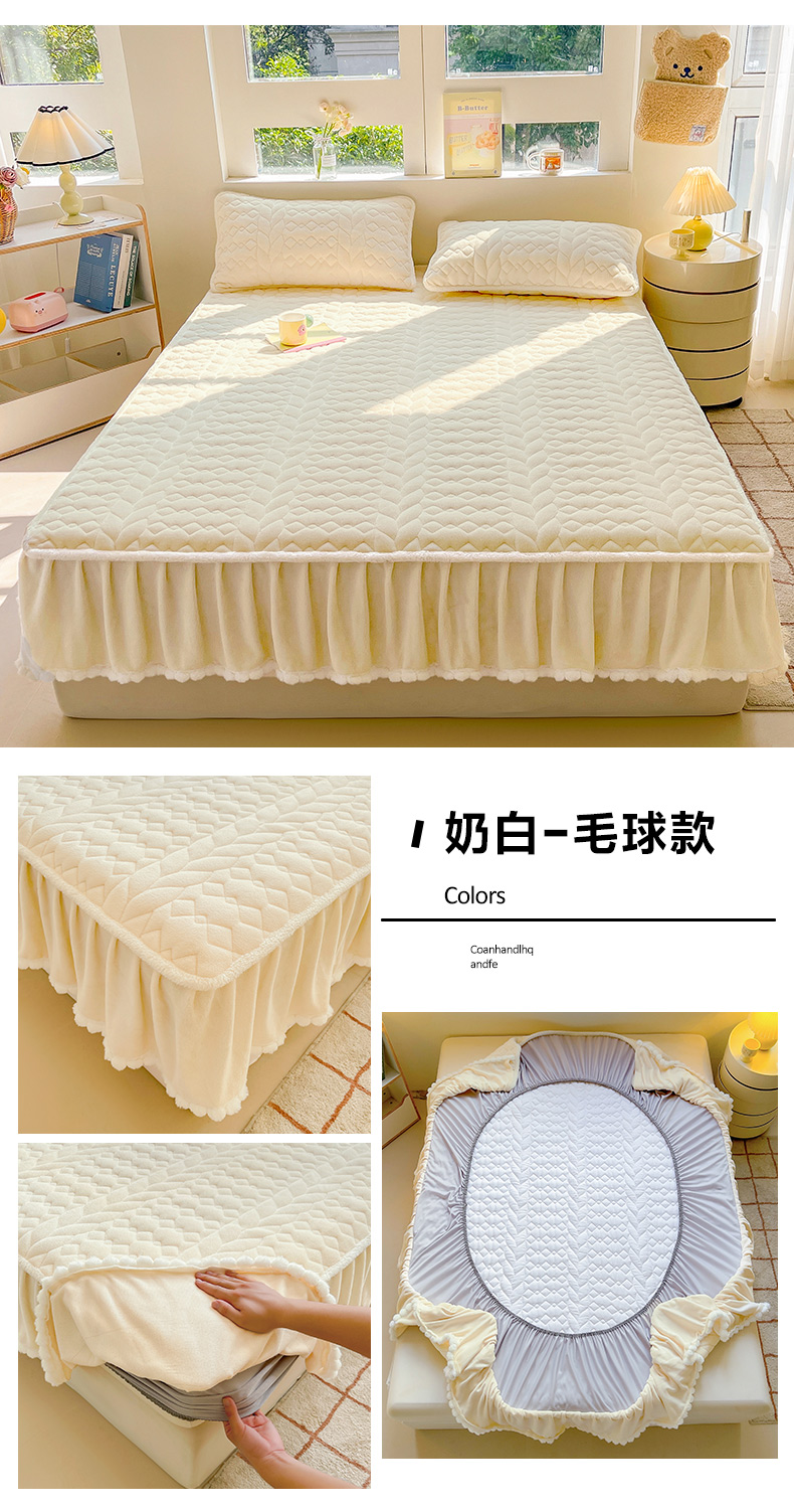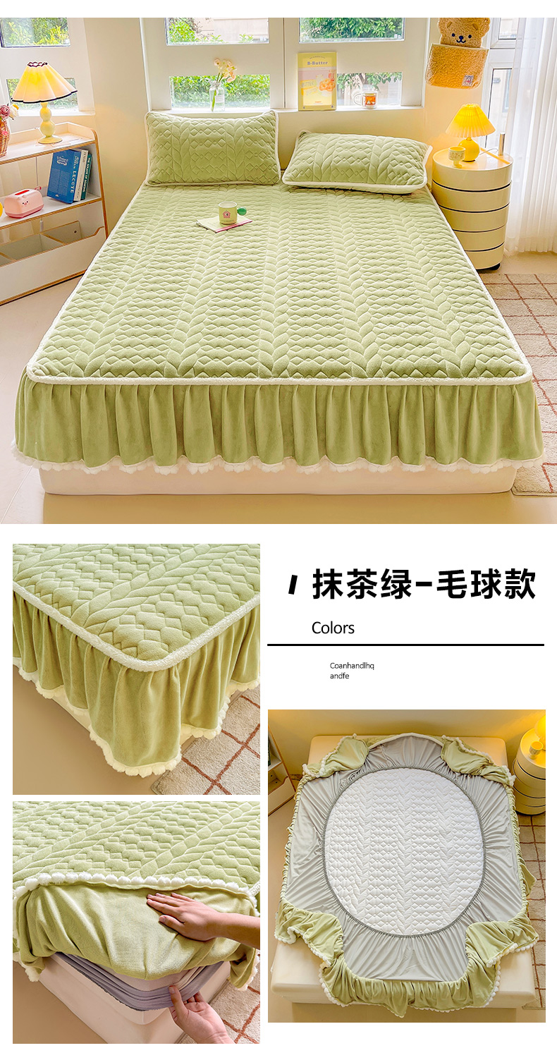• 91家纺网 家纺一手货源 找家纺 眠势力 2025新款牛奶绒床笠夹棉加厚保暖床垫保护套韩版床裙床笠二合一毛球球带裙边款 抹茶绿-毛球款