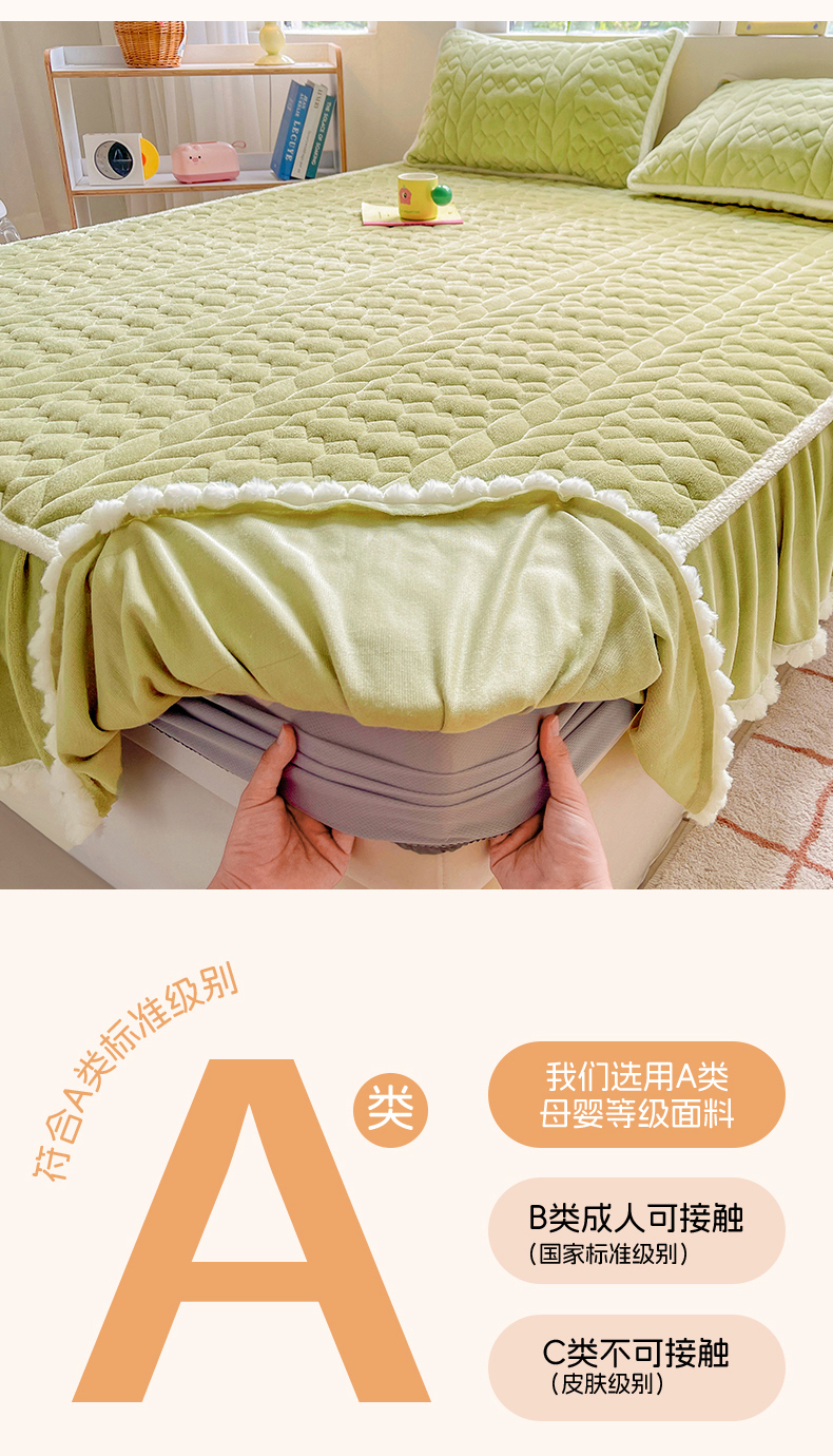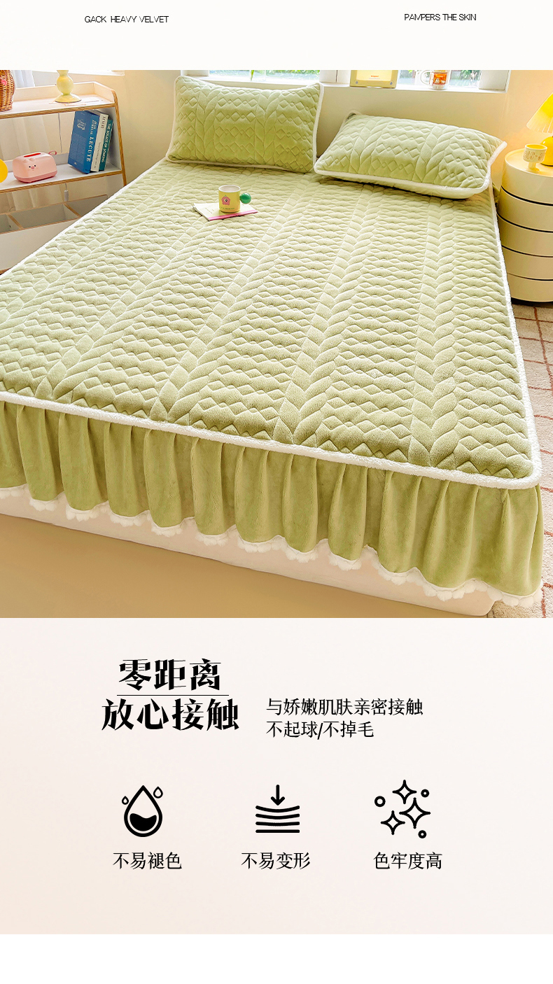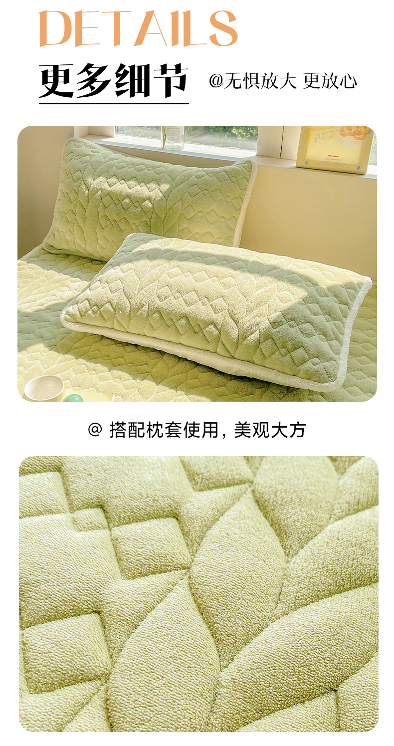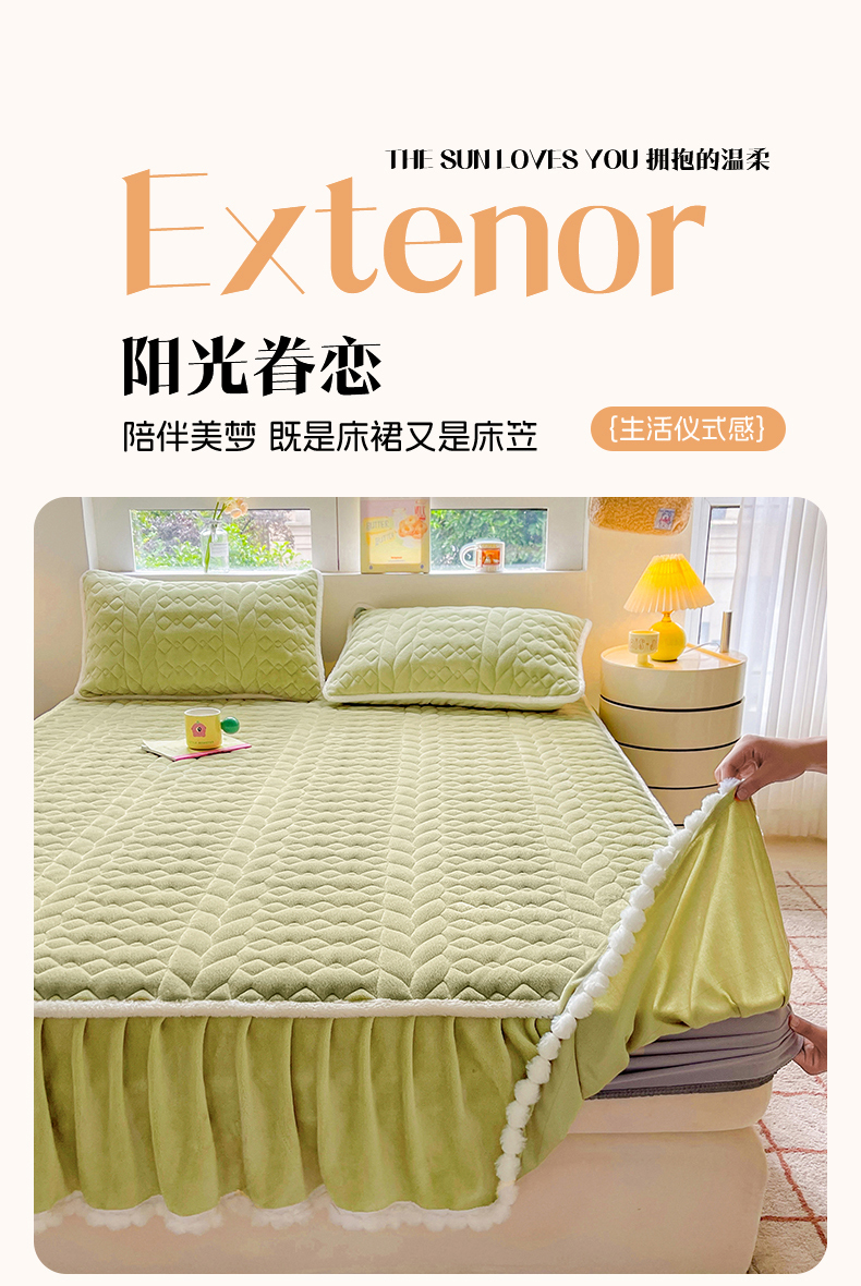 • 91家纺网 家纺一手货源 找家纺 眠势力 2025新款牛奶绒床笠夹棉加厚保暖床垫保护套韩版床裙床笠二合一毛球球带裙边款 抹茶绿-毛球款