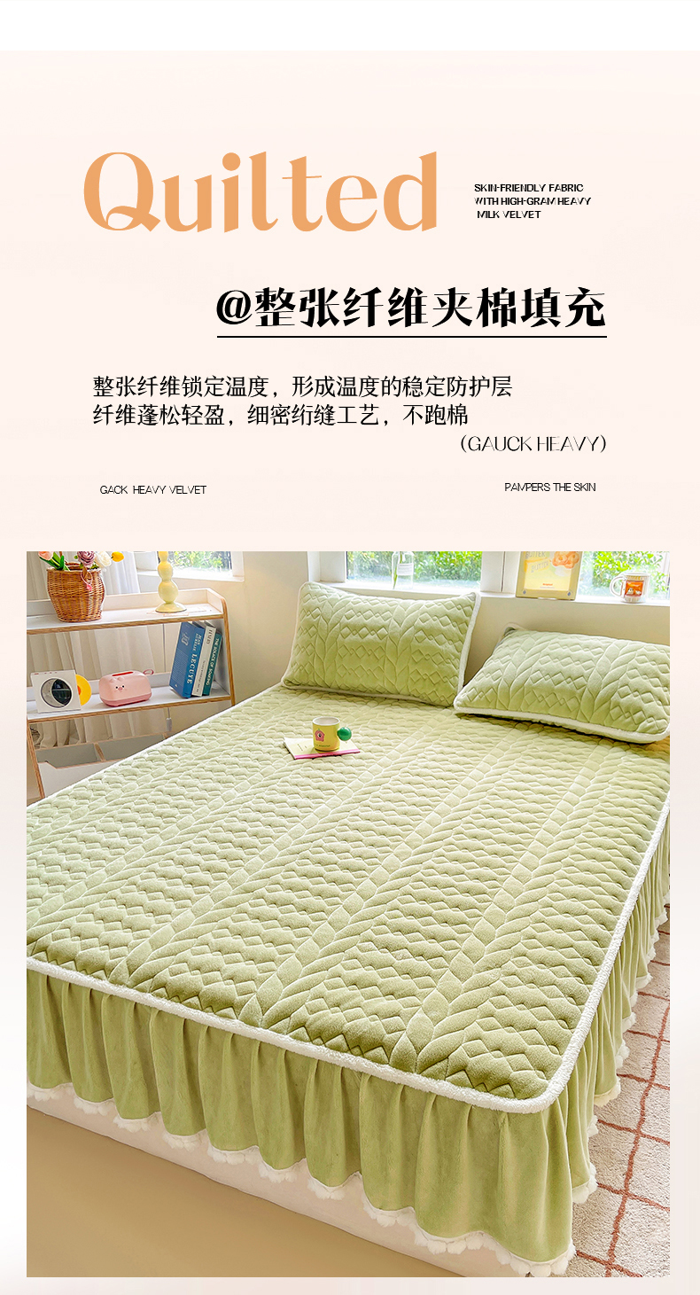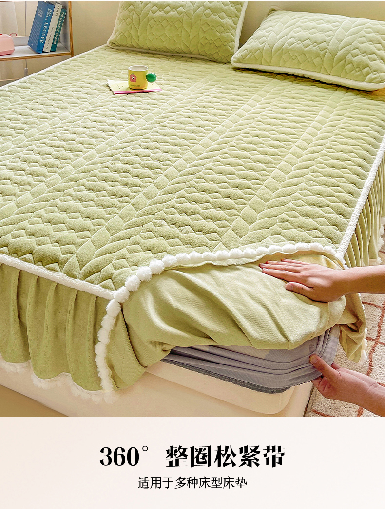 眠势力 2025新款牛奶绒床笠夹棉加厚保暖床垫保护套韩版床裙床笠二合一毛球球带裙边款 抹茶绿-毛球款