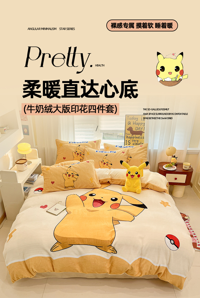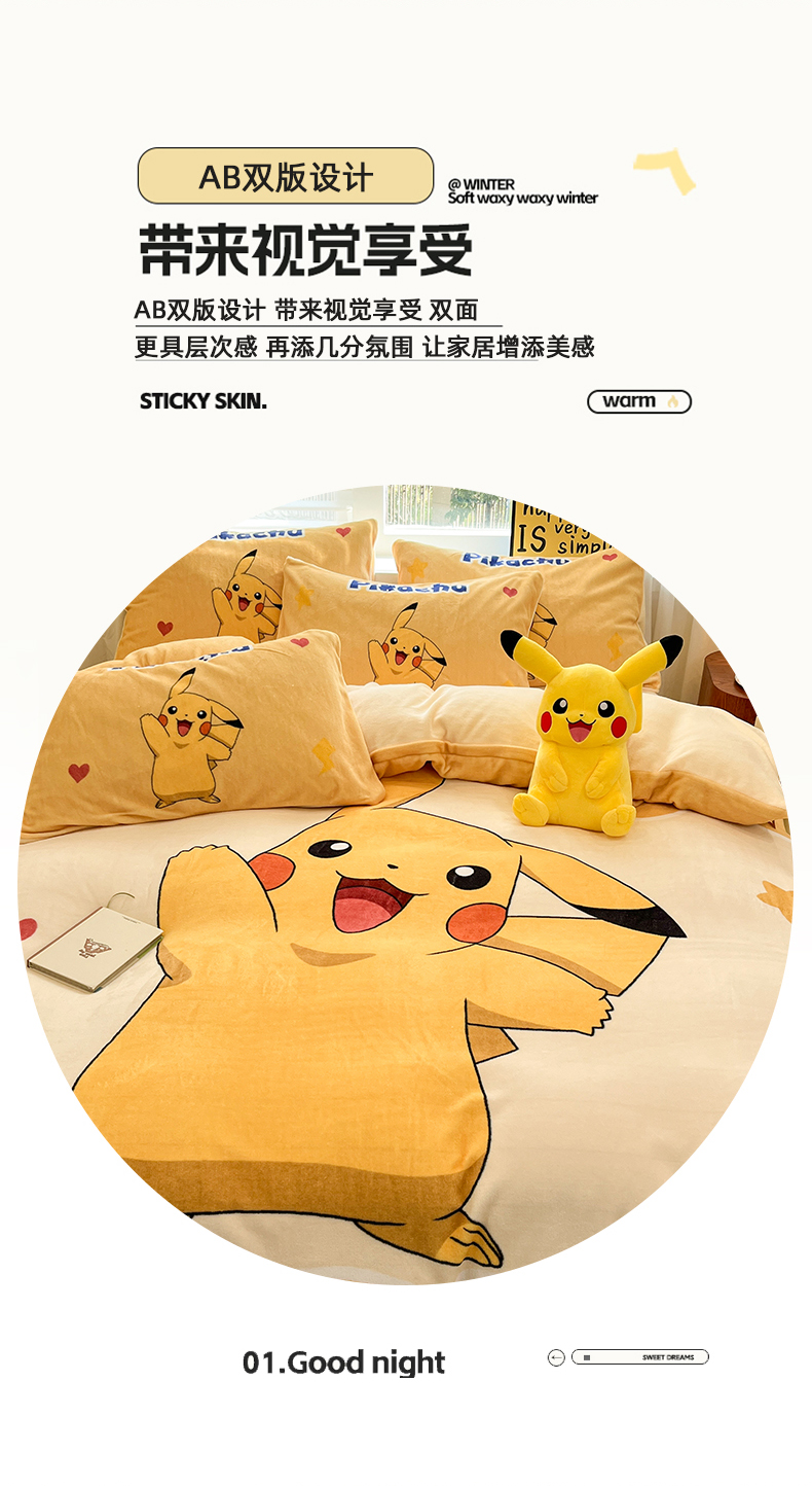 当前位置: 91家纺网 > 商品网购 > 床品套件 > 四件套 > 牛奶绒四件套 > 金爱家 2025新品大版卡通平网数码印花加厚高克重牛奶绒皮卡丘系列四件套 绒小板-宝贝皮卡丘