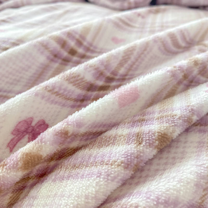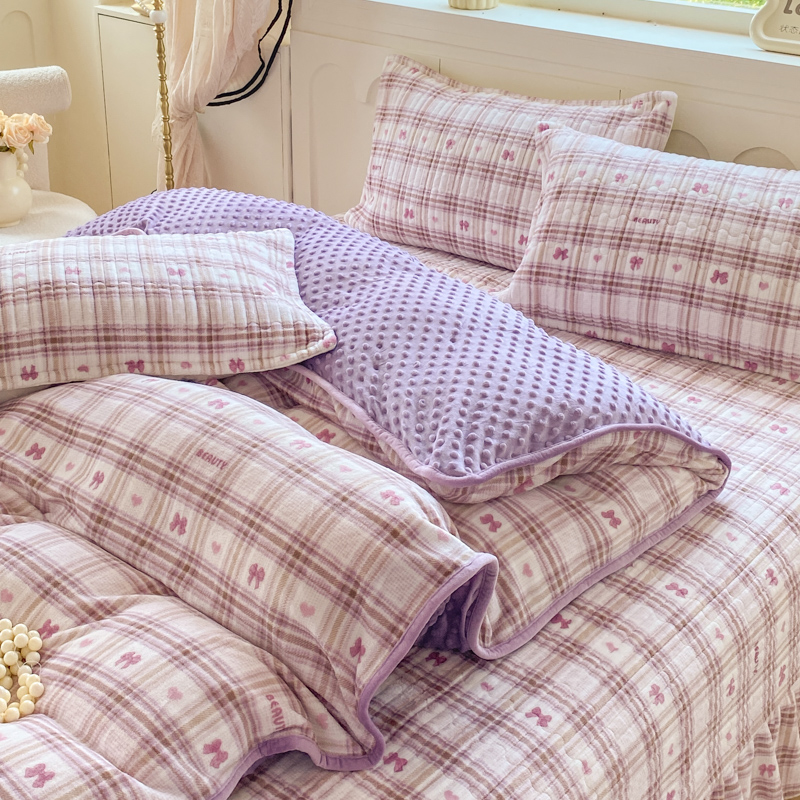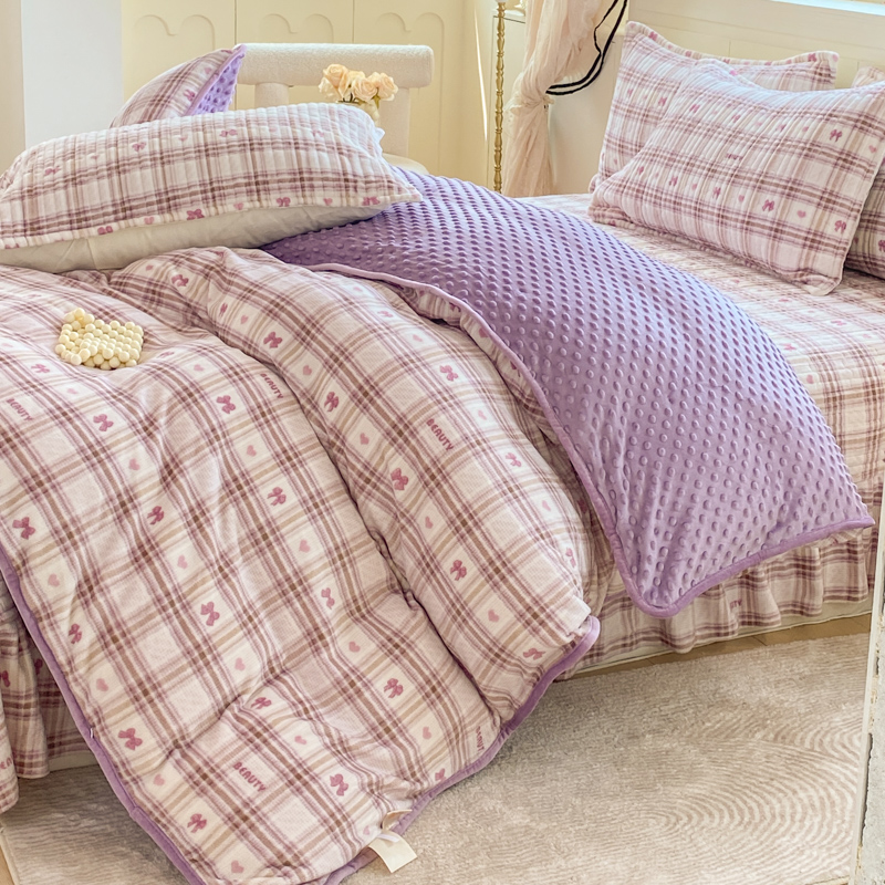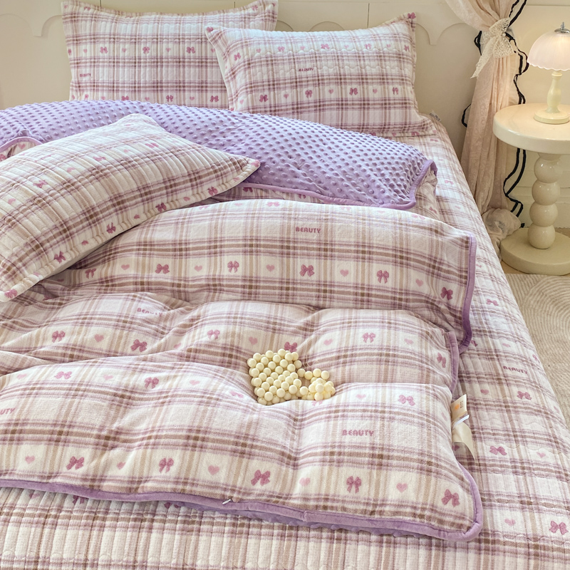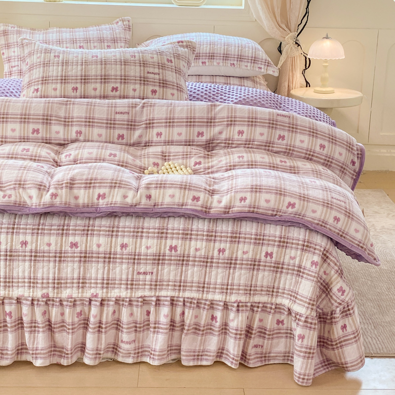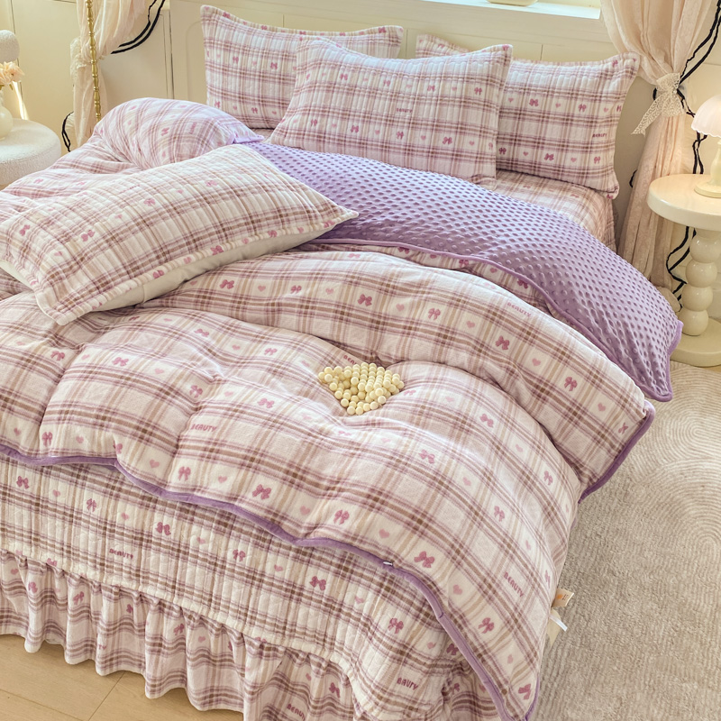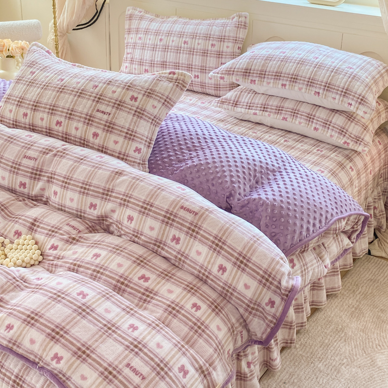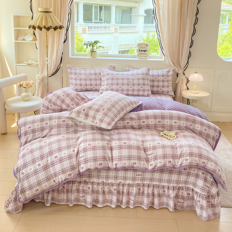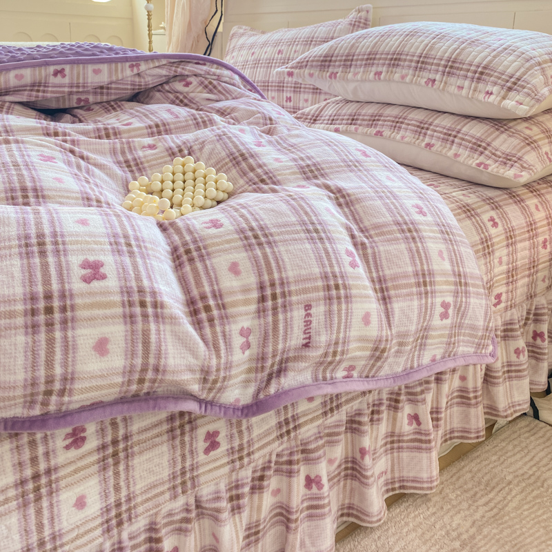 商品名称:尚美 2025新款豆豆绒牛奶绒大花边床盖四件套(床盖花边随机) 格子蝴蝶梦